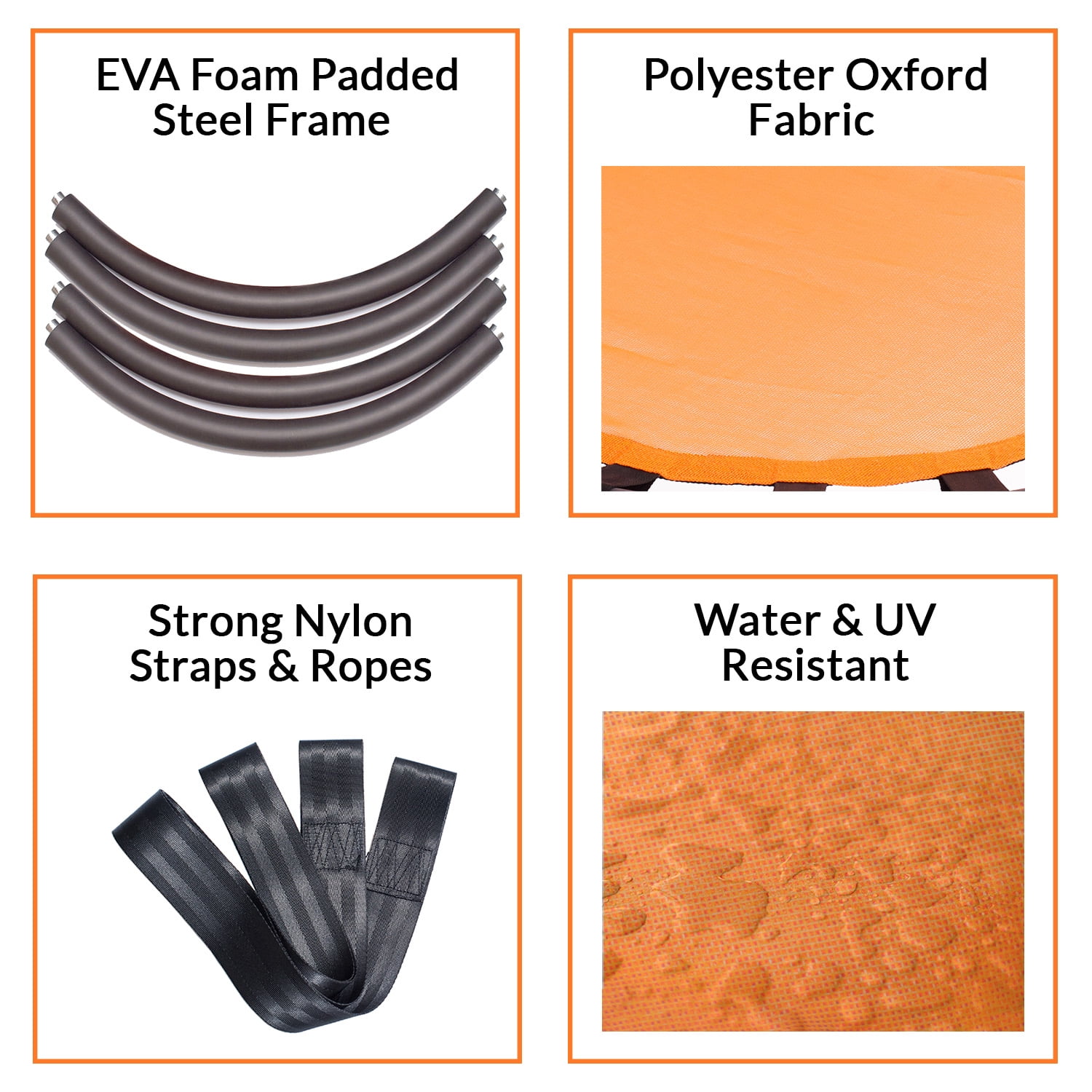 Swing your way into the season! The swing is made with a metal frame that is securely encased in soft impact absorbing foam for safety and comfort. This swing is resilient and resistant to all types of weather. The bouncy teslin cloth seat is an updated design to traditional swings and provides a fun way to get your blood pumping. Bring this bouncy Swing to your next backyard party, it’s sure to be a hit with kids and adults alike. Collapsible design is convenient when going to the park, party, or relatives house and for storing during the rainy season. Features X-large diameter 600 lbs rating holds several kids at once 360º SWIVEL HOOK – Reduces rope twists and turns Adjustable 6′ Foot Swing Ropes Collapsible for easy transport and storage Easy Assembly Clips and tree straps included Specifications Product Dimensions: 40″(Diameter) Max Rope Length: 71″ Metal frame thickness: 2″ Weight: 8 lbs. Most of our items have a picture and/or description of the contents on the box. Please email us if you would like for us to cover it.