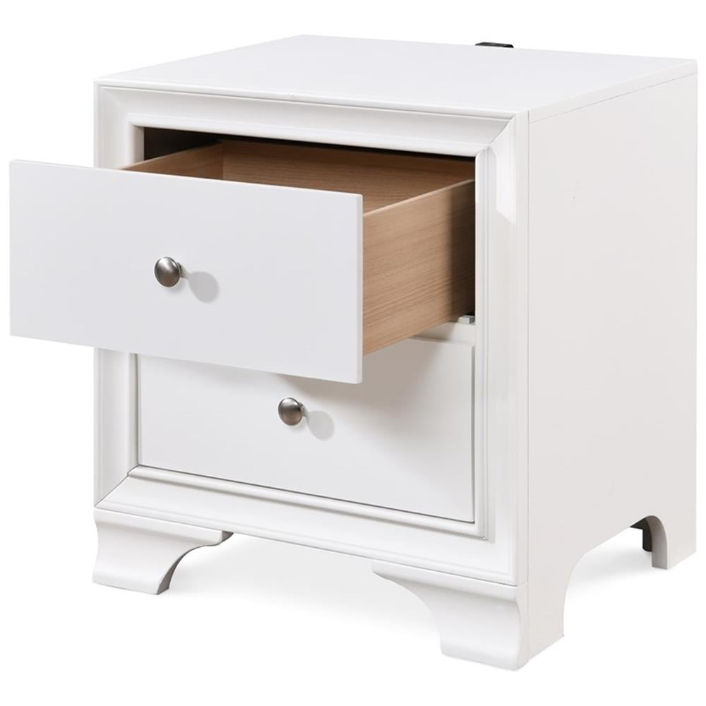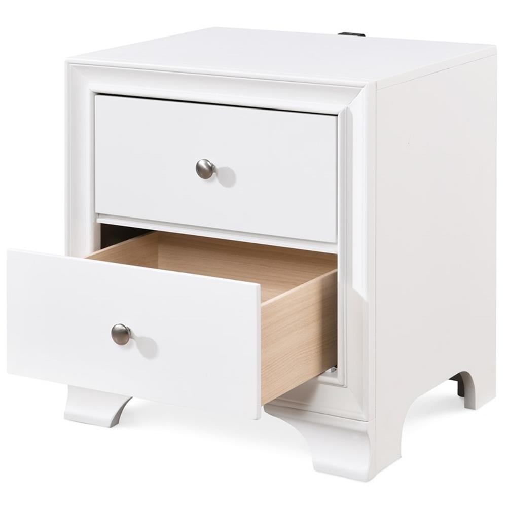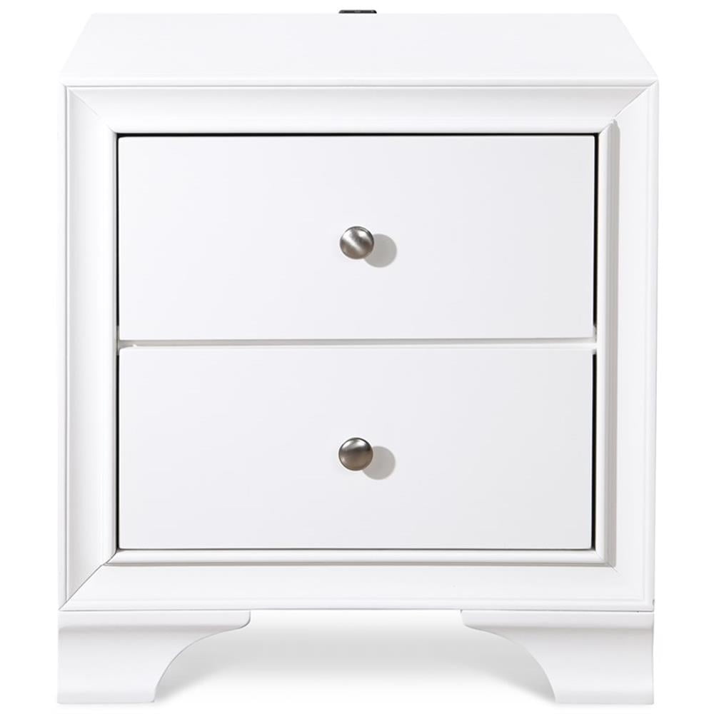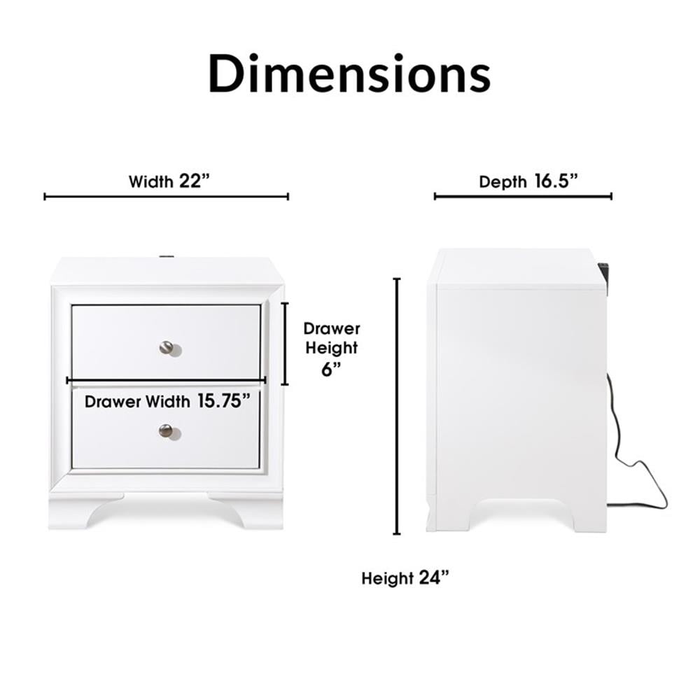 Add convenient bedside storage to your bedroom space with this double drawer nightstand. The small profile of this accent table makes it a good option for a guest bedroom, and while being small in stature, the nightstand provides spacious storage with two roomy drawers. This table has a modern feature in its traditional design style with the addition of a built in USB port that allows you to keep your small electronics charged while you sleep. This piece is available in your choice of neutral shades to complement many bedroom design style. Features: Convenient spot in your bedroom for an alarm clock and additional storage Compact size is good for placement in a small bedroom Features two roomy drawers for plenty of storage USB plug-in on the back to keep your cell phone or tablet charged Arrives fully assembled, just attach the USB port Specifications: Weight Capacity: Weight Capacity: 40 lbs