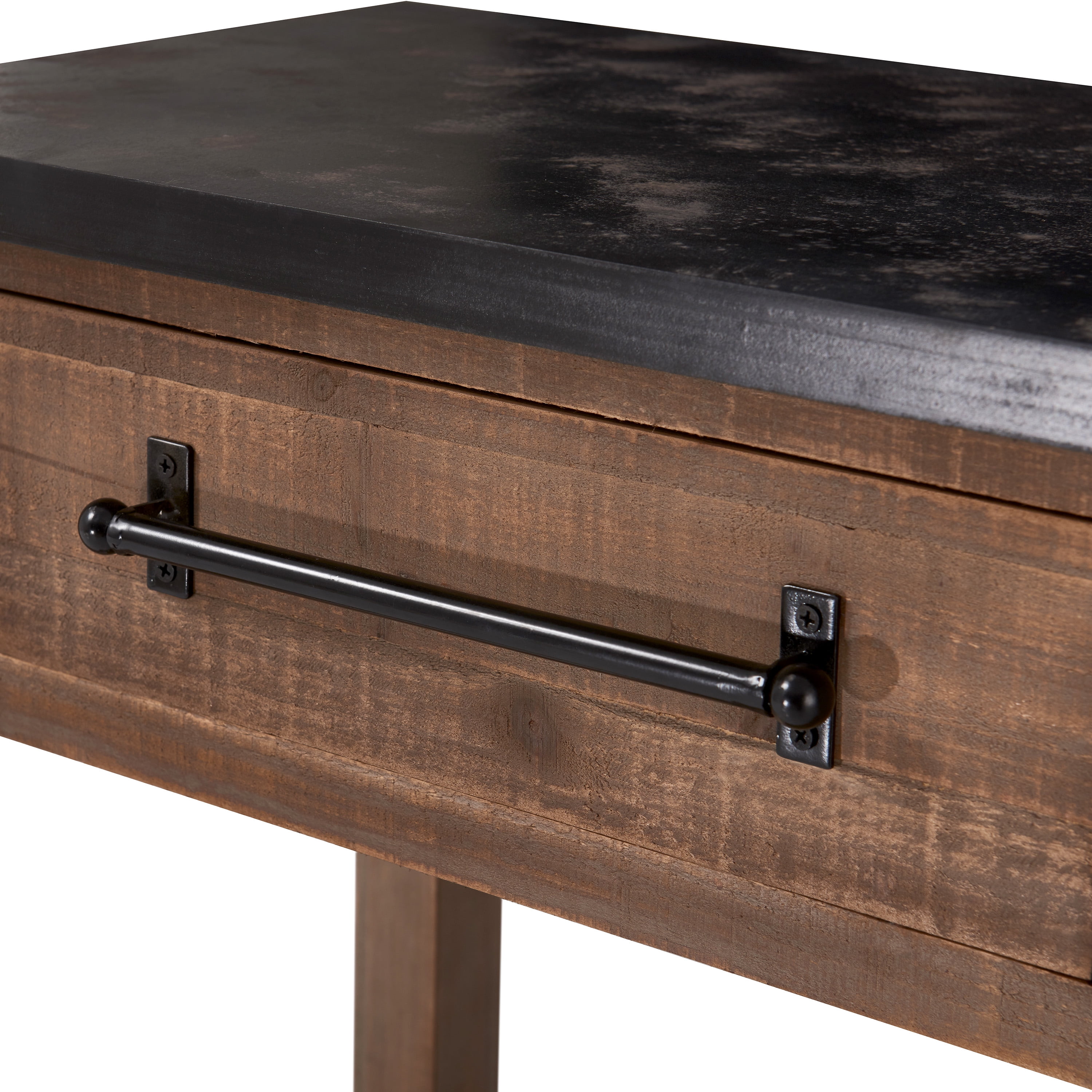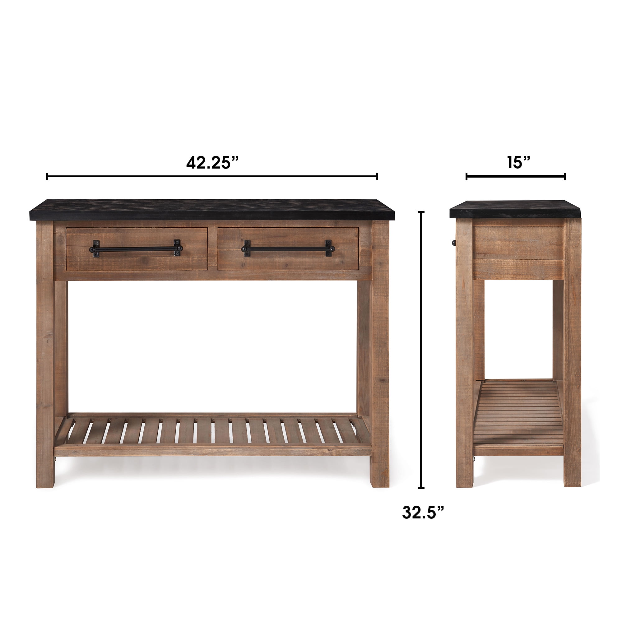 Compact but versatile console table is a convenient addition to any entranceway or hallway Two drawers and lower shelf offer plenty of storage Modern farmhouse details include sturdy black metal hardware Rustic distressed finishes makes each piece unique Easy assembly required