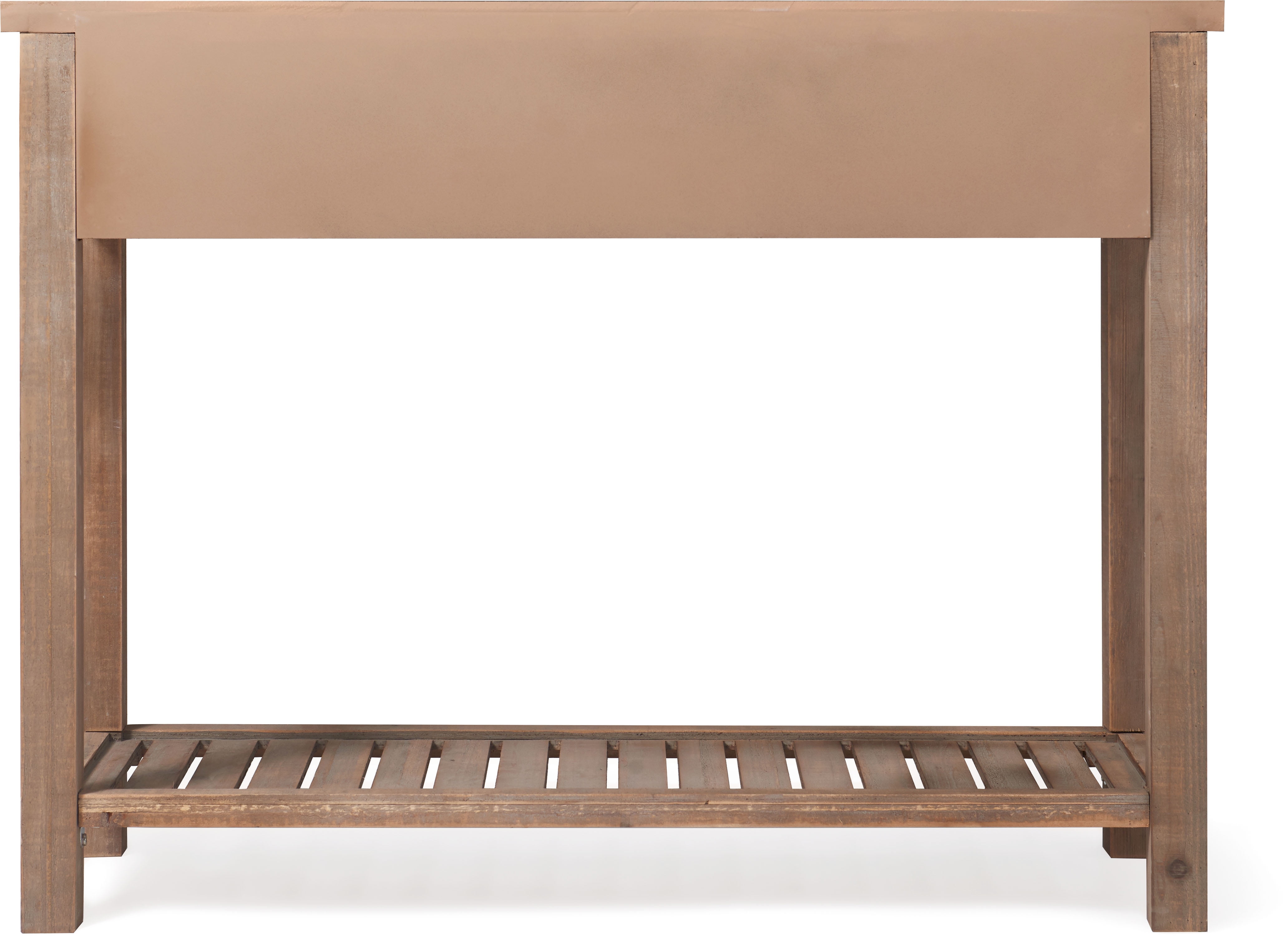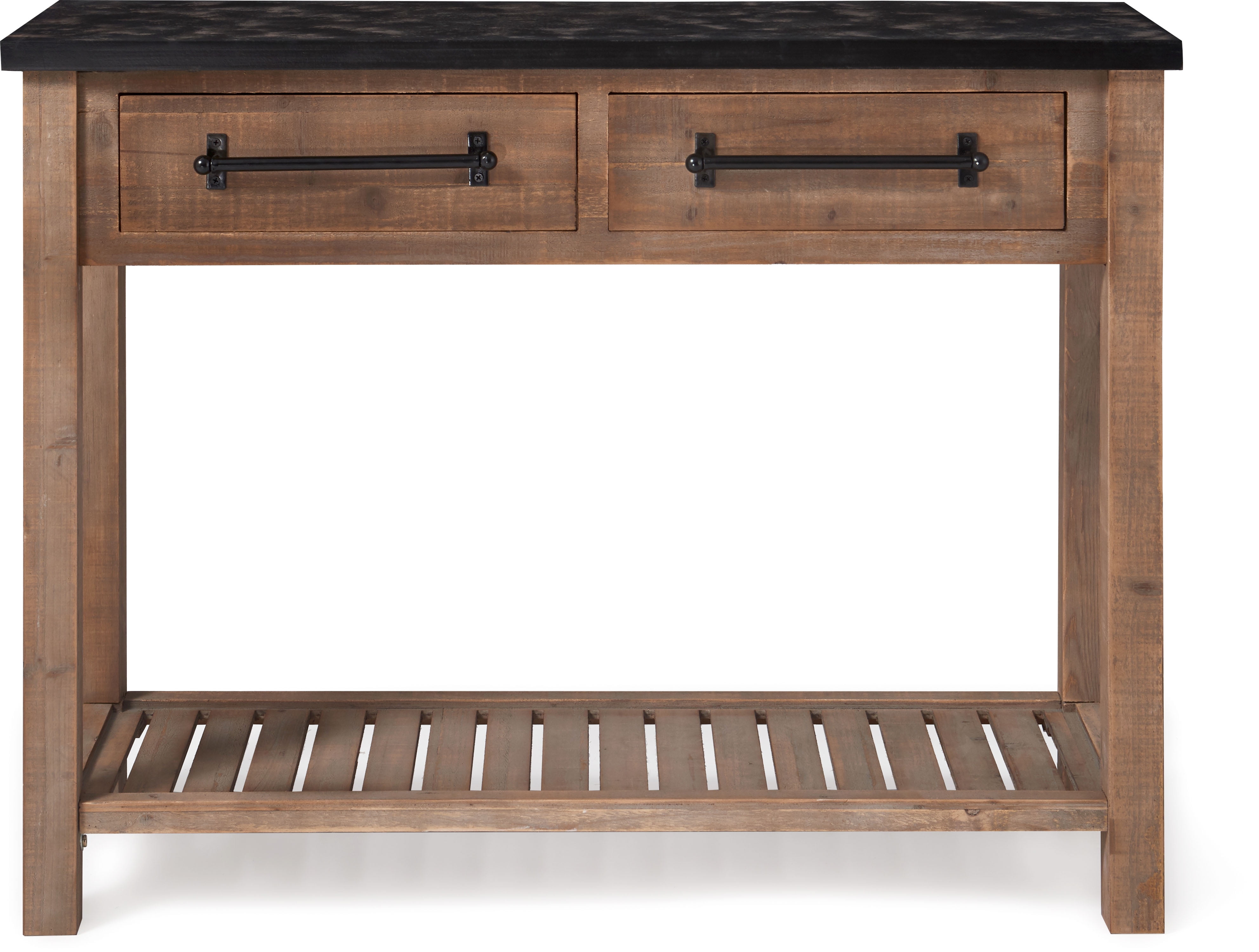 Whether used as a sideboard in your dining room or as an elegant display surface in a living room, this console table is a striking accent piece. The handsome traditional styling adds a modern farmhouse touch to your decor. Its distressed finish adds charm and character to any room. The craftmanship of the handsome straight wood legs add to the overall appeal. Enjoy its practical yet attractive low-maintenance distressed wood construction. The straight, black metal drawer pulls add strength and sophistication to this rustic console table. The lower slatted wood shelf adds convenient extra storage space. Features: Compact but versatile console table is a convenient addition to any entranceway or hallway Two drawers and lower shelf offer plenty of storage Modern farmhouse details include sturdy black metal hardware Rustic distressed finishes makes each piece unique Easy assembly required