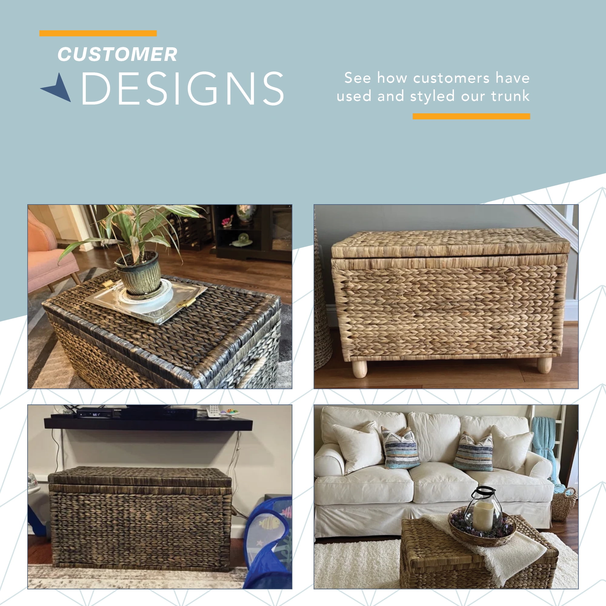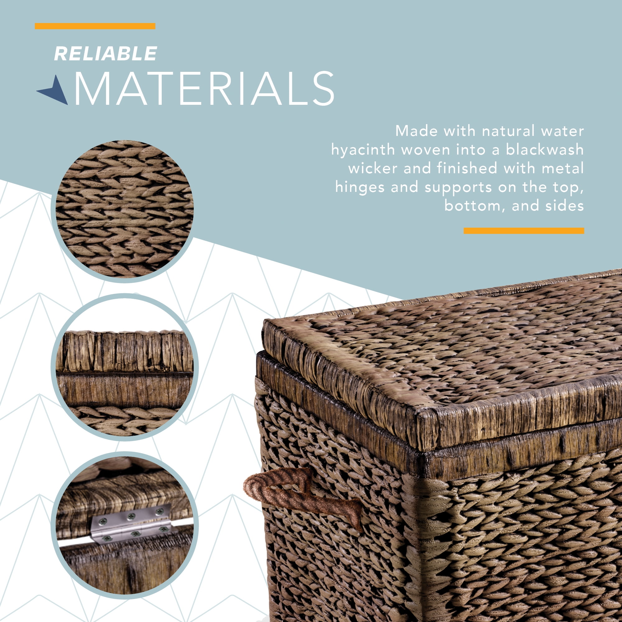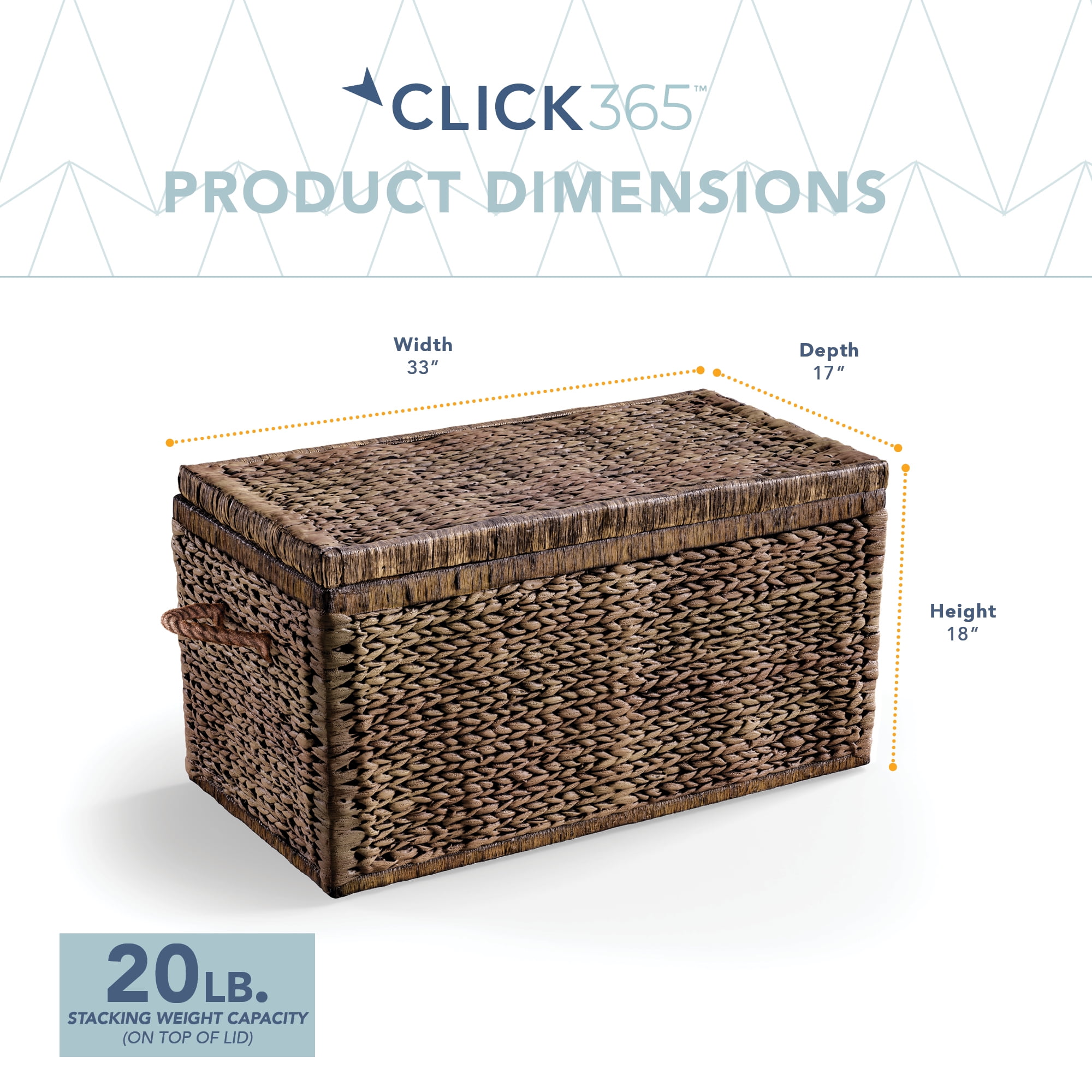 DEEP & SPACIOUS: 33” Long & 18” Deep. Be surprised by how much this trunk can store. Use it to organize or de-clutter. Provides a spacious compartment for organizing clothes, pillows, blankets, beach towels for an organized living space. Or use in bedrooms for books and toys, in the entryway for shoes or in the mudroom for dog toys. VERSATILE & MOBILE: The storage volume and organic look of this trunk make it useful in Bedrooms, Laundries, Hallways or just about any room in the house. With 2 matching woven handles you can easily move this storage basket anywhere you like. STURDY: Lightweight construction with metal framed side and lid support. Double hinged lid with separate hinge to keep lid up. Light items can be stacked on top for better use of space. NATURAL: Hand-woven from Eco friendly and sustainable natural water hyacinth fibers finished in a combination of black, brown, and gray colors. Weave allows contents to stay well-ventilated. As a natural material color variation may occur from photo’s. Not water resistant.