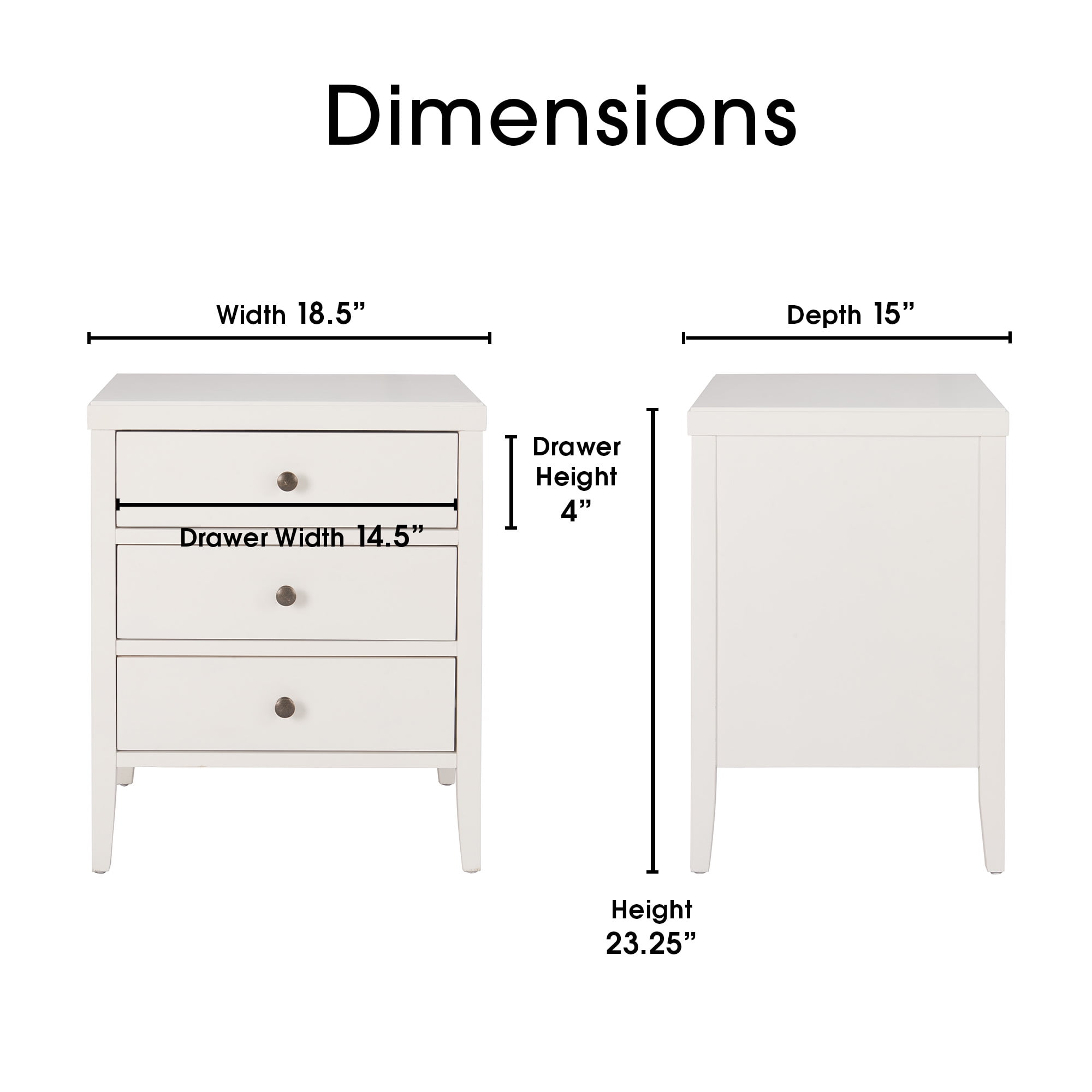 This transitional nightstand features clean lines and functional storage. Boasting a solid wood frame, this nightstand can easily blend into any decor style. Three roomy drawers are perfect for storing books and evening essentials. In either the master suite or a guest bedroom, a nightstand is a foundational piece that you’ll be sure you love. Features: Solid wood nightstand crafted from a sturdy solid frame Three drawers offer ample storage space Clean lines and classic silhouette complement any decor style Round, metal knobs feature an antiqued bronze finish Arrives fully assembled, just attach the drawer knobs Specifications: Weight Capacity: Weight Capacity: 59 lb