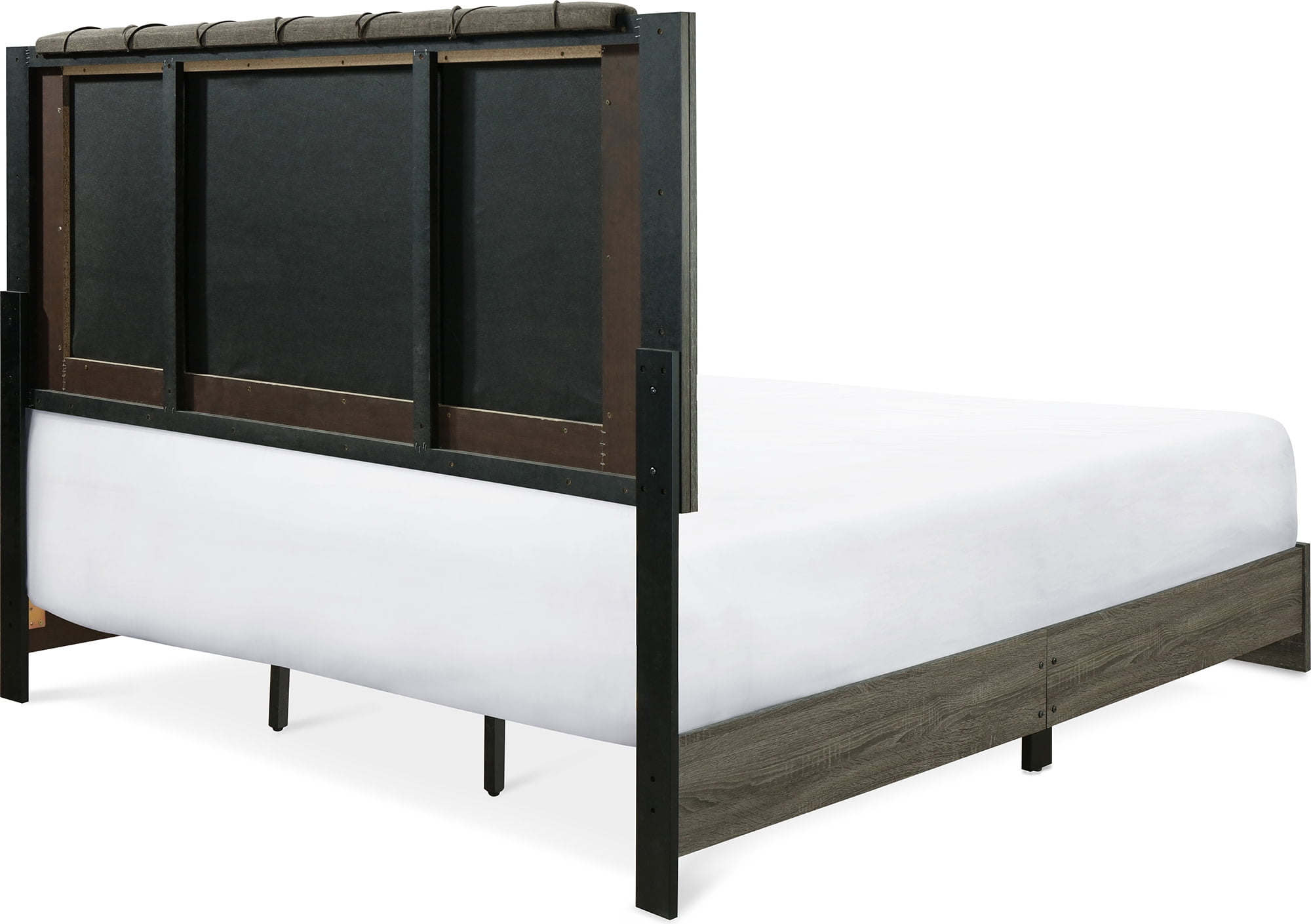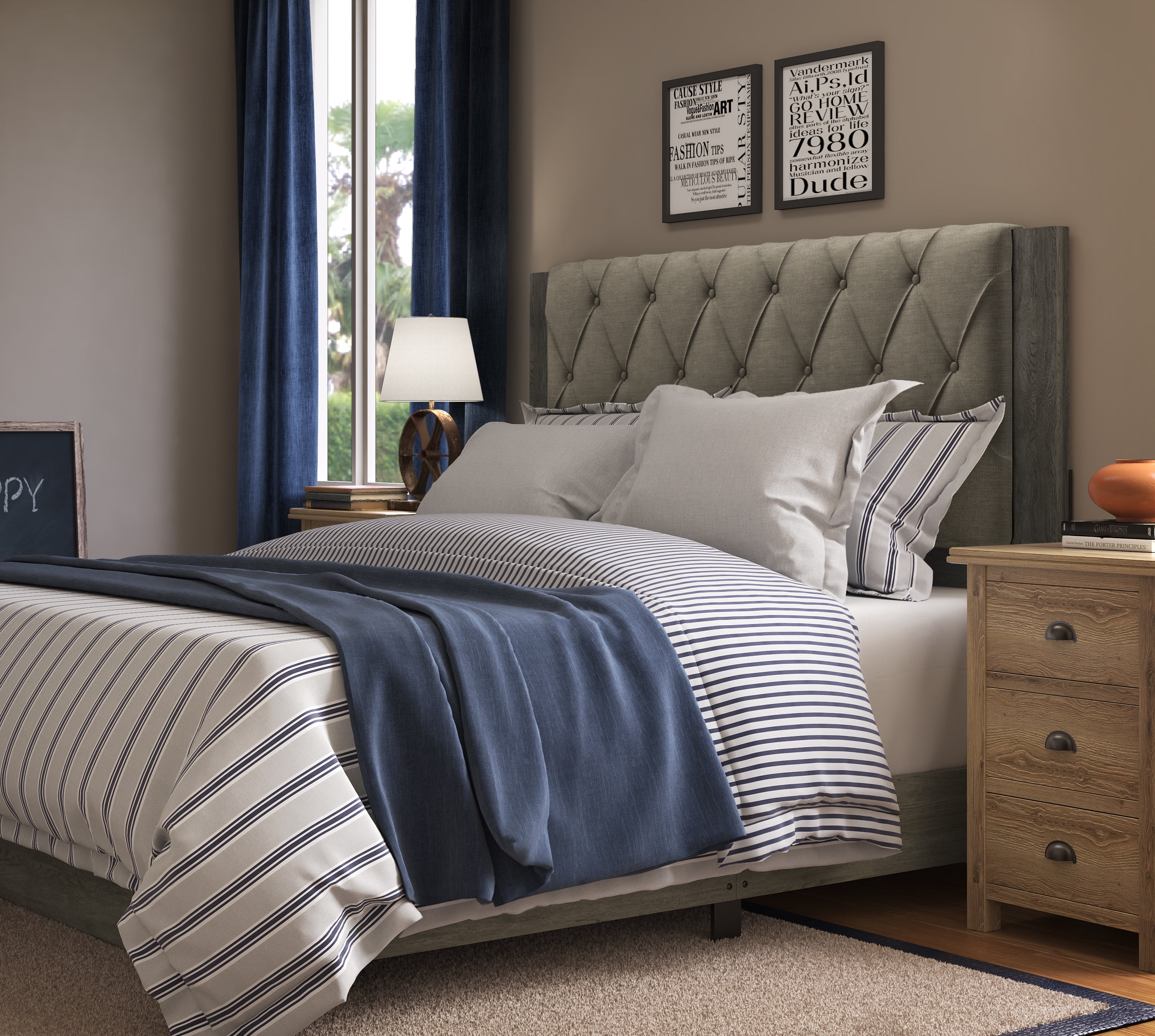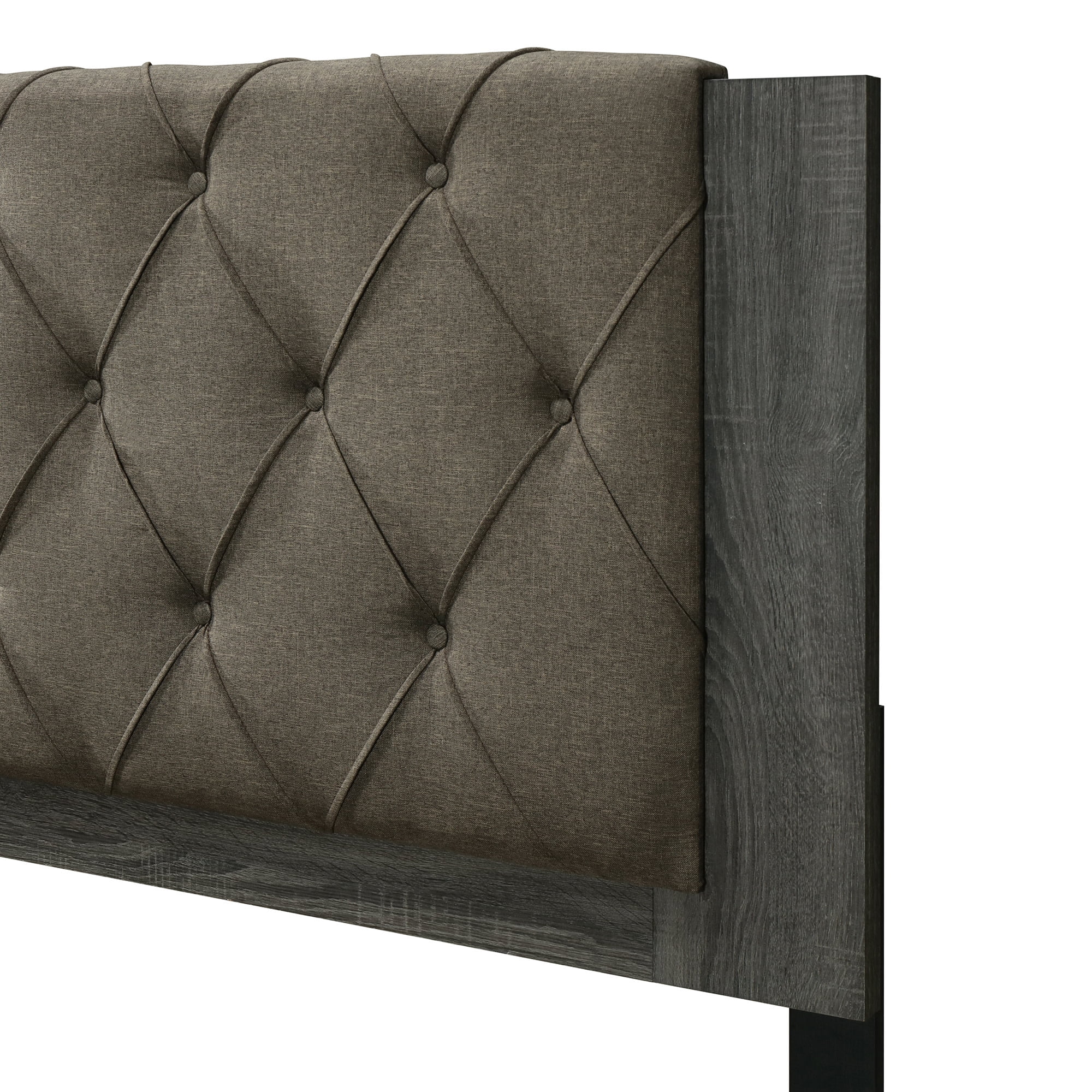 Add an eye catching centerpiece to your bedroom with this beautiful platform bed Featuring a tufted upholstered headboard that adds nice height and comfort Wood frame in a neutral shade that complements the headboard Available in queen and king sizes Easy assembly required with included tools