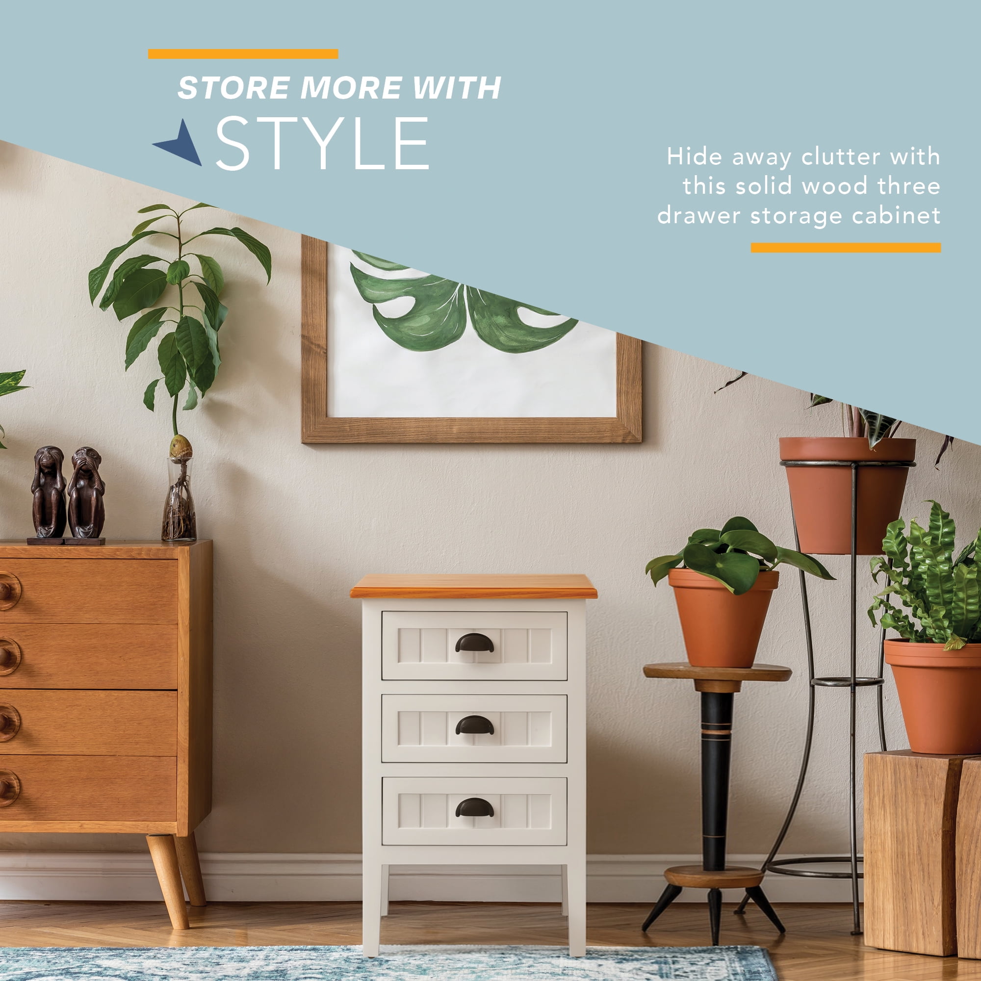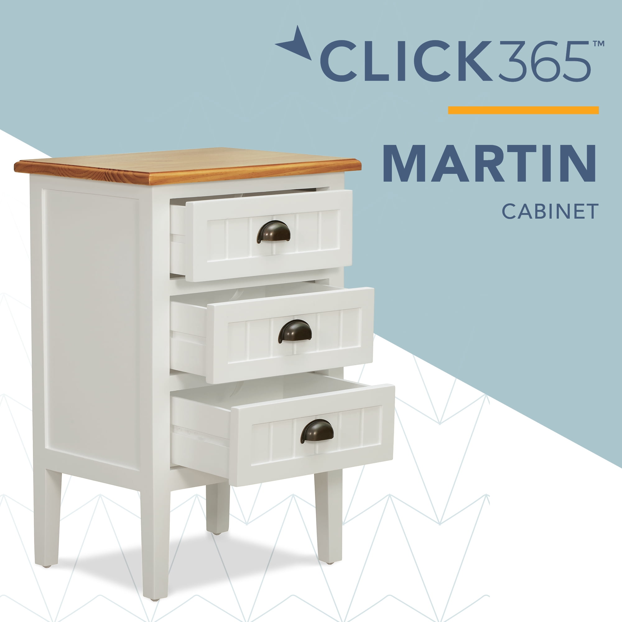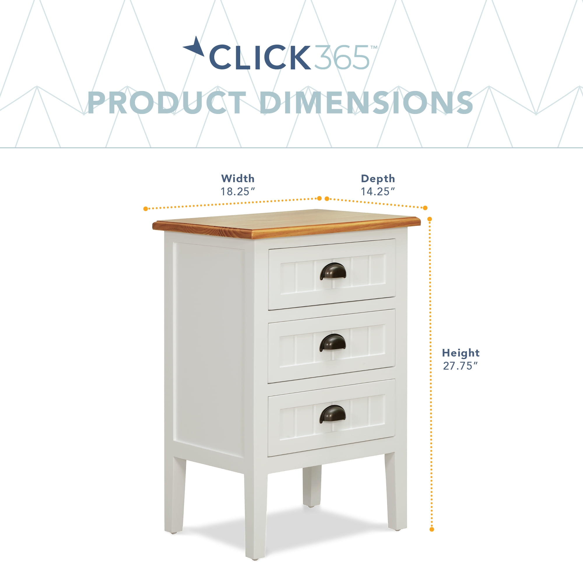 ClickDecor makes products that let you live your best life at home. We’ve assembled a broad range of practical and functional home furnishing solutions that deliver a modern look, with a focus on small space living that won’t break your budget. Our ClickDecor Martin cabinet nightstand offers convenient storage space presented in a bright and simple cottage style with a charming white finish to complement most décor schemes. A rectangular 18″ wide natural Acacia top complements the traditional cottage frame for a timeless look. Natural variations in the wood grain make each piece unique. There’s plenty of space on the wooden top for household goods such as a lamp and framed photos, or for keys, wallets, phones or laptops. Three (3) large 13″ decorated storage drawers with bronze finished half cup shape pull handles provide generous space to organize electronics, reading glasses, magazines, remotes, or chargers. Made of solid wood and tapered legs with padded footers to keep it stable, this end table rests above the floor with enough clearance to vacuum underneath. Whether you’re looking for a side table for the living room, hallway or entryway, or even a dresser to put inside the closet, the simple look, size and versatility of this table will make it a useful and decorative addition to any living area. Features: TRADITIONAL DESIGN: A cottage style frame in a classic white finish, paired with an Acacia wood top Natural wood color and grain, with grooved geometric drawer fronts and dark bronze half moon metal pull handles, and standing on solid tapered legs provide a simple but charming look. SPACIOUS STORAGE: 3 large storage drawers (13″ wide & 11″ deep) have abundant room to fit all your bedroom necessities such as chargers, books, reading glasses, and other accessories to hide and organize clutter. FUNCTIONAL & VERSATILE: The 18″ top provides a large surface to pair with a lamp, or to hold laptops, phones, plants or drinks. Can be used as a side table or end table, or as a bedside table for the guest room or children’s room. SOLID & DURABLE: Made of solid and with sturdy tapered legs, this night stand can support up to 66 lbs. Padded footers protect hard surfaces from scrapes and scratches. Easy to clean with minimal maintenance. FULLY ASSEMBLED: Arrives ready to use straight out the box. We offer USA Customer Support.