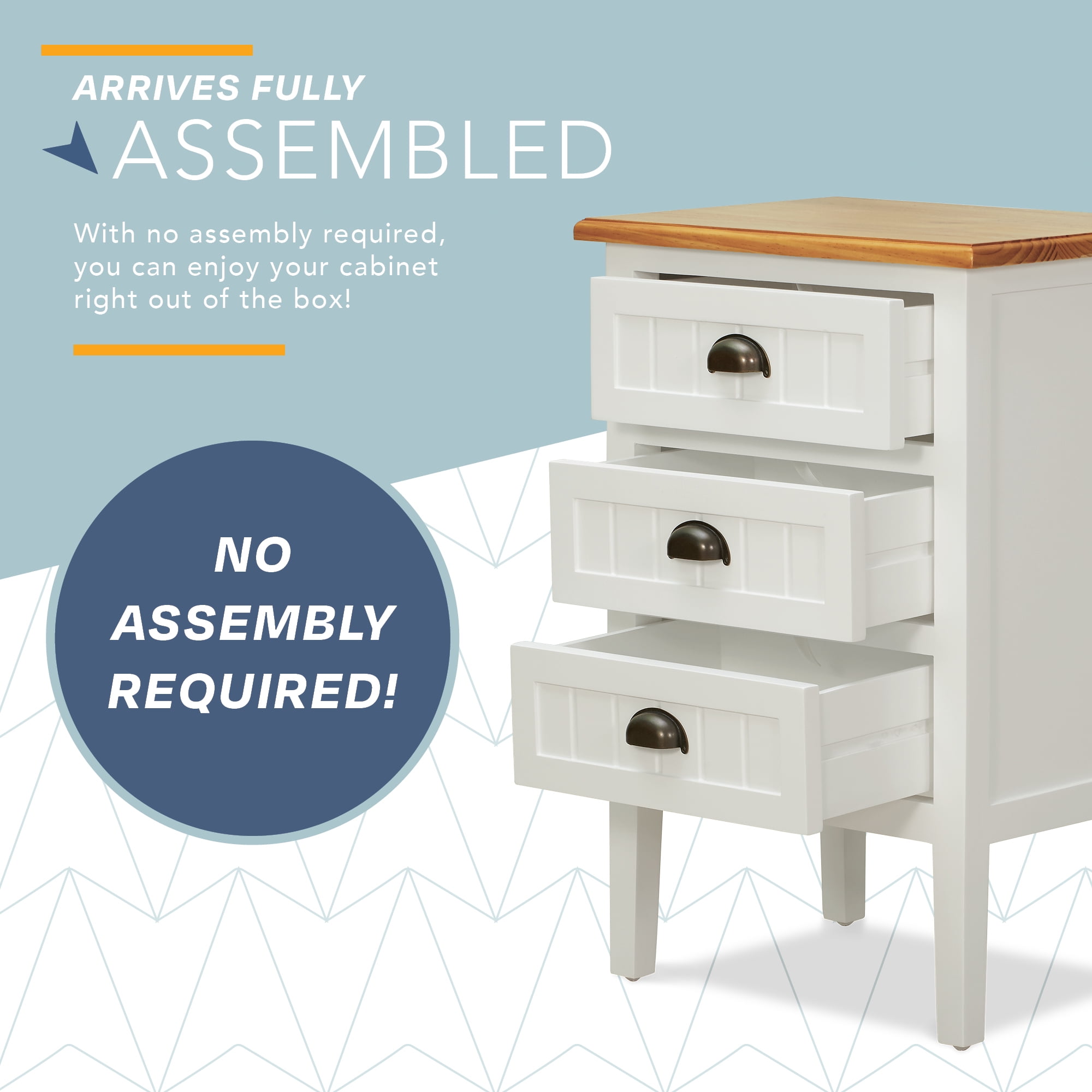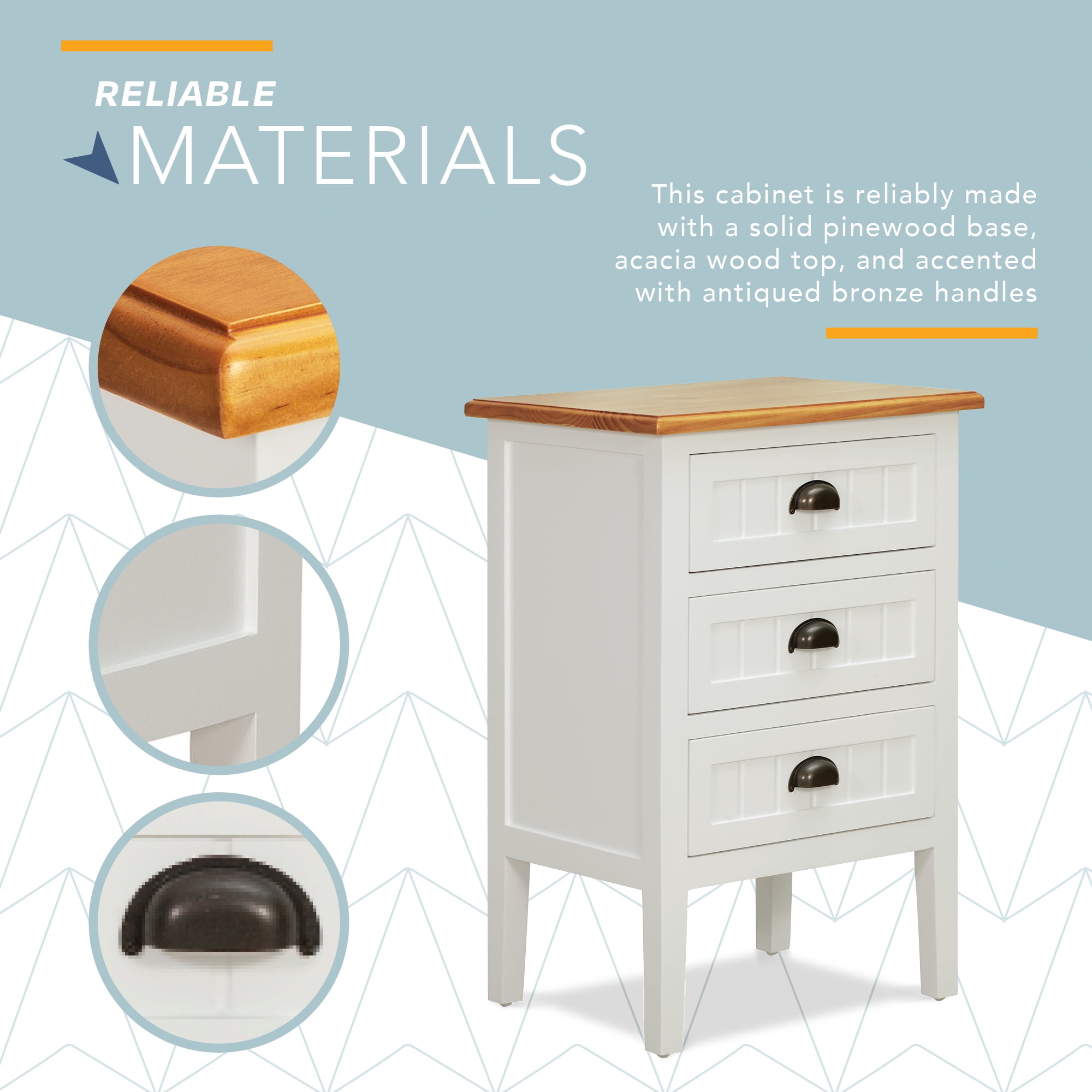 TRADITIONAL DESIGN: A cottage style frame in a classic white finish, paired with an Acacia wood top Natural wood color and grain, with grooved geometric drawer fronts and dark bronze half moon metal pull handles, and standing on solid tapered legs provide a simple but charming look. SPACIOUS STORAGE: 3 large storage drawers (13″ wide & 11″ deep) have abundant room to fit all your bedroom necessities such as chargers, books, reading glasses, and other accessories to hide and organize clutter. FUNCTIONAL & VERSATILE: The 18″ top provides a large surface to pair with a lamp, or to hold laptops, phones, plants or drinks. Can be used as a side table or end table, or as a bedside table for the guest room or children’s room. SOLID & DURABLE: Made of solid and with sturdy tapered legs, this night stand can support up to 66 lbs. Padded footers protect hard surfaces from scrapes and scratches. Easy to clean with minimal maintenance. FULLY ASSEMBLED: Arrives ready to use straight out the box. We offer USA Customer Support.