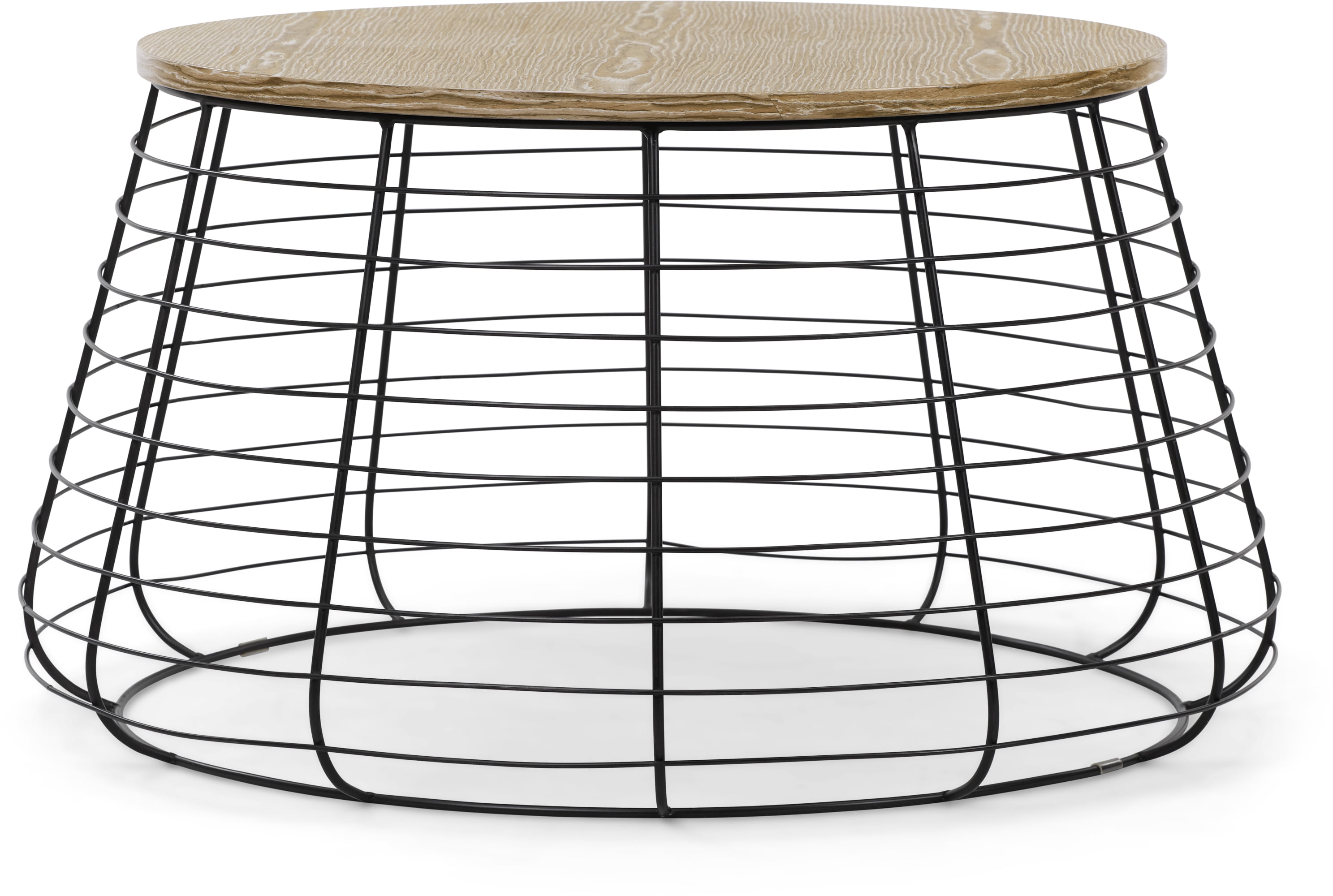 Finish: Black and Distressed Materials: Wood and Metal Organic farmhouse charm to give your room the wow factor it deserves Distressed wood table top is sturdy and durable Round metal base fits a variety of interiors Modern wireframe coffee table makes a statement in your living room Easy assembly required
