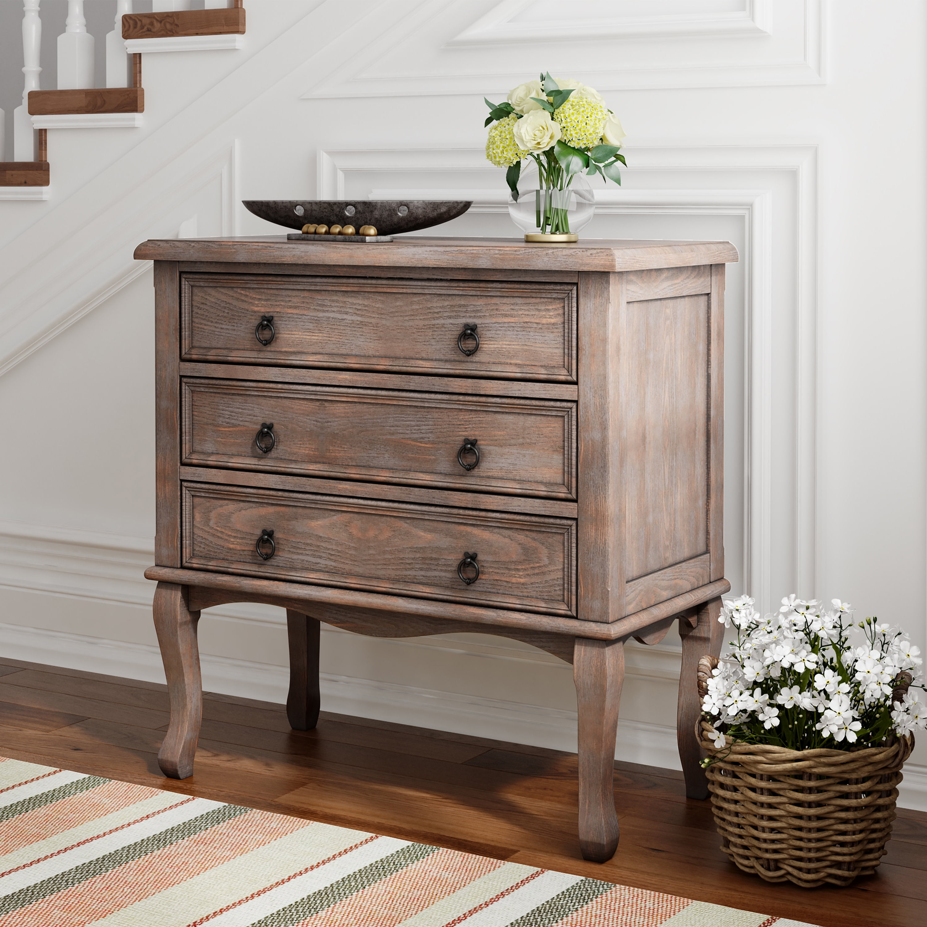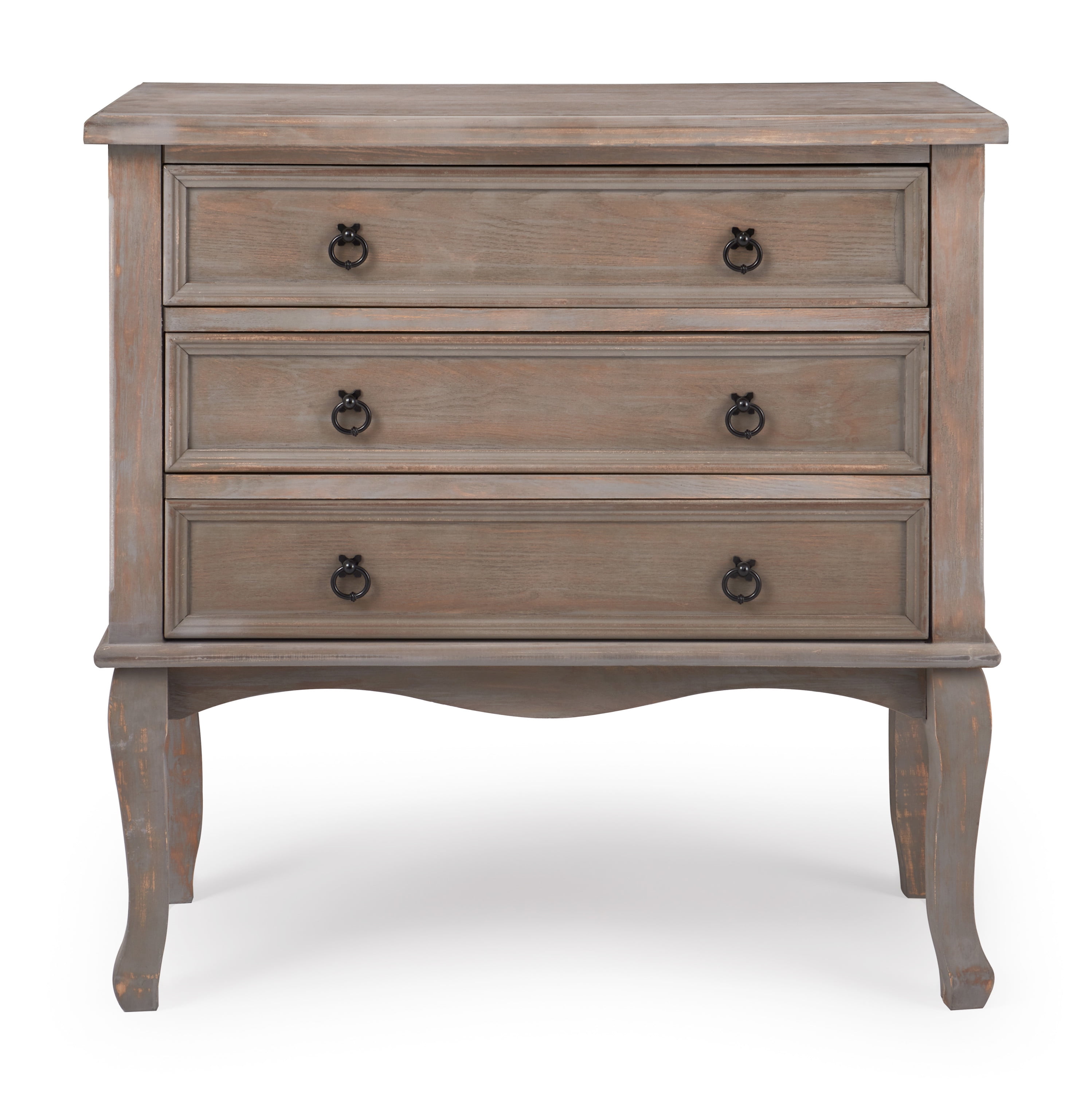 The practical function and refined styling of this attractive storage cabinet makes it a welcome addition to any living room, entryway, or home office. Three spacious drawers offer plenty of space to keep items tucked away yet close at hand. The traditional design style gets a fresh update with a light gray washed wood finish for a truly timeless look. The smooth curves of carved wood legs create an elegant focal point, accented by antique-inspired ring pulls. Features: Storage and style combine with this charming accent cabinet Versatile use in your hallway, living room, or office space Light gray washed wood finish complements any décor Black ring pull hardware is antique inspired Easy assembly required Specifications: Weight Capacity: 100 lbs