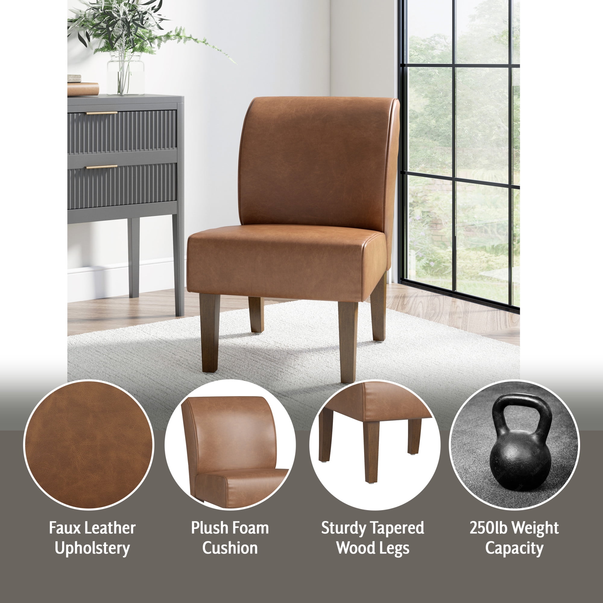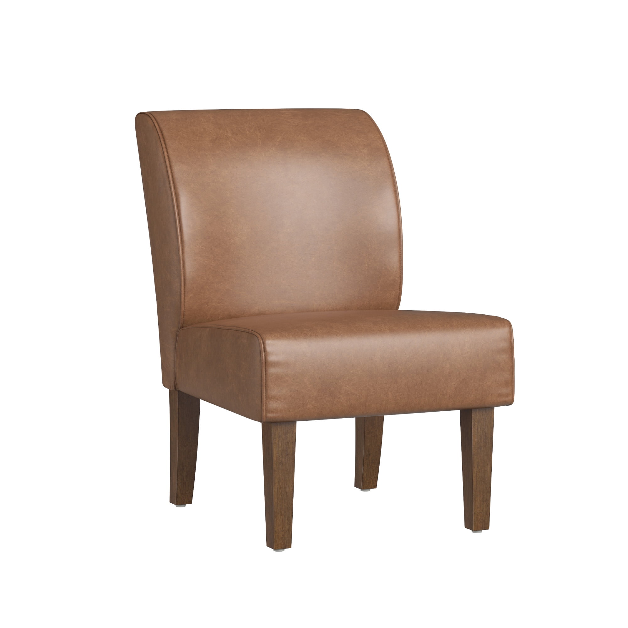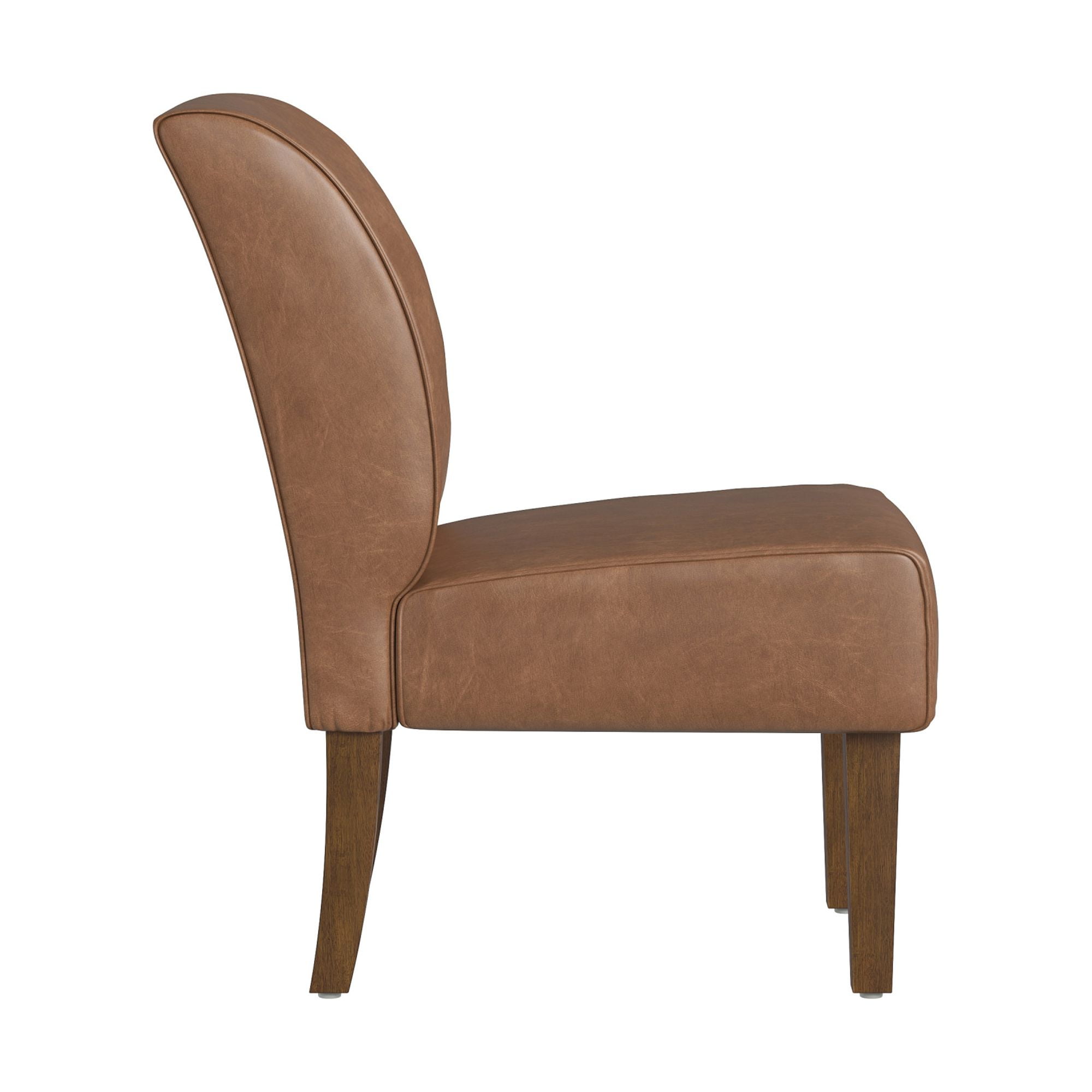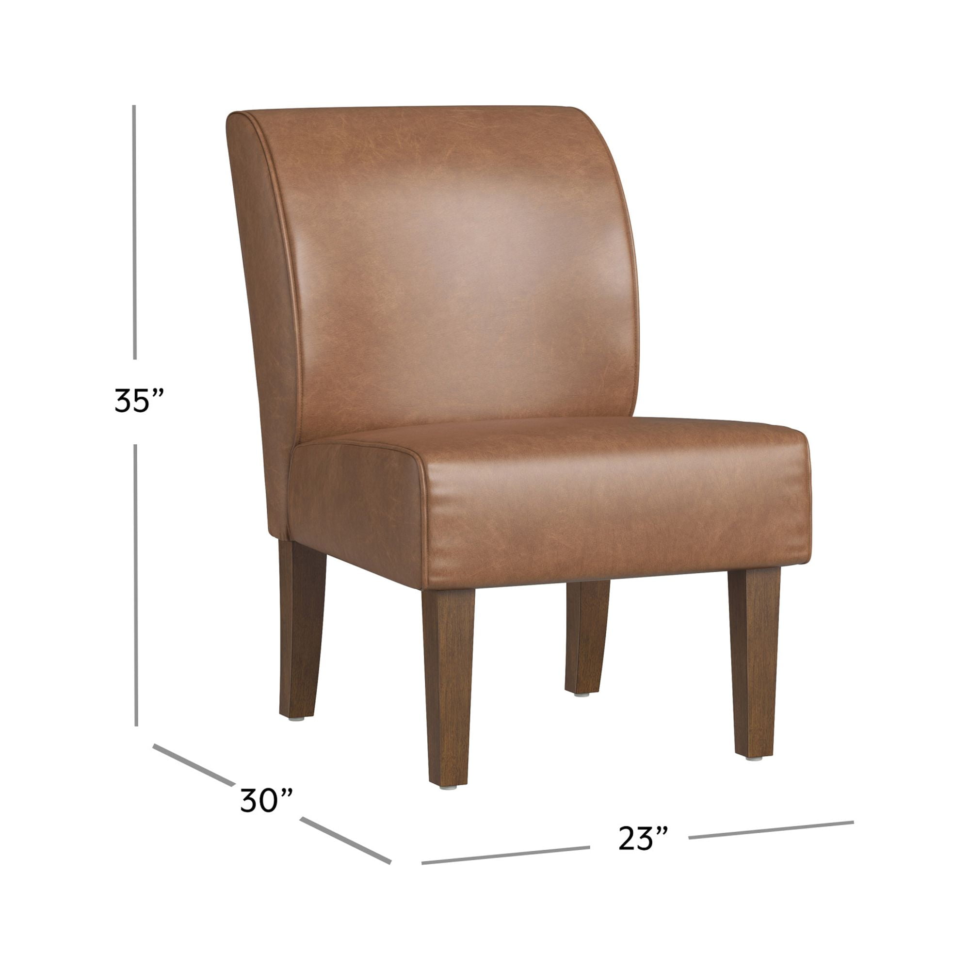 This sleek, sophisticated accent chair is upholstered in gorgeous faux leather for a luxe look. Minimally adorned, this slipper chair is defined by the clean lines that make up its square silhouette. With a contoured, slightly reclined back that will tempt you to sit and stay awhile, this piece is just as comfortable as it is understated. The saddle brown faux leather pairs with the wooden legs to add warmth to this piece designed in the casual transitional style. Welting runs along the edges of the chair to further elevate the aesthetic, and the legs feature glides to protect your floor. Assembly required.