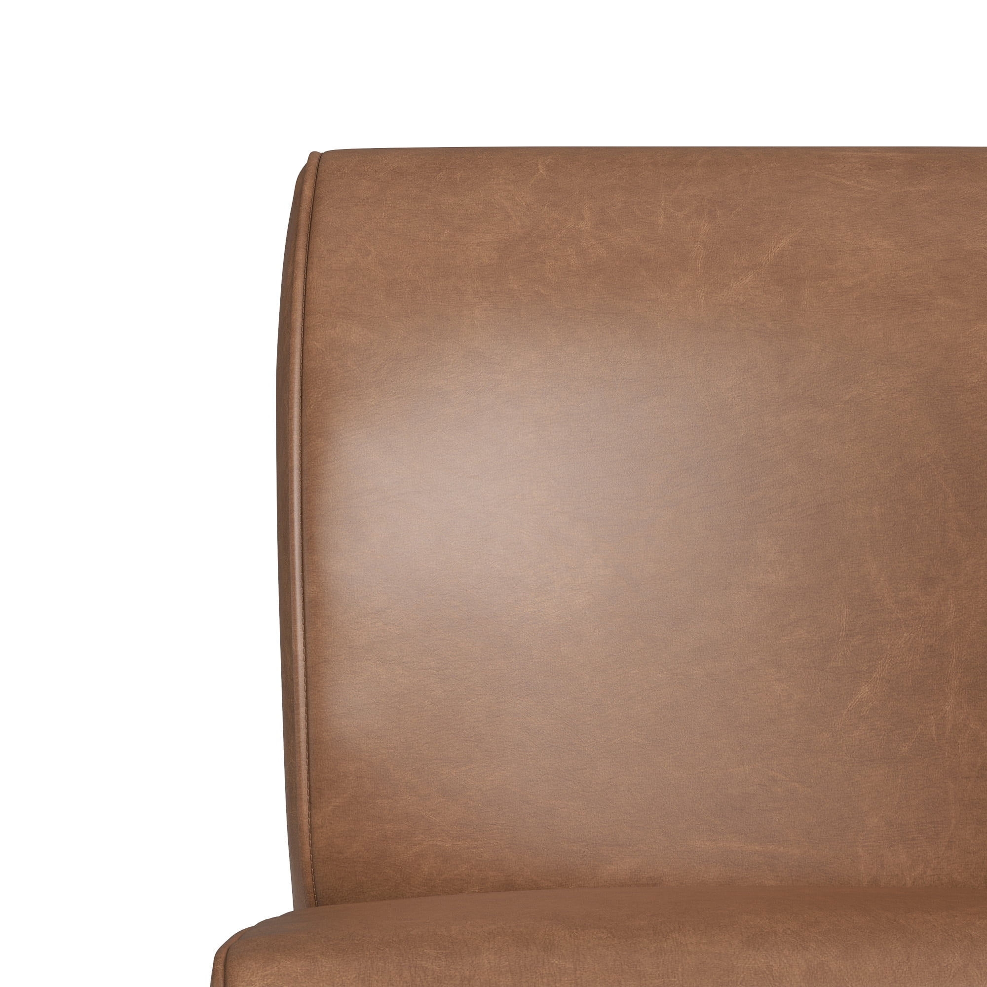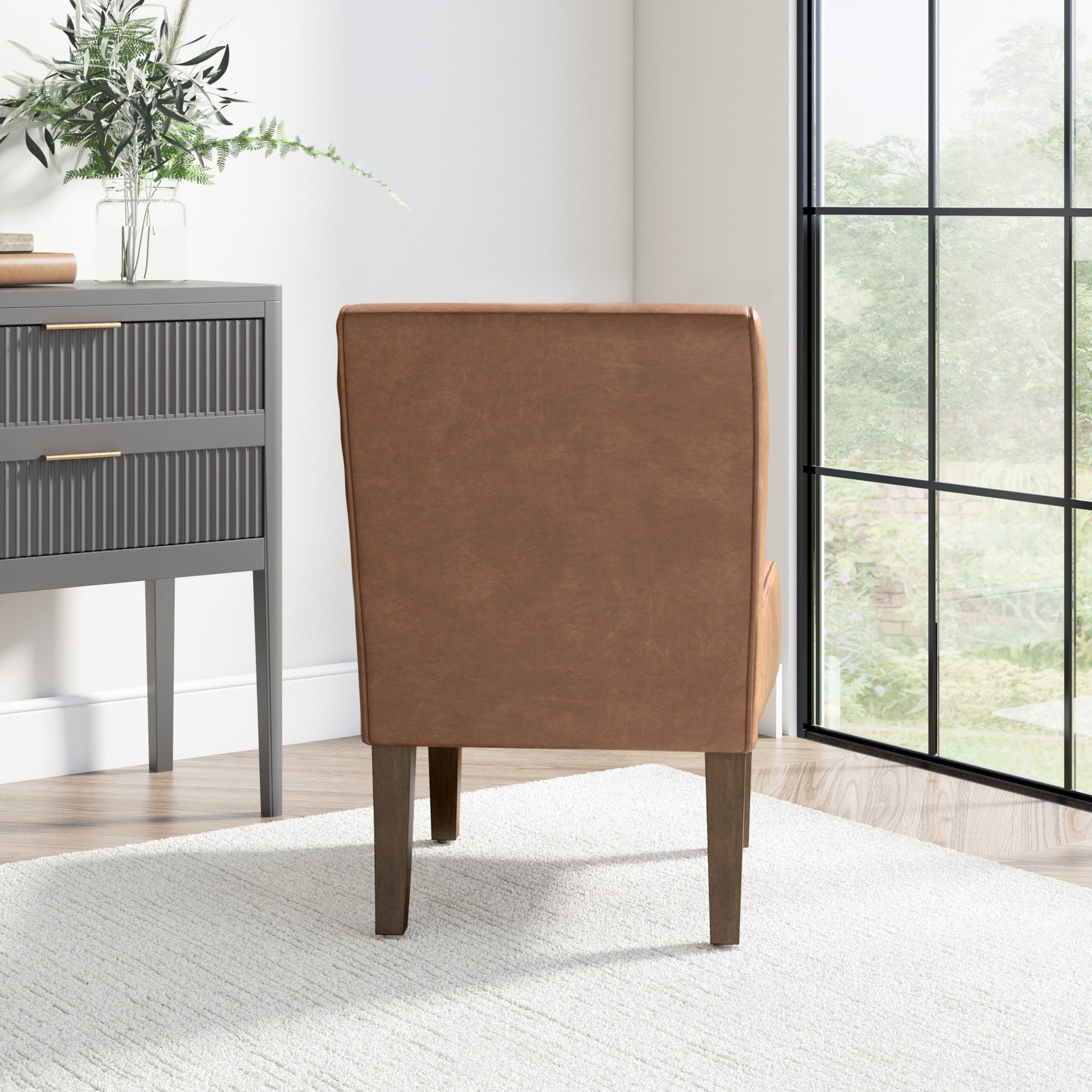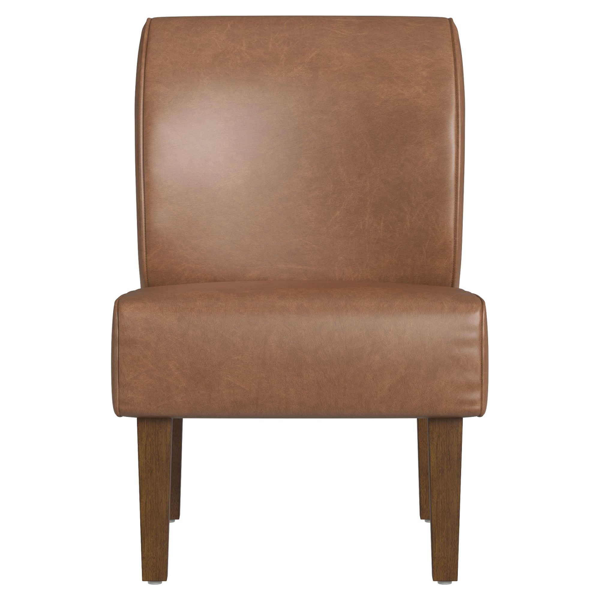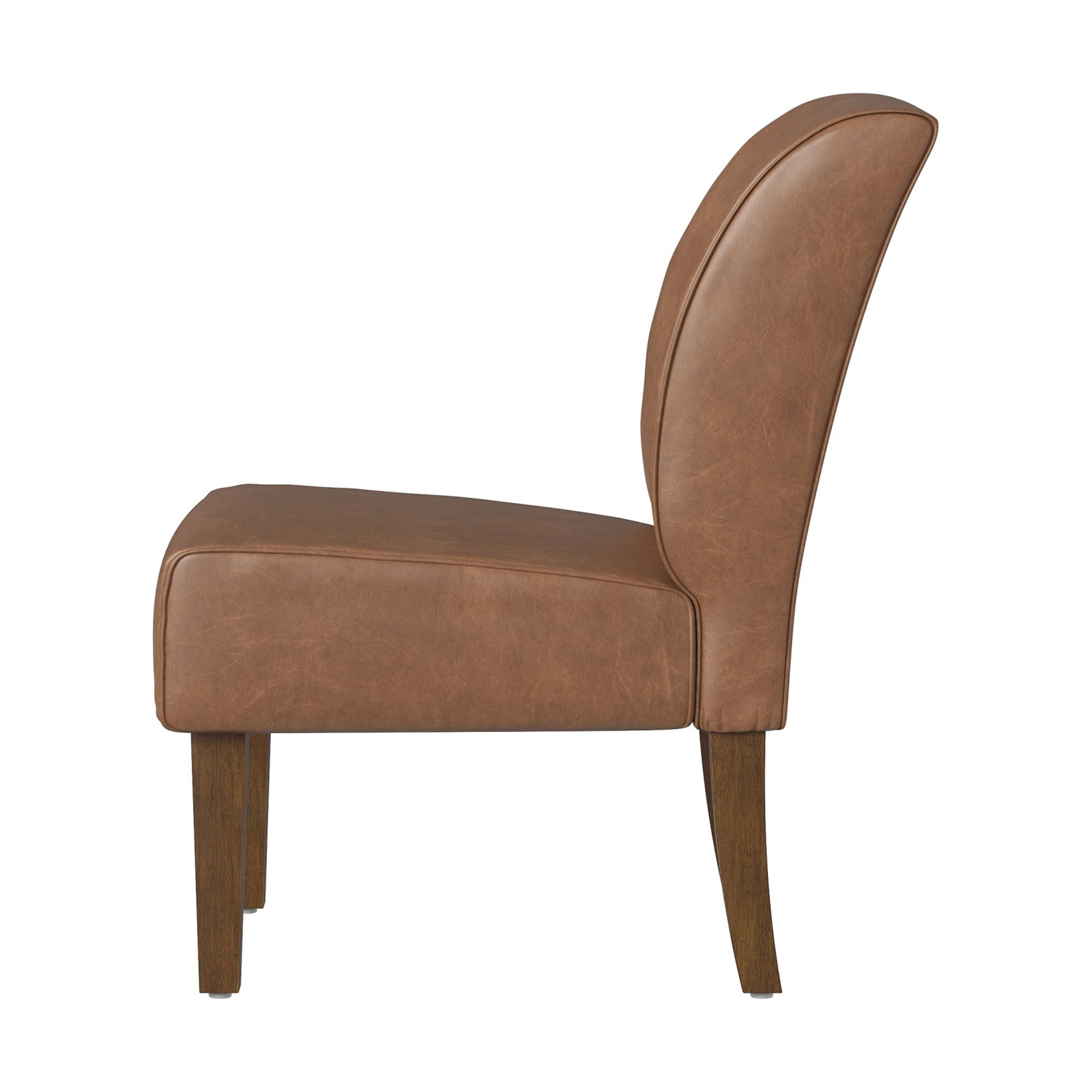 This sleek, sophisticated accent chair is upholstered in gorgeous faux leather for a luxe look. Minimally adorned, this slipper chair is defined by the clean lines that make up its square silhouette. With a contoured, slightly reclined back that will tempt you to sit and stay awhile, this piece is just as comfortable as it is understated. The saddle brown faux leather pairs with the wooden legs to add warmth to this piece designed in the casual transitional style. Welting runs along the edges of the chair to further elevate the aesthetic, and the legs feature glides to protect your floor. Assembly required.