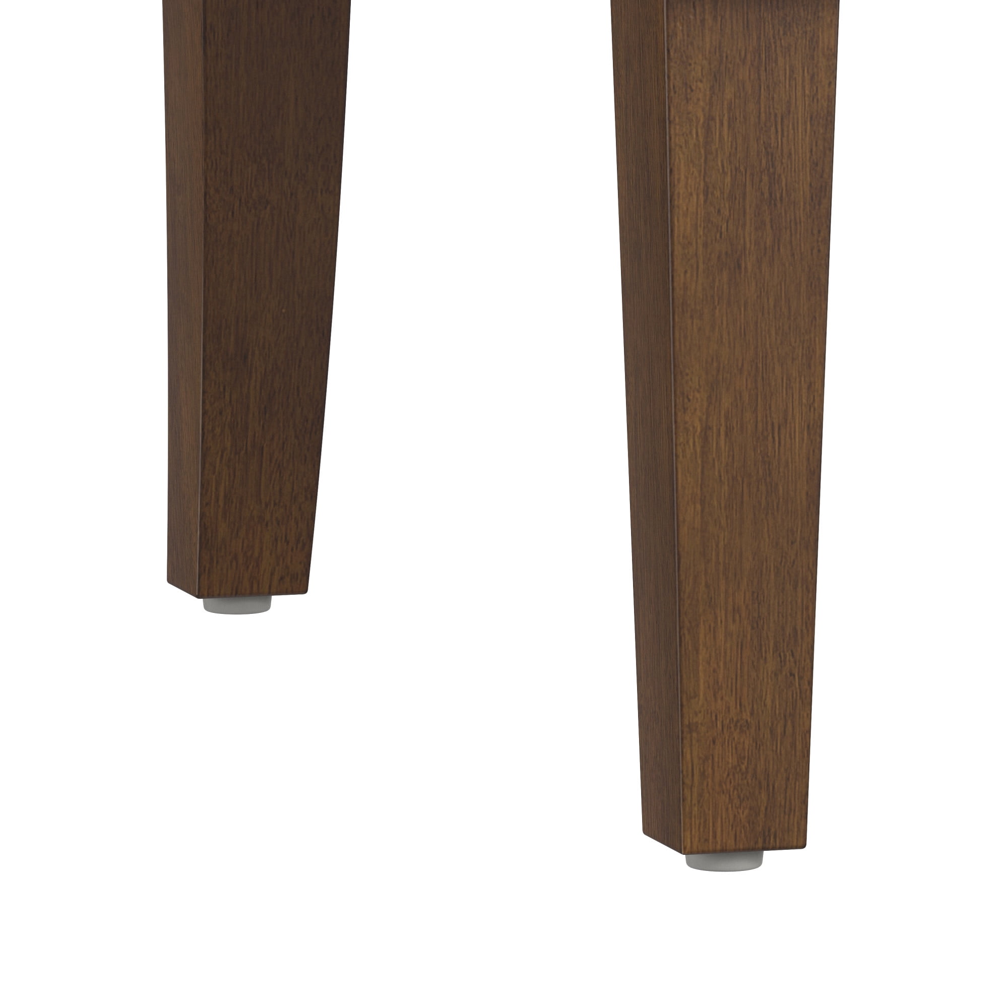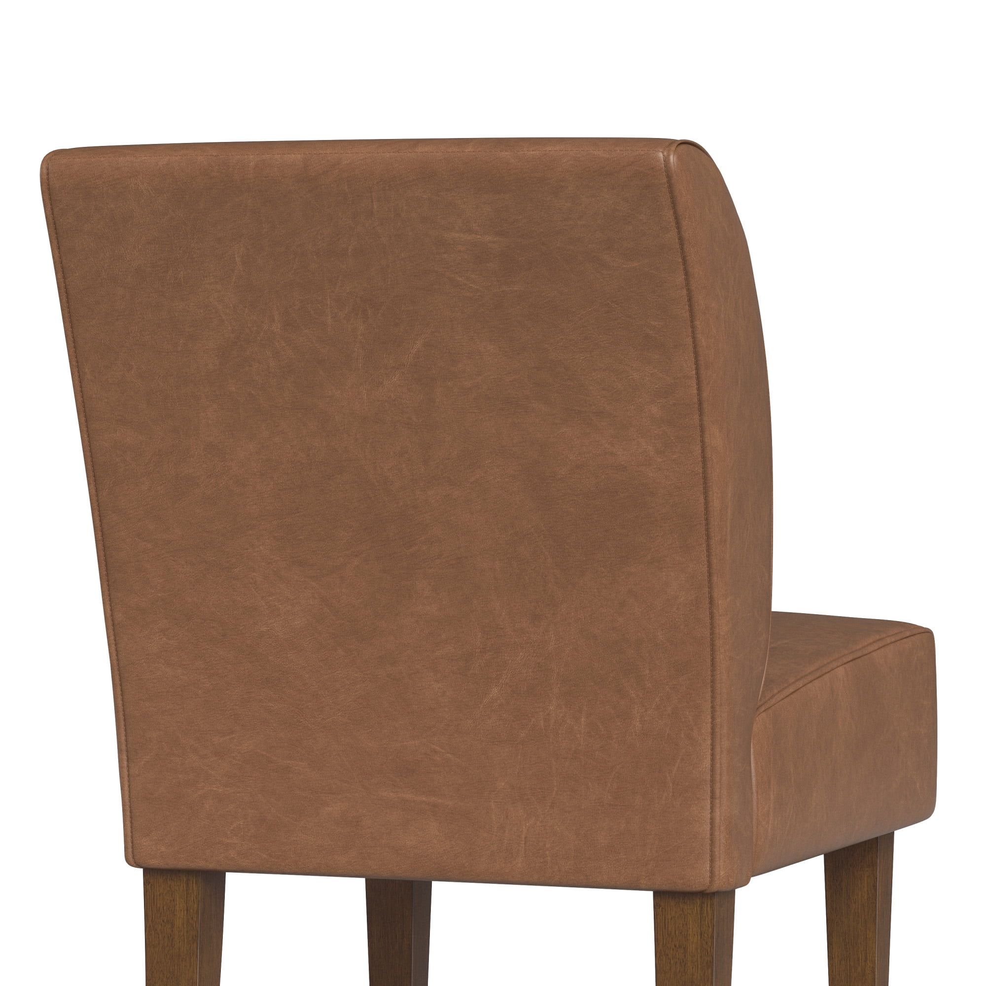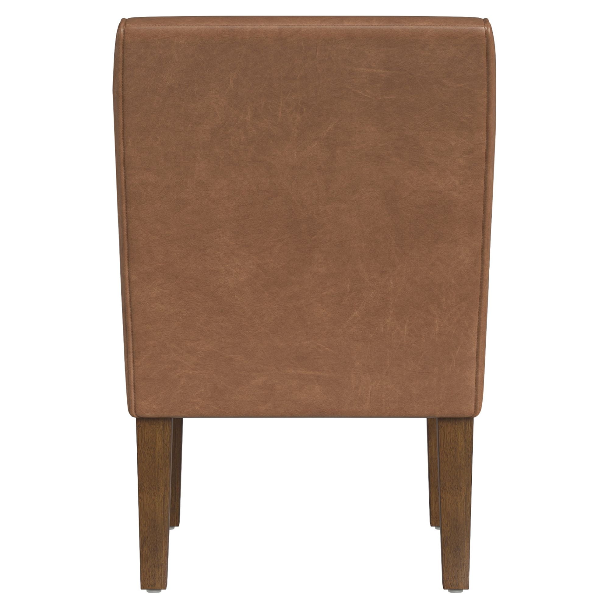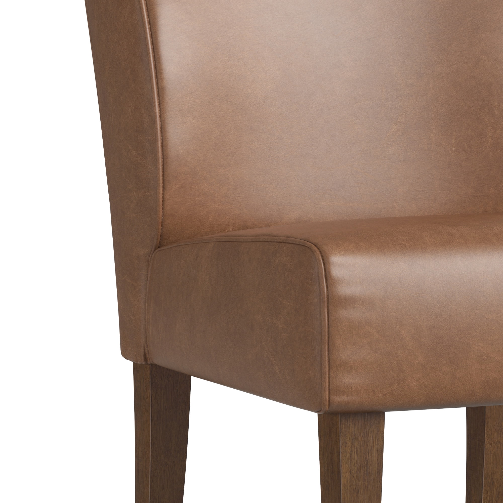 This sleek, sophisticated accent chair is upholstered in gorgeous faux leather for a luxe look. Minimally adorned, this slipper chair is defined by the clean lines that make up its square silhouette. With a contoured, slightly reclined back that will tempt you to sit and stay awhile, this piece is just as comfortable as it is understated. The saddle brown faux leather pairs with the wooden legs to add warmth to this piece designed in the casual transitional style. Welting runs along the edges of the chair to further elevate the aesthetic, and the legs feature glides to protect your floor. Assembly required.