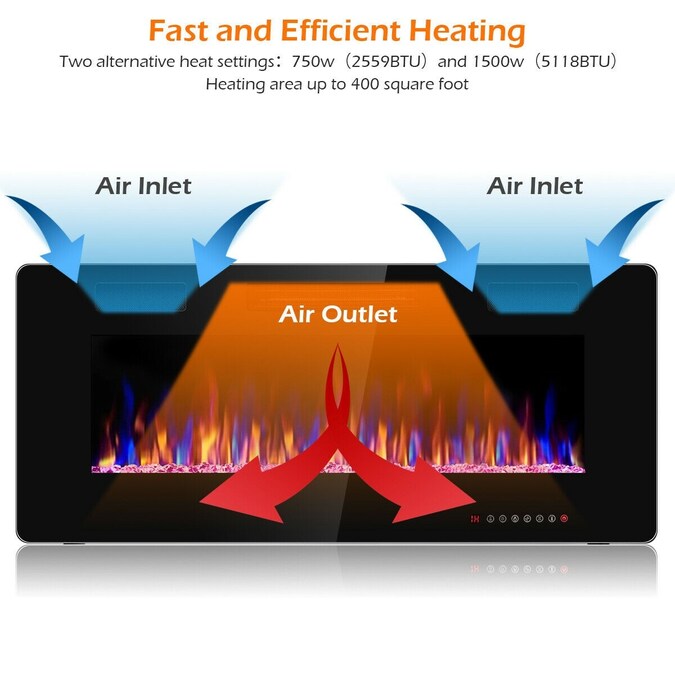 Combine with attractiveness and practicality, this 42 inch electric fireplace will enlighten your home. This electric fireplace comes with 2 heating settings–low temperature of 750 W and high temperature of 1500 W. More, this electric fireplace heater simulates real flame with 12 flamer colors and bed colors to create a cozy atmosphere as well traditional fireplace. More importantly, ETL certification and overheat protection ensure safety. This elegant black glass fireplace with timer adds a modern touch and an ideal touch to your home.