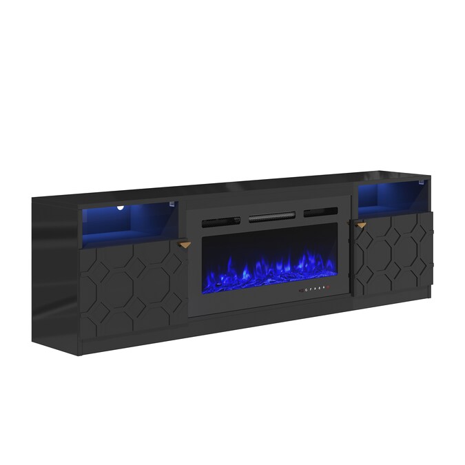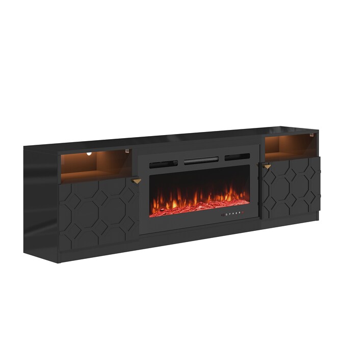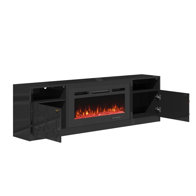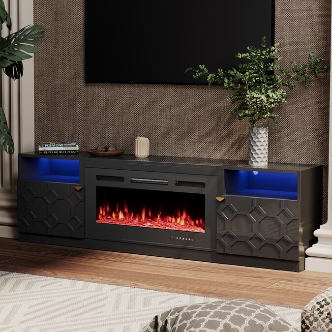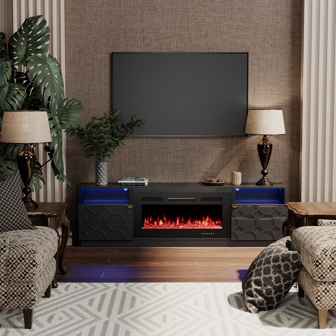 - The 36″ LED electric fireplace with 12-color flame, heat, adjustable temperature and timer, paired with a very elegant and atmospheric honeycomb door storage TV cabinet with metal triangle pulls, is the best solution for temperature regulation and storage in a modern living room.