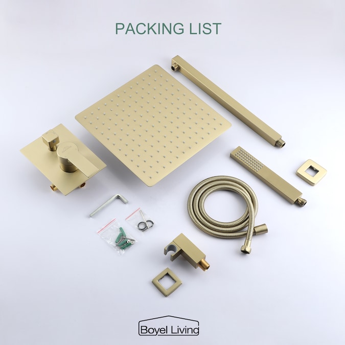 - 12 inches square rain shower head(SUS304 stainless steel), handheld shower head(brass), 15.7 inches shower arm(brass), 1.5M shower hose(SUS304 stainless steel), shower holder(brass), shower mixer valve body(brass) and other necessary installation parts