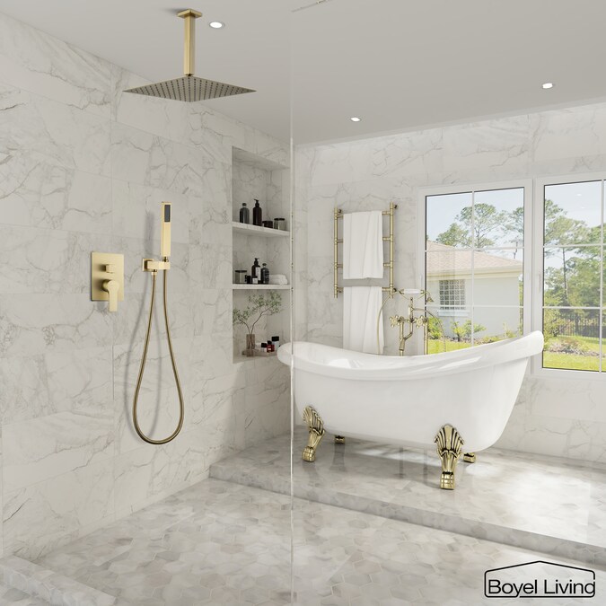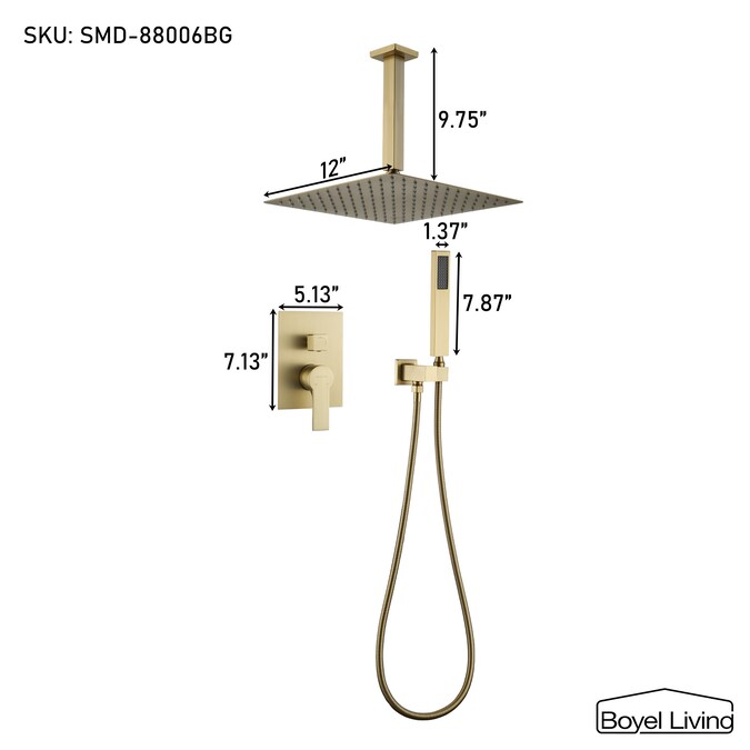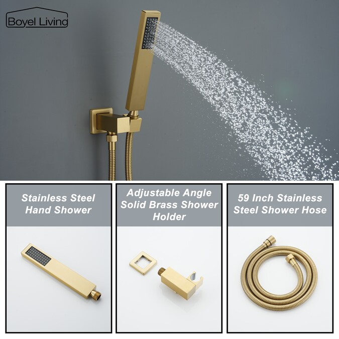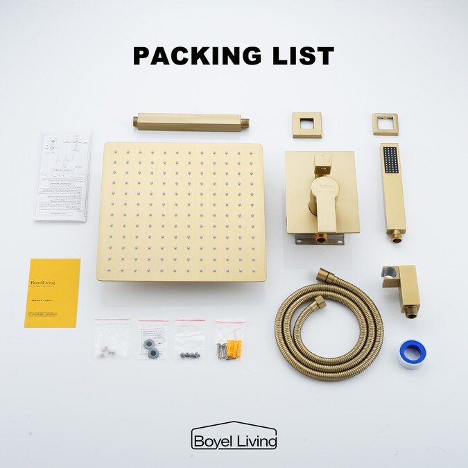 - 12 inches square rain shower head(SUS304 stainless steel), handheld shower head(brass), 7.9 inches shower arm(brass), 59 inches shower hose(SUS304 stainless steel), shower holder(brass), shower mixer valve body(brass) and others