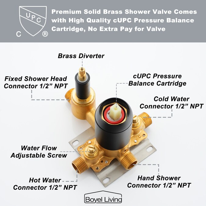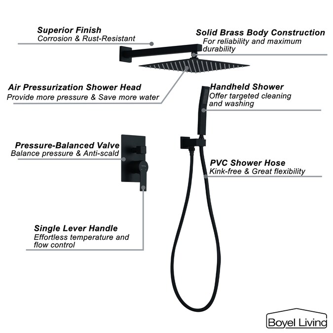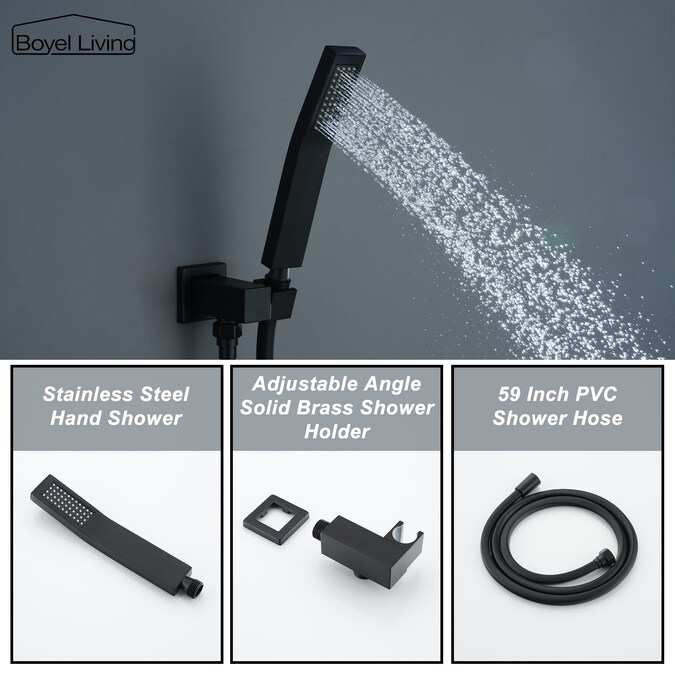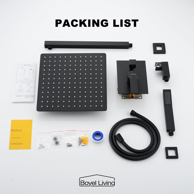 • 12 inches square rain shower head(SUS304 stainless steel), handheld shower head(brass), 15.7 inches shower arm(brass), 59-Inch shower hose(high quality PVC), shower holder(brass), shower mixer valve body(brass) and other necessary installation parts
