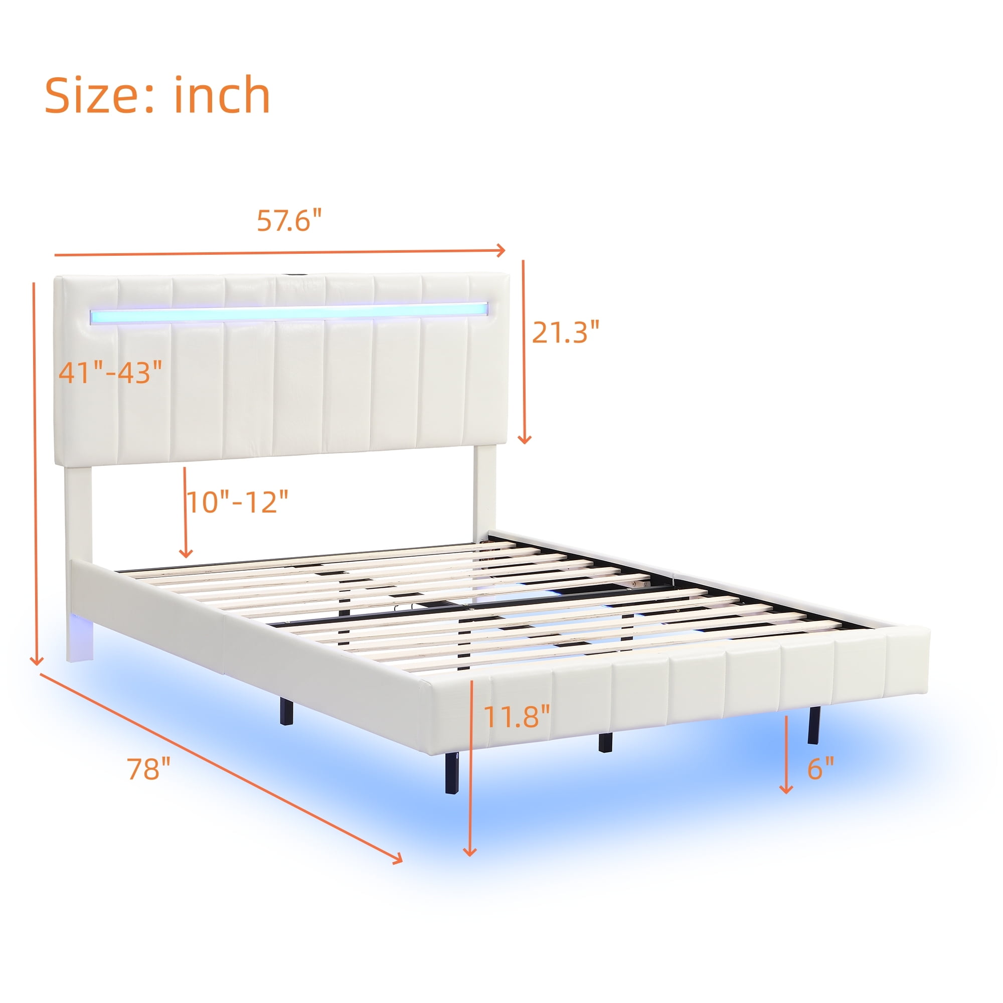 Clipeyh Modern Floating Bed Frame with LED Lights and USB Charging Station, Full, White / PU01 Unique Floating Bed Frame with LED Lights Unique hidden bed foot design creates a dreamy, floating appearance LED lights enhance the modern aesthetic and provide a unique visual experience Headboard features 2 USB ports for convenient charging of devices LED lights can be controlled via remote or mobile app with various colors and modes Music Sync mode allows LED lights to flash in rhythm for an immersive experience Constructed from solid MDF and plywood for durability and support up to 500 lbs No-noise design with Velcro slats to eliminate squeaking during movement Overall dimensions: 78 x 57.6 x 43 inches (L x W x H) Suitable for full-size mattresses (not included) with a recommended thickness of 10 inches
