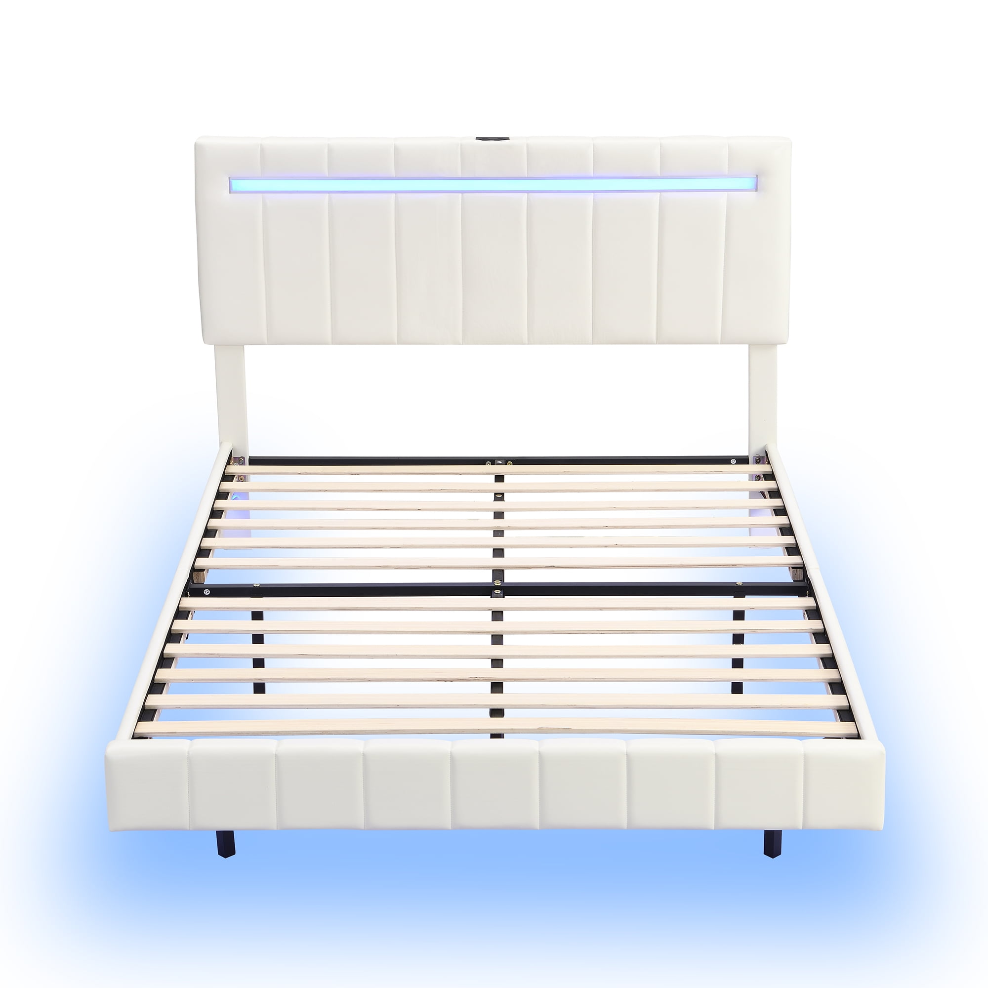 Clipeyh Modern Floating Bed Frame with LED Lights and USB Charging Station, Full, White / PU01