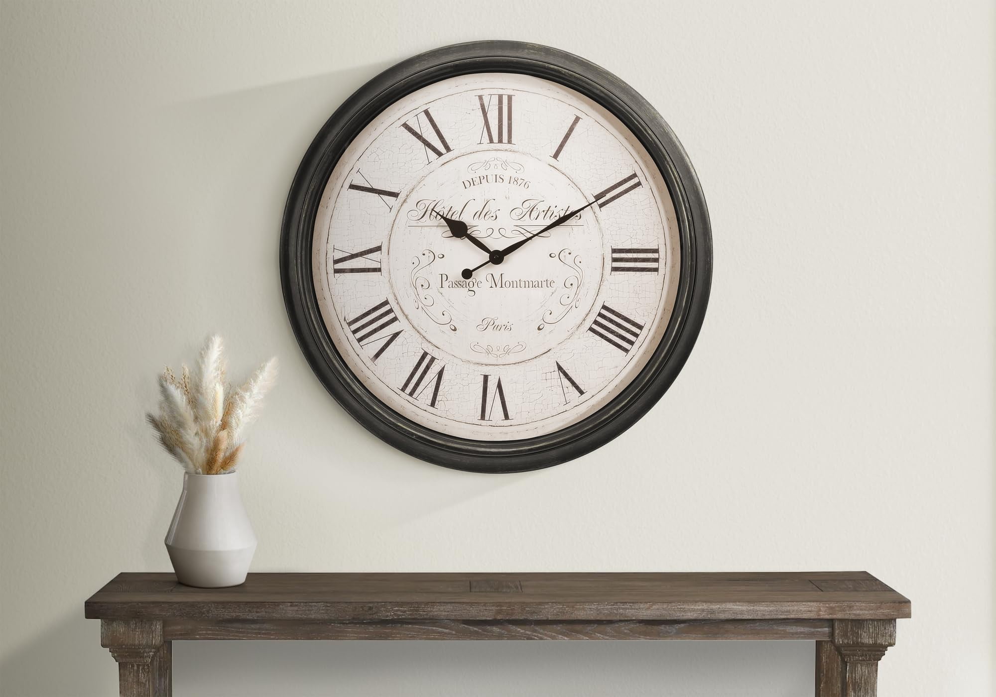 Bring some simple elegance to your home decor with this stunning 30″ round wall clock in a rich brown hue. This large, oversized clock features easy to read roman numeric markings behind a glass surface, adding a touch of sophistication to any room. The durable plastic frame is designed with subtle antiquing around the edges for a classic appeal. This large oversized clock uses an analog quartz movement to ensure accurate timekeeping. The non-ticking mechanism makes it perfect for quiet environments, with only 1 AA battery required (not included). There is no assembly required and a 2 year limited warranty against any defects. Enjoy this transitional style clock as an easy decorative and functional addition to your home or office. Suitable for indoor use only. Features: Trendy and stylish 30″ round wall clock with a durable plastic frame in an elegant brown hue and subtle distressing for a classic appeal in any home decor. Large oversized design with easy to read roman numeric markings behind a glass surface. Analog quartz movement for accurate timekeeping, non-ticking mechanism for quiet environments. This wall clock includes a 2 year limited warranty against any defects for your satisfaction with no assembly required. Only 1pc AA battery required (not included) for a functional and transitional style decorative addition for all spaces (indoor use only). Product dimensions: 30 in. W x 2.25 in. D x 30 in. H