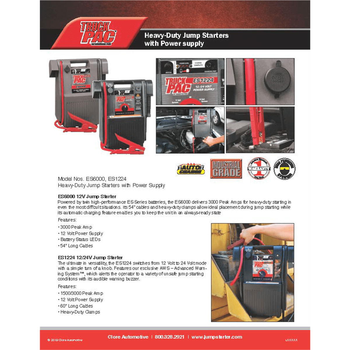 3000 Peak Amps/750 Cranking Amps in 12V mode 1500 Peak Amps/370 Cranking Amps in 24V mode ES Series battery designed specifically for vehicle jump starting Automatic recharging Integrated voltage selection switch