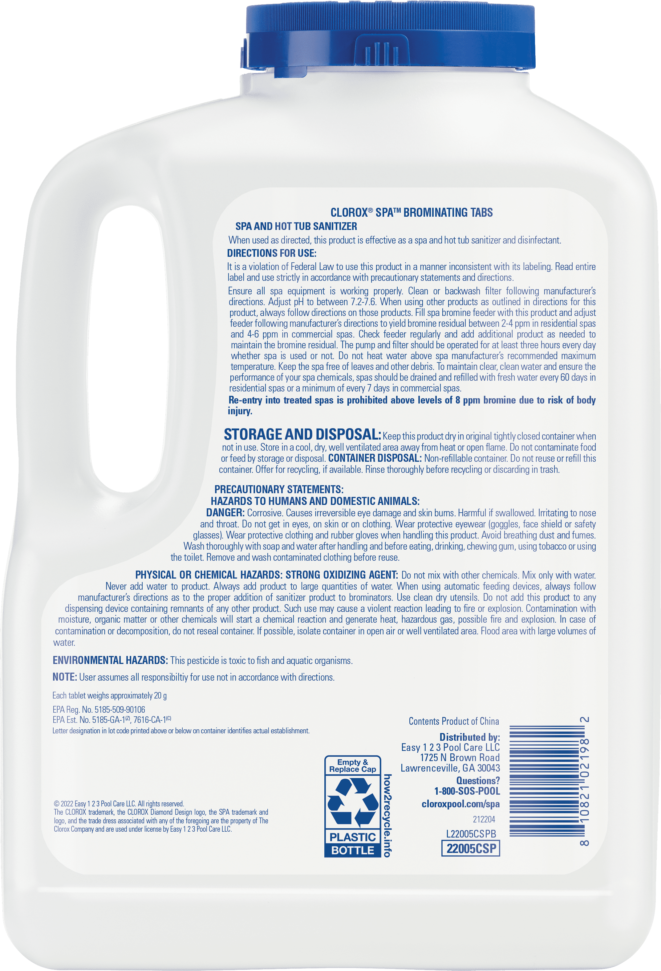 Clorox Spa® Brominating Tablets can be used for low-odor sanitization in hot tubs and spas. The slow-dissolving tablets keep your spa water sparkling clear and odor-free. In addition, brominating tabs kill bacteria and make your spa water less pH sensitive. Bromine is the most common method of sanitizing spas, available in multiple sizes. Make sure you use bromine tabs in your spa regularly. An unkept spa can quickly grow harmful bacteria from a wet, hot environment. Test your spa water frequently to maintain a pH balance of 7.2-7.6 and 3-6 ppm of bromine. Drain, clean and refill your spa every 90 days.