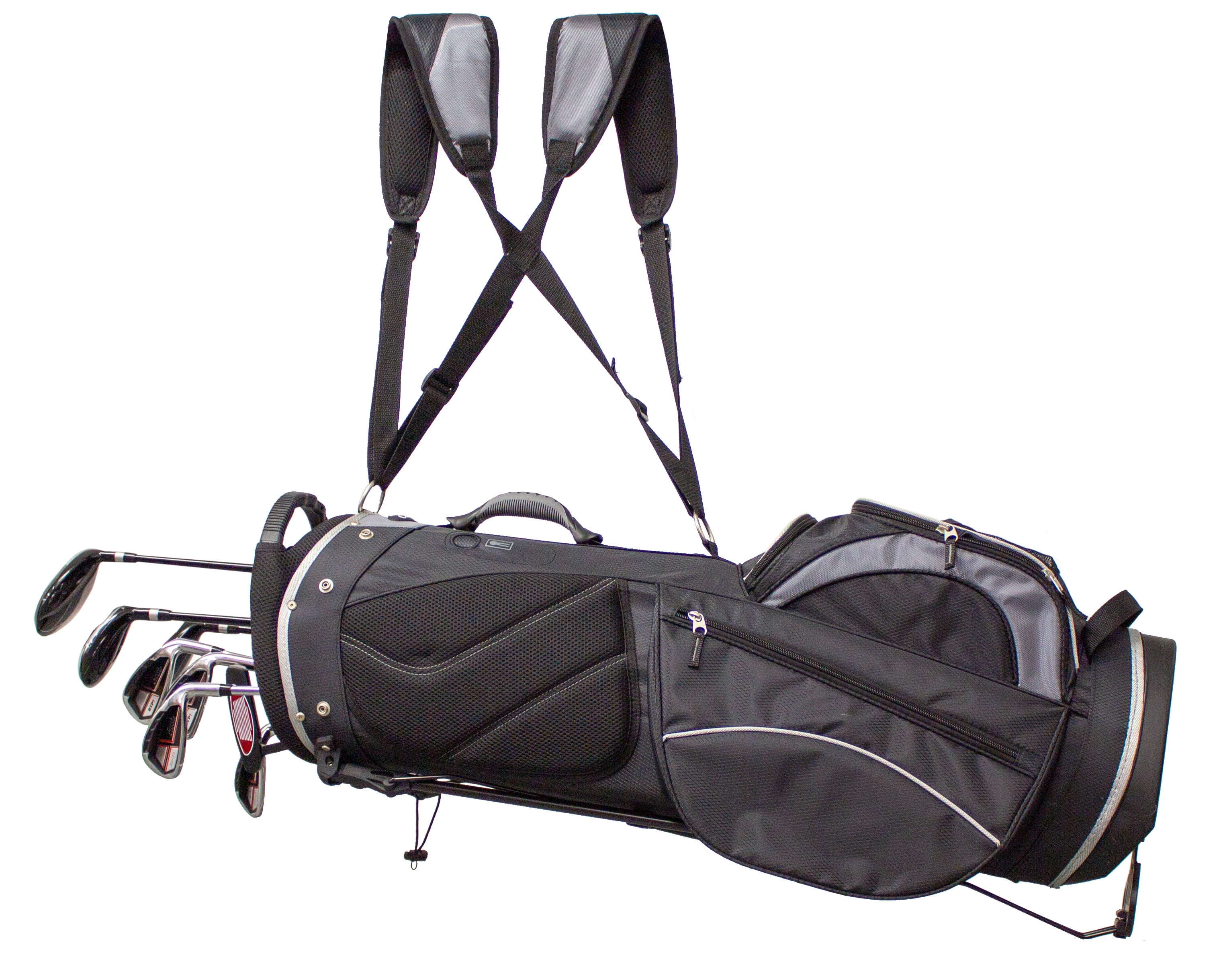 Club Champ Stand Bag: 8-Way Padded Top Molded comfort-grip handle. Adjustable shoulder strap 6 Storage Pockets Pen and divot tool holders. Special dry storage pouch. Black