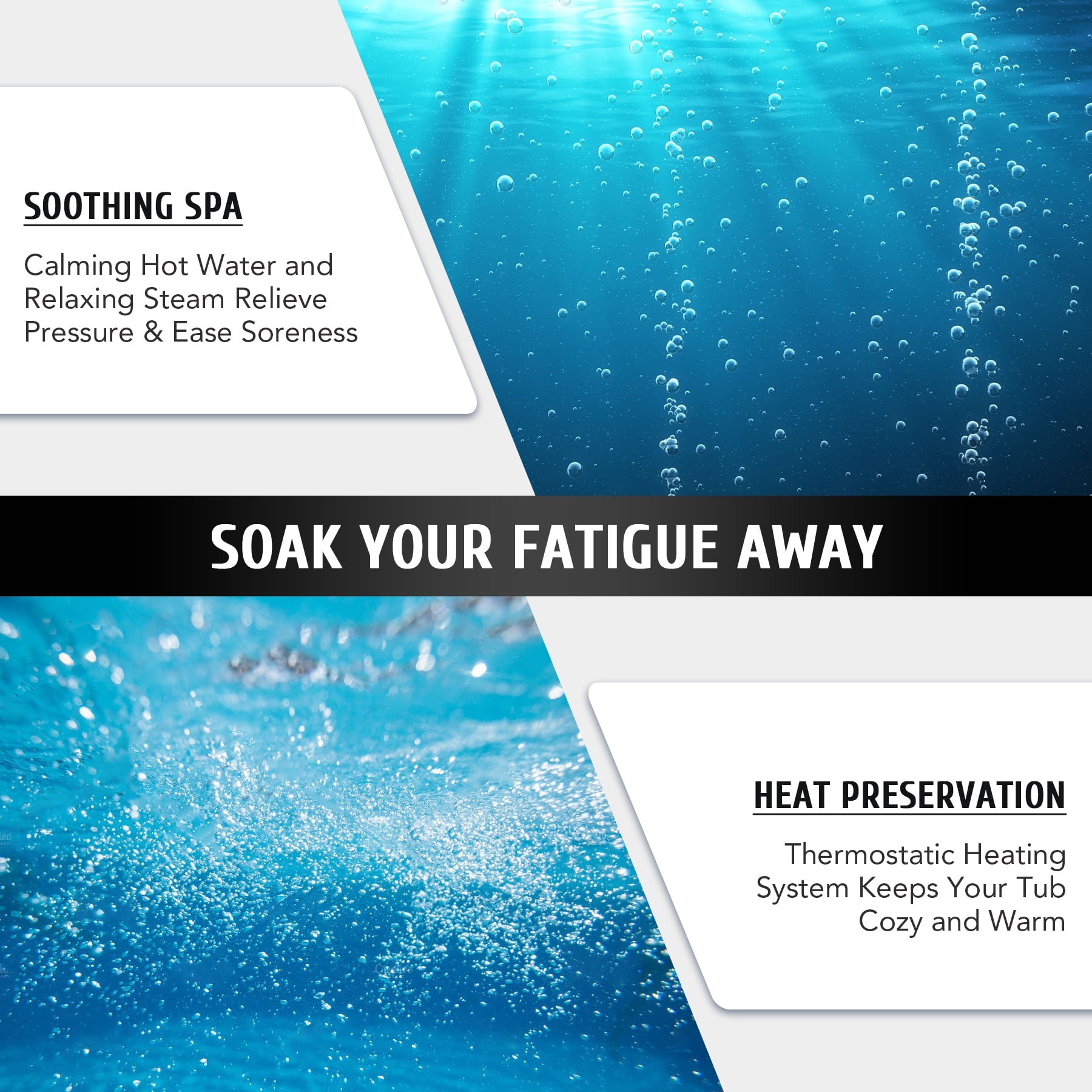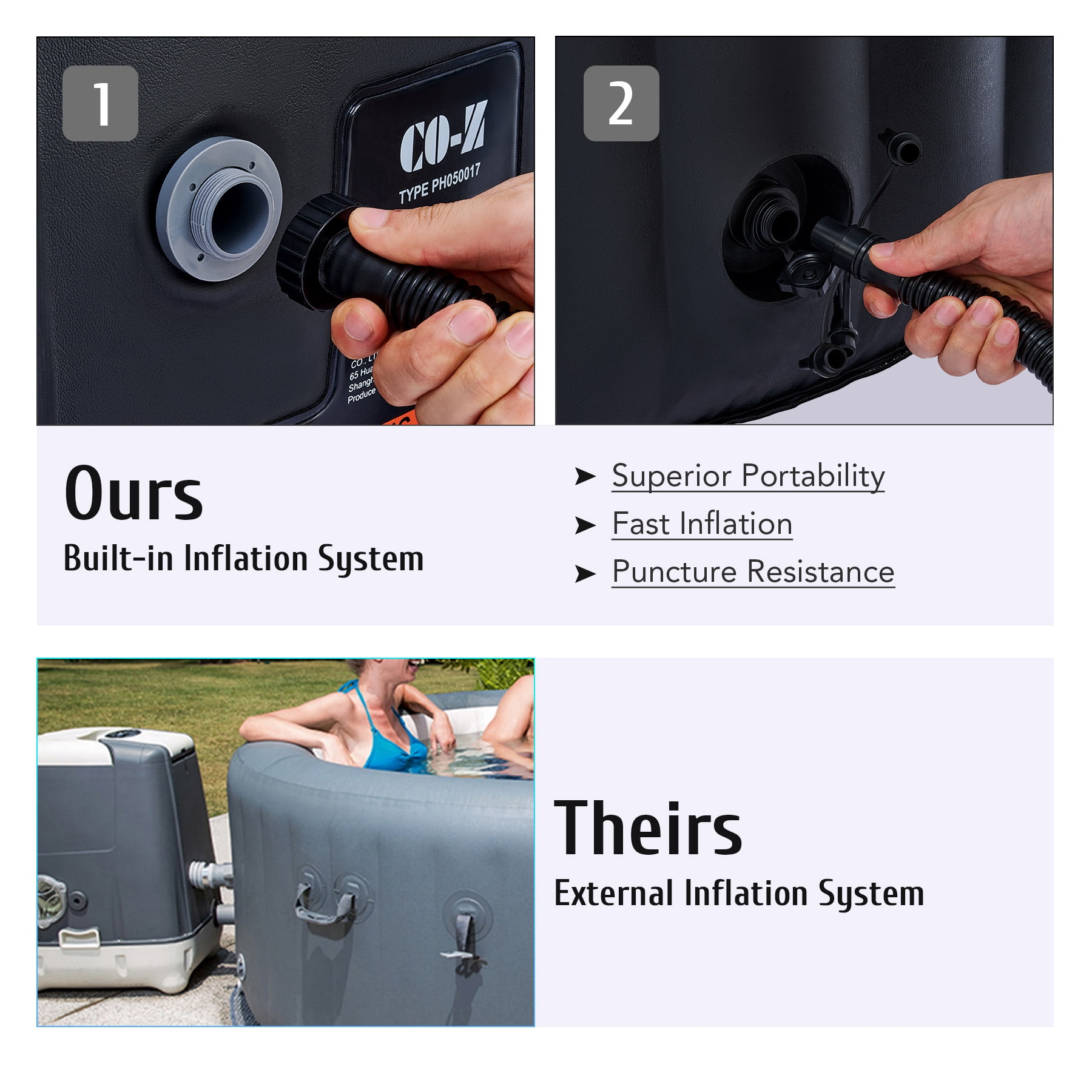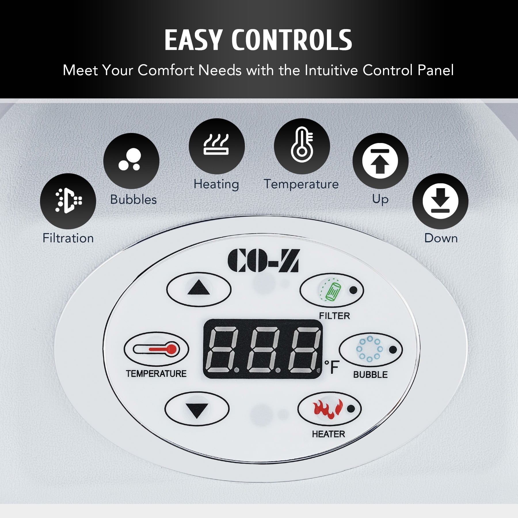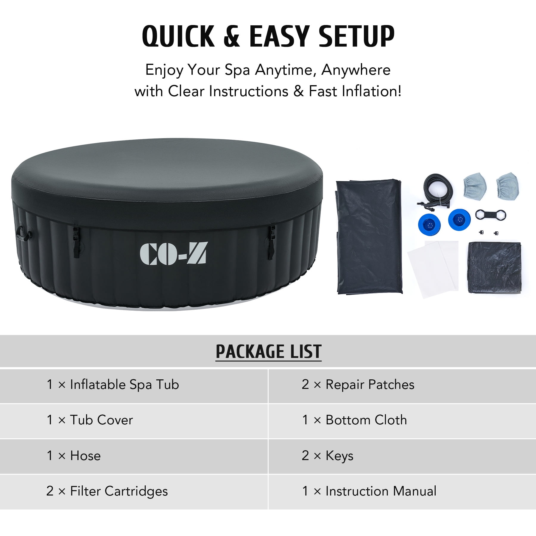 Click Here for the video of this item. Click Here for more types of this item. LUXURY SPA AT HOME: CO-Z’s inflatable hot tub, featuring upgraded 1350W heating tube to speed up heating, warms its 265 gallons to 104°F with a heating rate of 1-3°F per hour, complemented by 130 high-powered jets for abundant relaxation IDEAL FOR 4-6 ADULTS: Our 6 foot 10 inch wide hot tub accommodates up to six adults, letting you and yours fully enjoy your leisure time at home, on your patio, in the backyard, or elsewhere COZY & DURABLE: Crafted from quality PVC laminate, this mini pool offers ultimate support, durability, and comfort, providing puncture-proof quality and prolonged use while minimizing air leakage; newly added aluminum insulation effectively keeps the water warm and pesky bugs at bay EASY SETUP & TRANSPORT: Our portable hot tub is easy to set up thanks to the clear instructions; the provided electric air pump inflates it in under 8 minutes; and the convenient side handles make it a breeze to transport once inflated USER-FRIENDLY DESIGN: This mini pool includes everything you need for a true-to-spa experience; an intuitive control panel for easy operation, 2 fresh filter cartridges to keep the water fresh, and a sturdy valve for fast drainage Want all of the stress relieving magic of a roiling hot tub without all the expense and hassle of a permanent fixture? This versatile 6 foot 10 inch wide inflatable hot tub offers an array of advanced features, providing all the physical and mental health benefits of a traditional hot tub for you and your family and friends. Its newly added aluminum insulation & upgraded 1350W heating tube speed up the water heating process, warming up to 265 gallons of water to 104°F at a rate of 1-3°F per hour. The 130 high-powered jets surrounding the interior of the tub produce rejuvenating bubbles to offer a full-body massage. This tub is built to offer superior heat resistance while still maintaining a comfortable surface for ultimate relaxation. With the touch of a button on the intuitive control panel, you can easily customize the tub’s settings without setting foot out of this fountain of youth. Accommodating up to six adults, this outdoor pool enables you to unwind and relax in comfort wherever you like without permanently losing your patio, backyard, or garden space. Our convenient blow up bathtub also comes with a fitted cover to prevent heat loss or dust accumulation, as well as two filter cartridges for timely maintenance. This portable hot tub inflates in 6-8 minutes using its provided electric air pump and hose. When the party’s over, the tub’s built in drain quickly empties your water directly out of its valve. Everyone deserves a private spa to soak and relax in after a long day’s work. With our superior quality and user-friendly design, you’ll enjoy this convenient luxury for years to come! Specifications Material: PVC Color: Black Volume Capacity: 265 gal. (1000 L) Bubble Jets: 130 Heating Power: 1350W Jet Power: 600W Filtration Power: 35W Air Pump Power: 600W Dimensions: 6.8 x 6.8 x 2 ft. (2.1×2.1×0.65 m) Power Cord Length: 11 ft. (3.3 m) Weight: 53 lb. (24 kg) Capacity:4-6 People Package List 1 x Inflatable Hot Tub 1 x Hot Tub Cover 1 x Hose 2 x Filter Cartridges 2 x Filter Covers 2 x Repair Patches 1 x Base Cloth 1 x Wrench 2 x Buckle Keys 1 x Instruction Manual