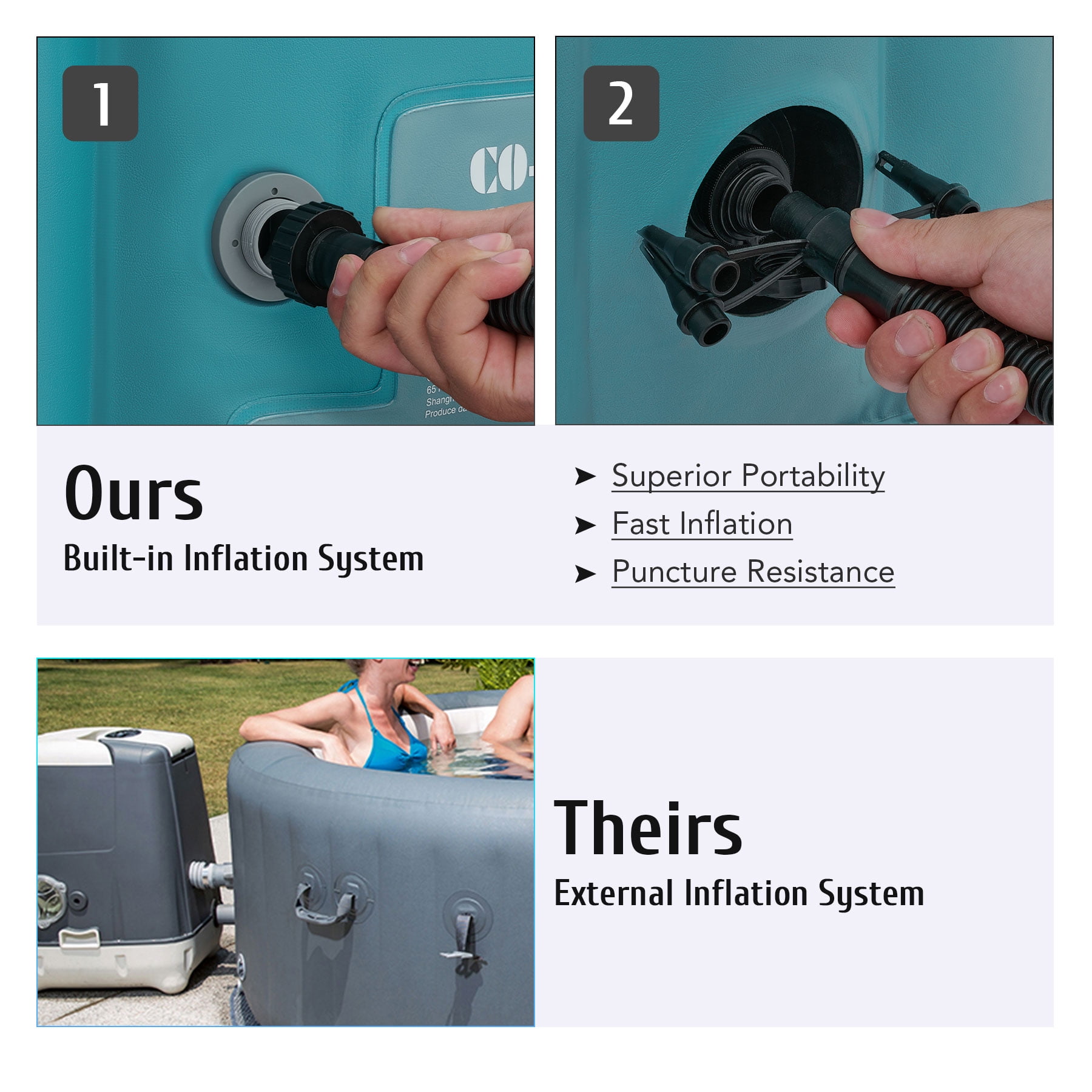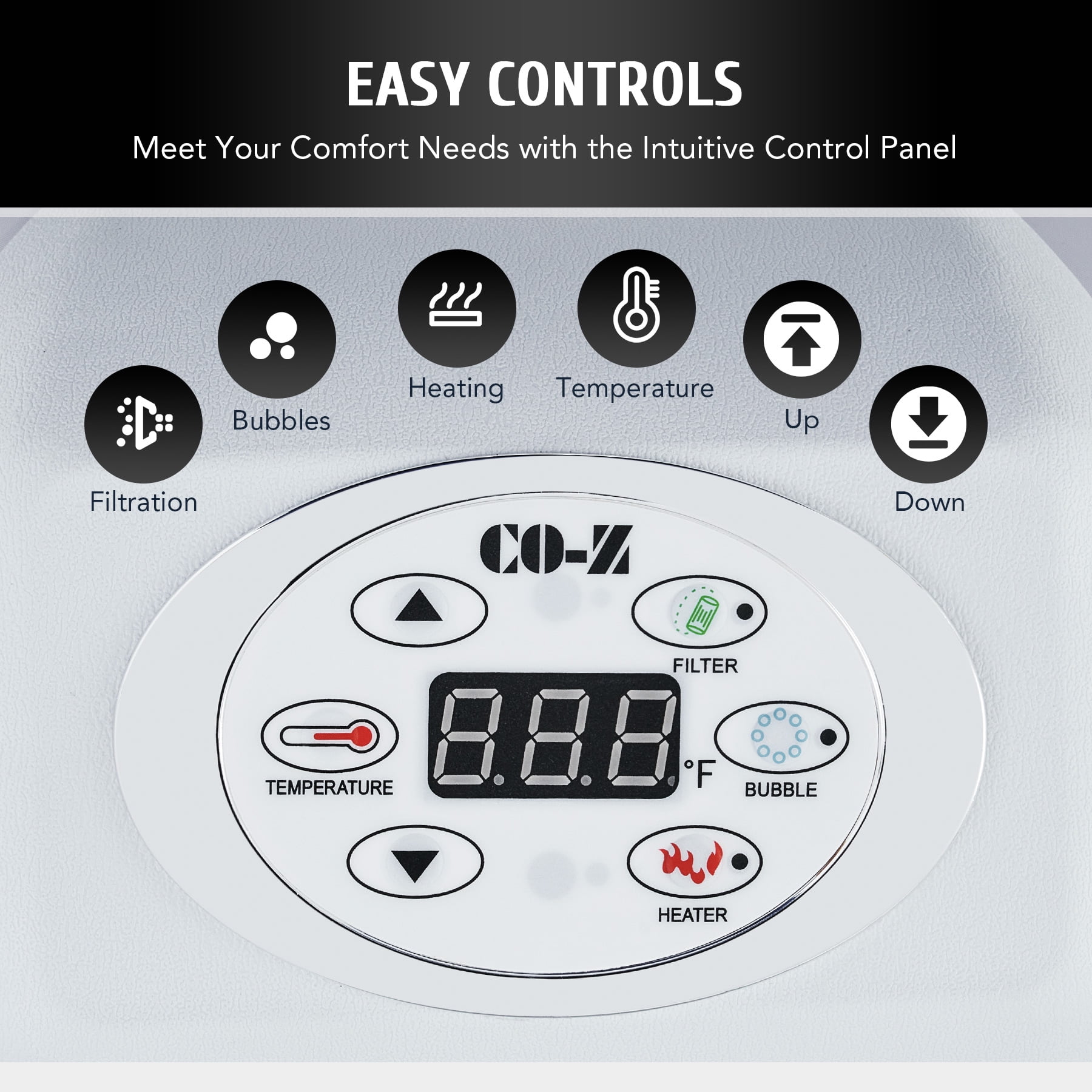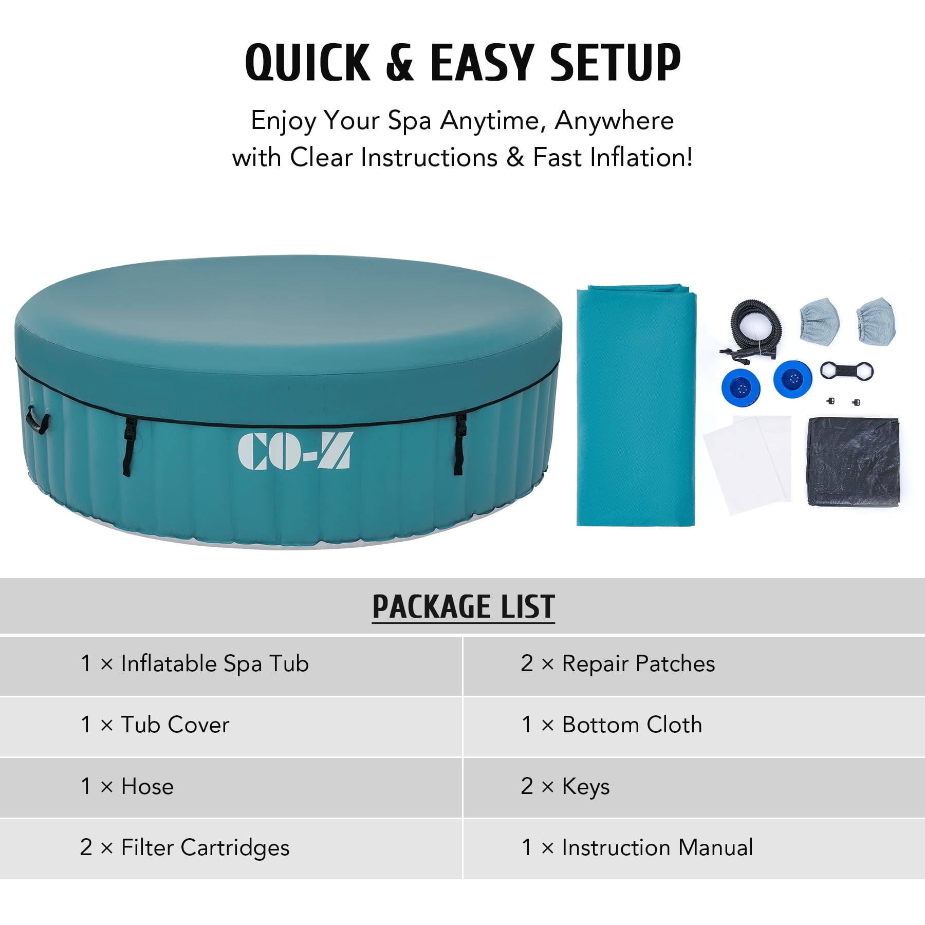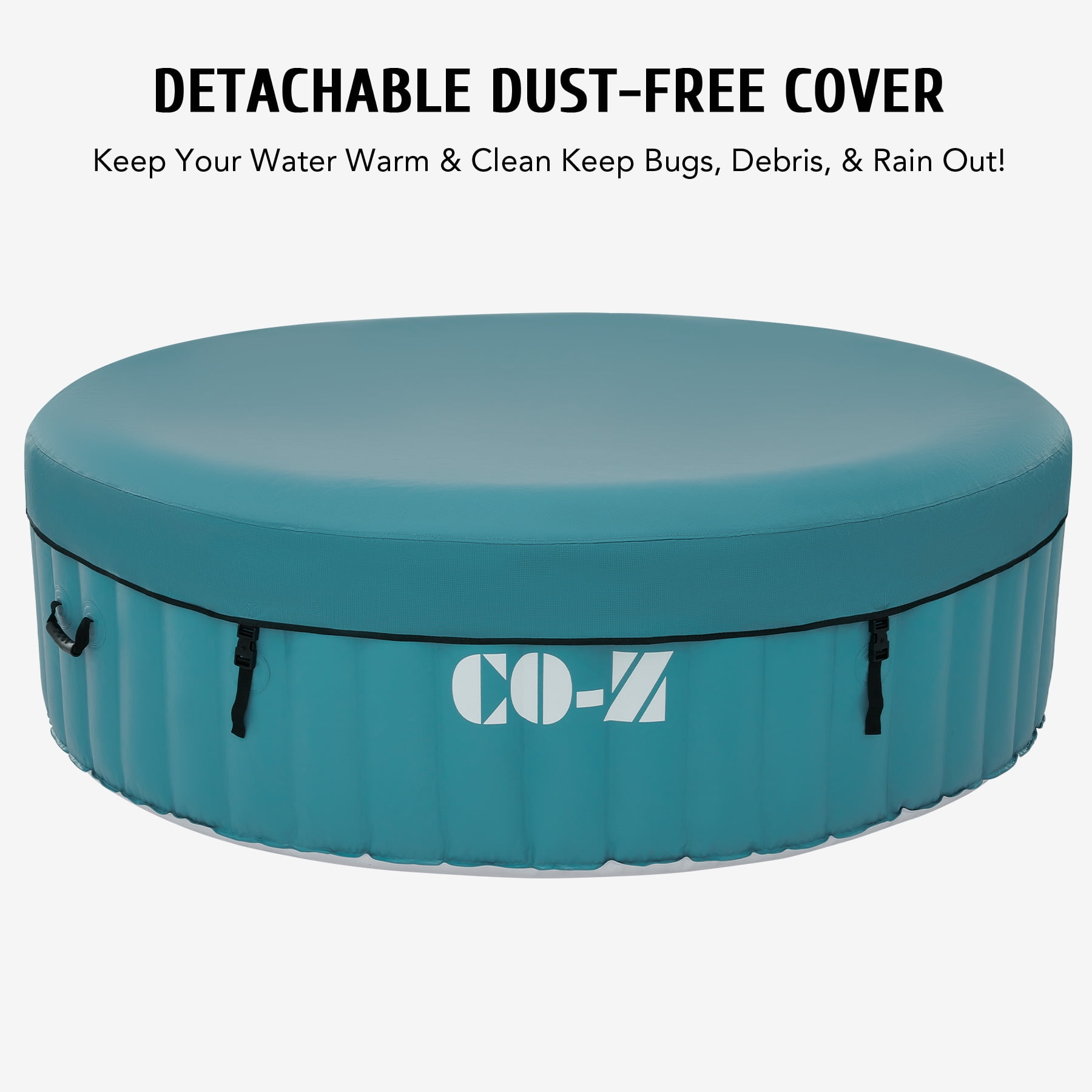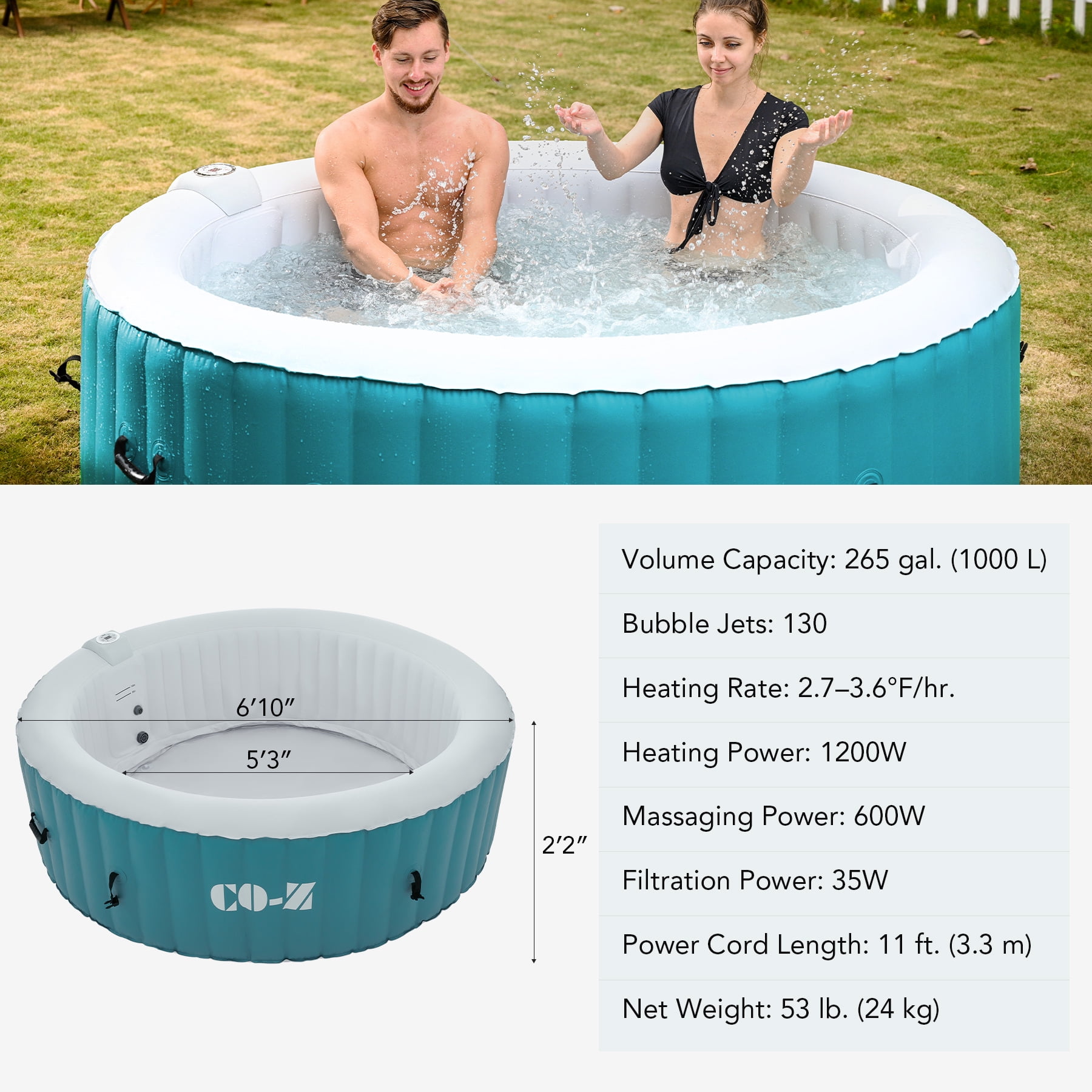 Click Here for the video of this item. Click Here for more types of this item. LUXURY SPA AT HOME: CO-Z’s inflatable hot tub, featuring upgraded 1350W heating tube to speed up heating, warms its 265 gallons to 104°F with a heating rate of 1-3°F per hour, complemented by 130 high-powered jets for abundant relaxation IDEAL FOR 4-6 ADULTS: Our 6 foot 10 inch wide hot tub accommodates up to six adults, letting you and yours fully enjoy your leisure time at home, on your patio, in the backyard, or elsewhere COZY & DURABLE: Crafted from quality PVC laminate, this mini pool offers ultimate support, durability, and comfort, providing puncture-proof quality and prolonged use while minimizing air leakage; newly added aluminum insulation effectively keeps the water warm and pesky bugs at bay EASY SETUP & TRANSPORT: Our portable hot tub is easy to set up thanks to the clear instructions; the provided electric air pump inflates it in under 8 minutes; and the convenient side handles make it a breeze to transport once inflated USER-FRIENDLY DESIGN: This mini pool includes everything you need for a true-to-spa experience; an intuitive control panel for easy operation, 2 fresh filter cartridges to keep the water fresh, and a sturdy valve for fast drainage Want all of the stress relieving magic of a roiling hot tub without all the expense and hassle of a permanent fixture? This versatile 6 foot 10 inch wide inflatable hot tub offers an array of advanced features, providing all the physical and mental health benefits of a traditional hot tub for you and your family and friends. Its newly added aluminum insulation & upgraded 1350W heating tube speed up the water heating process, warming up to 265 gallons of water to 104°F at a rate of 1-3°F per hour. The 130 high-powered jets surrounding the interior of the tub produce rejuvenating bubbles to offer a full-body massage. This tub is built to offer superior heat resistance while still maintaining a comfortable surface for ultimate relaxation. With the touch of a button on the intuitive control panel, you can easily customize the tub’s settings without setting foot out of this fountain of youth. Accommodating up to six adults, this outdoor pool enables you to unwind and relax in comfort wherever you like without permanently losing your patio, backyard, or garden space. Our convenient blow up bathtub also comes with a fitted cover to prevent heat loss or dust accumulation, as well as two filter cartridges for timely maintenance. This portable hot tub inflates in 6-8 minutes using its provided electric air pump and hose. When the party’s over, the tub’s built in drain quickly empties your water directly out of its valve. Everyone deserves a private spa to soak and relax in after a long day’s work. With our superior quality and user-friendly design, you’ll enjoy this convenient luxury for years to come! Specifications Material: PVC Color: Green Volume Capacity: 265 gal. (1000 L) Bubble Jets: 130 Heating Power: 1350W Jet Power: 600W Filtration Power: 35W Air Pump Power: 600W Dimensions: 6.8 x 6.8 x 2 ft. (2.1×2.1×0.65 m) Power Cord Length: 11 ft. (3.3 m) Weight: 53 lb. (24 kg) Package List 1 x Inflatable Hot Tub 1 x Hot Tub Cover 1 x Hose 2 x Filter Cartridges 2 x Filter Covers 2 x Repair Patches 1 x Base Cloth 1 x Wrench 2 x Buckle Keys 1 x Instruction Manual