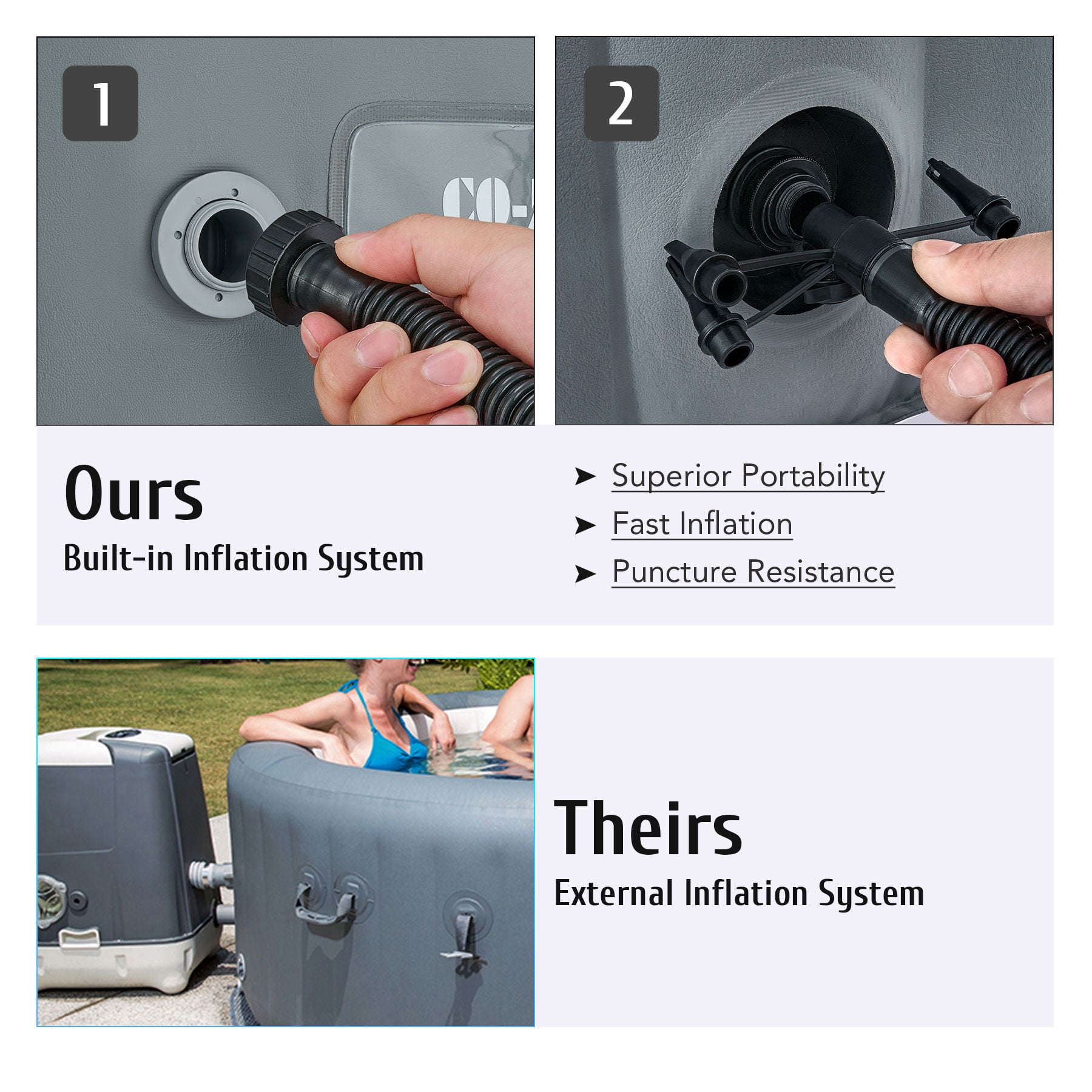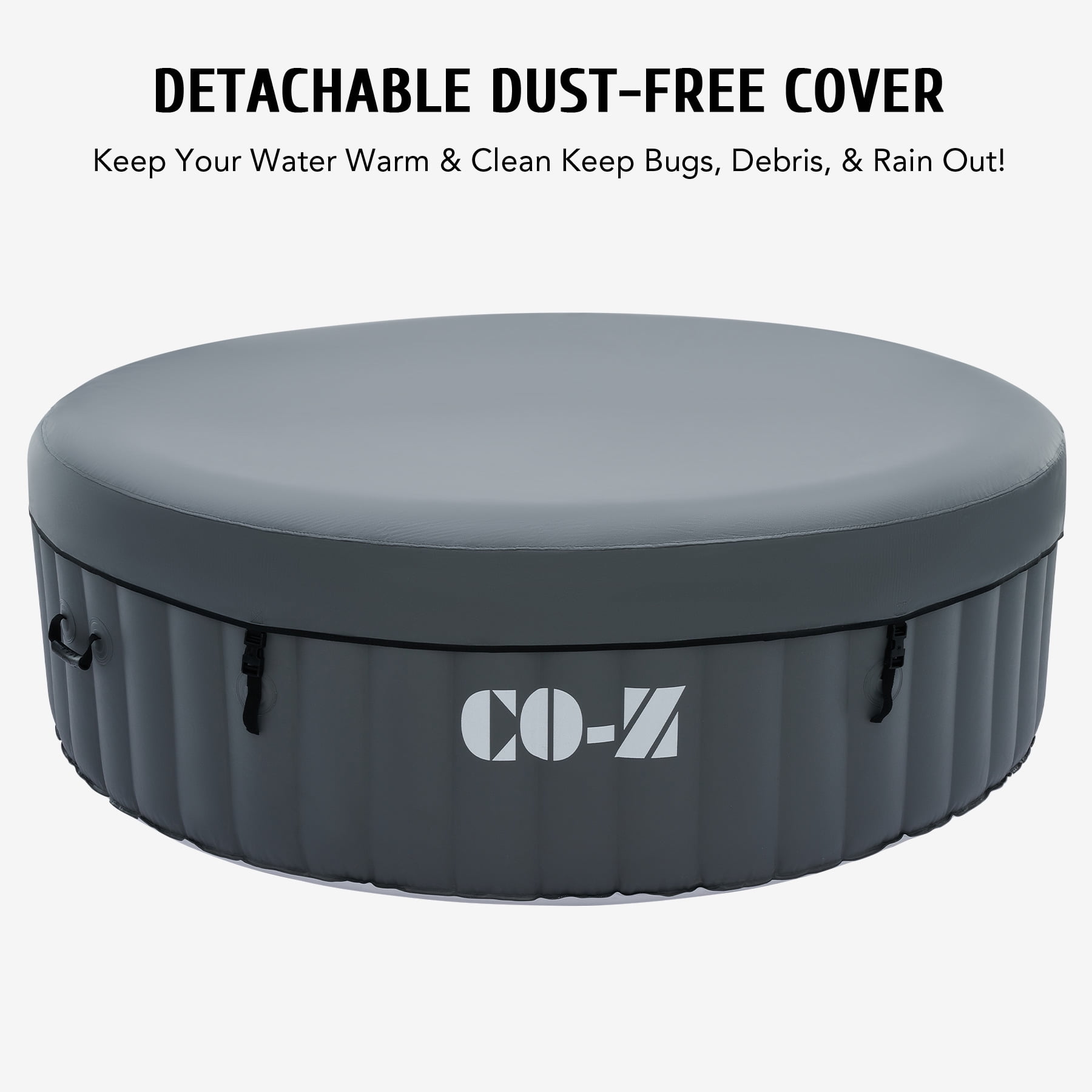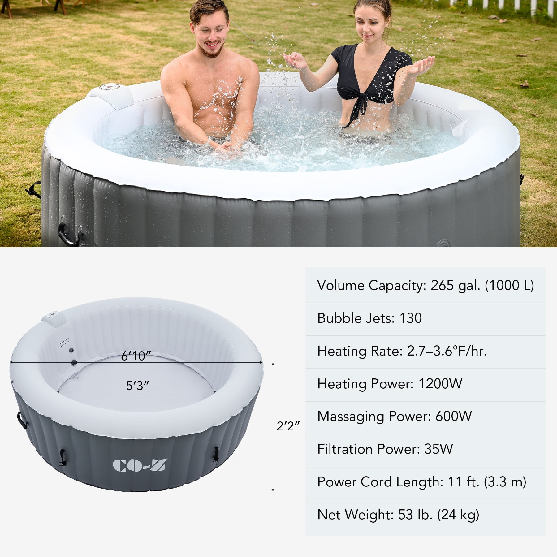 CO-Z 4-6 Person Inflatable Hot Tub with 130 Air Jets Electric Pump Air Beds Gray 53 lbs This 7 feet round hot tub holds up to 265 gallons, ideal for 4 to 6 adults 130 powerful jets create soothing bubbles for a full body massage experience Includes pool filters to maintain fresh water throughout all seasons Heats water up to 104°F for a relaxing soak after a long day User friendly design with an intuitive control panel for easy operation