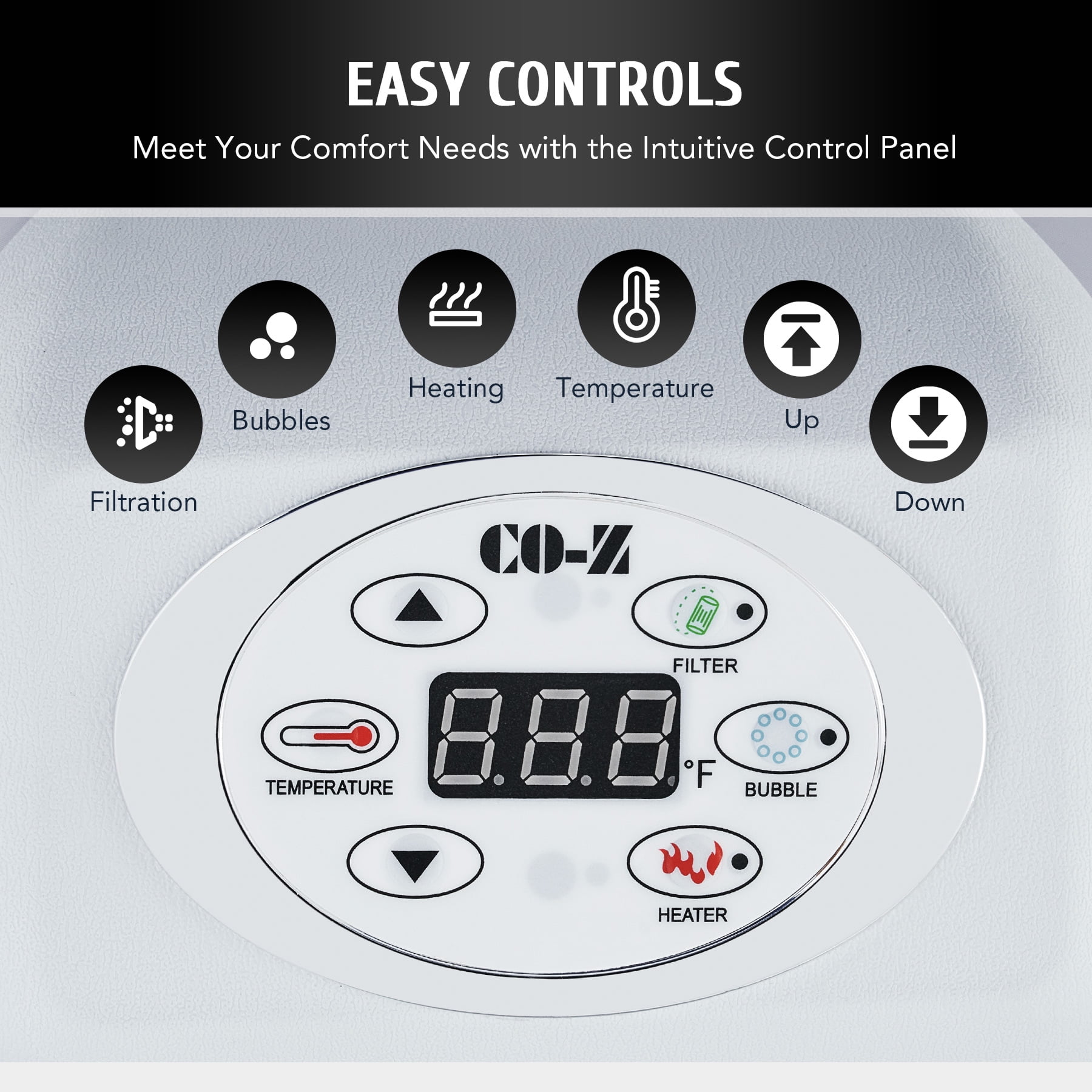 Click Here for the video of this item. LUXURY SPA AT HOME: CO-Z’s inflatable hot tub, featuring upgraded 1350W heating tube to speed up heating, warms its 265 gallons to 104°F with a heating rate of 1-3°F per hour, complemented by 130 high-powered jets for abundant relaxation IDEAL FOR 4-6 ADULTS: Our 6 feet 10 inches wide hot tub accommodates up to six adults, letting you and yours fully enjoy your leisure time at home, on your patio, in the backyard, or elsewhere COZY & DURABLE: Crafted from quality PVC laminate, this mini pool offers ultimate support, durability, and comfort, providing puncture-proof quality and prolonged use while minimizing air leakage; newly added aluminum insulation effectively keeps the water warm and pesky bugs at bay EASY SETUP & TRANSPORT: Our portable hot tub is easy to set up thanks to the clear instructions; the provided electric air pump inflates it in under 8 minutes; and the convenient side handles make it a breeze to transport once inflated USER-FRIENDLY DESIGN: This mini pool includes everything you need for a true-to-spa experience; an intuitive control panel for easy operation, 2 fresh filter cartridges to keep the water fresh, and a sturdy valve for fast drainage Want all of the stress relieving magic of a roiling hot tub without all the expense and hassle of a permanent fixture? This versatile 6 foot 10 inch wide inflatable hot tub offers an array of advanced features, providing all the physical and mental health benefits of a traditional hot tub for you and your family and friends. Its newly added aluminum insulation & upgraded 1350W heating tube speed up the water heating process, warming up to 265 gallons of water to 104°F at a rate of 1-3°F per hour. The 130 high-powered jets surrounding the interior of the tub produce rejuvenating bubbles to offer a full-body massage. This tub is built to offer superior heat resistance while still maintaining a comfortable surface for ultimate relaxation. With the touch of a button on the intuitive control panel, you can easily customize the tub’s settings without setting foot out of this fountain of youth. Accommodating up to six adults, this outdoor pool enables you to unwind and relax in comfort wherever you like without permanently losing your patio, backyard, or garden space. Our convenient blow up bathtub also comes with a fitted cover to prevent heat loss or dust accumulation, as well as two filter cartridges for timely maintenance. This portable hot tub inflates in 6-8 minutes using its provided electric air pump and hose. When the party’s over, the tub’s built in drain quickly empties your water directly out of its valve. Everyone deserves a private spa to soak and relax in after a long day’s work. With our superior quality and user-friendly design, you’ll enjoy this convenient luxury for years to come! Specifications Material: PVC Color: Gray Volume Capacity: 265 gal. (1000 L) Bubble Jets: 130 Heating Power: 1350W Jet Power: 600W Filtration Power: 35W Air Pump Power: 600W Dimensions: 6.8 x 6.8 x 2 ft. (2.1×2.1×0.65 m) Power Cord Length: 11 ft. (3.3 m) Weight: 53 lb. (24 kg) Package List 1 x Inflatable Hot Tub 1 x Hot Tub Cover 1 x Hose 2 x Filter Cartridges 2 x Filter Covers 2 x Repair Patches 1 x Base Cloth 1 x Wrench 2 x Buckle Keys 1 x Instruction Manual