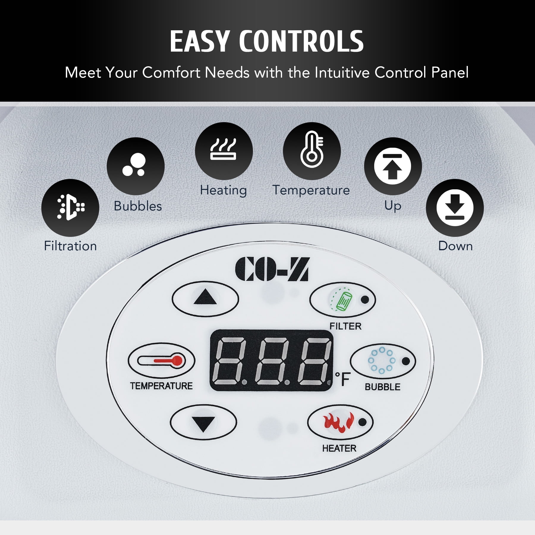 LUXURY SPA AT HOME: This inflatable hot tub heats up to 211 gallons to 104°F at a rate of 1-3°F per hour depending on the surrounding temperature and produces rejuvenating bubbles at just the right intensity from its 120 high powered jets to offer abundant relaxation IDEAL FOR 2-4 ADULTS: Our 6 foot wide hot tub accommodates up to four adults, letting you and yours fully enjoy your leisure time at home, on your patio, in the backyard, or elsewhere USER-FRIENDLY DESIGN: This round mini pool includes everything you need for a true-to-spa experience; an intuitive control panel for easy operation, a detachable locking cover to keep your tub clean between uses, 2 fresh filter cartridges to keep the water fresh, and a sturdy valve for fast drainage EASY SETUP & TRANSPORT: Our portable hot tub is easy to set up thanks to the clear instructions; the provided electric air pump inflates it in under 8 minutes; and the convenient side handles make it a breeze to transport once inflated DURABLE CONSTRUCTION: This heated spa tub is made of puncture proof laminated PVC for ultimate support, durability, and comfort, ensuring that you’ll enjoy soothing soaks for years to come Want all of the stress relieving magic of a roiling hot tub without all the expense and hassle of a permanent fixture? This versatile 6 foot wide inflatable hot tub offers an array of advanced features, providing all the physical and mental health benefits of a traditional hot tub for you and your family and friends. Its sophisticated heating system heats up to 211 gallons of water to 104°F at a rate of 1-3°F per hour depending on the ambient temperature, while 120 high-powered jets surrounding the interior of the tub produce rejuvenating bubbles to offer a full body massage. This tub is built to offer superior heat resistance while still maintaining a comfortable surface for ultimate relaxation. With the touch of a button on the intuitive control panel, you can easily customize the tub’s settings without setting foot out of this fountain of youth. Accommodating up to four adults, this outdoor pool enables you to unwind and relax in comfort wherever you like without permanently losing your patio, backyard, or garden space. Our convenient blow up bathtub also comes with a fitted cover to prevent heat loss or dust accumulation, as well as two filter cartridges for timely maintenance. This portable hot tub inflates in 6-8 minutes using its provided electric air pump and hose. When the party’s over, the tub’s built in drain quickly empties your water directly out of its valve. Everyone deserves a private spa to soak and relax in after a long day’s work. With our superior quality and user-friendly design, you’ll enjoy this convenient luxury for years to come! Specifications Material: PVC Color: Black Volume Capacity: 211 gal. (800 L) Bubble Jets: 120 Heating Power: 1200W Heating Rate: 1-3°F/hr. Jet Power: 600W Filtration Power: 35W Air Pump Power: 600W Dimensions: 6x6x2 ft. (1.8×1.8×0.65 m) Power Cord Length: 11 ft. (3.3 m) Weight: 49 lb. (21 kg) Package Lis 1 x Inflatable Hot Tub 1 x Hot Tub Cover 1 x Hose 2 x Filter Cartridges 2 x Filter Covers 1 x Wrench 2 x Repair Patches 2 x Buckle Keys 1 x Instruction Manual