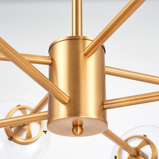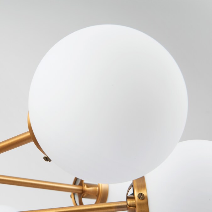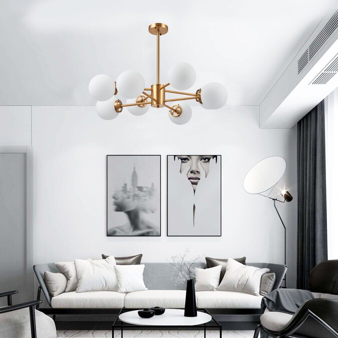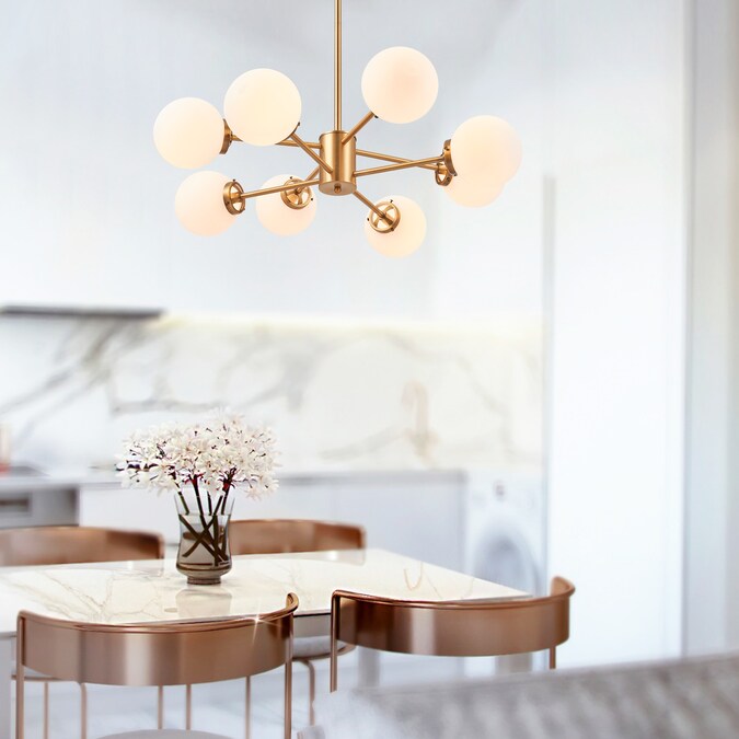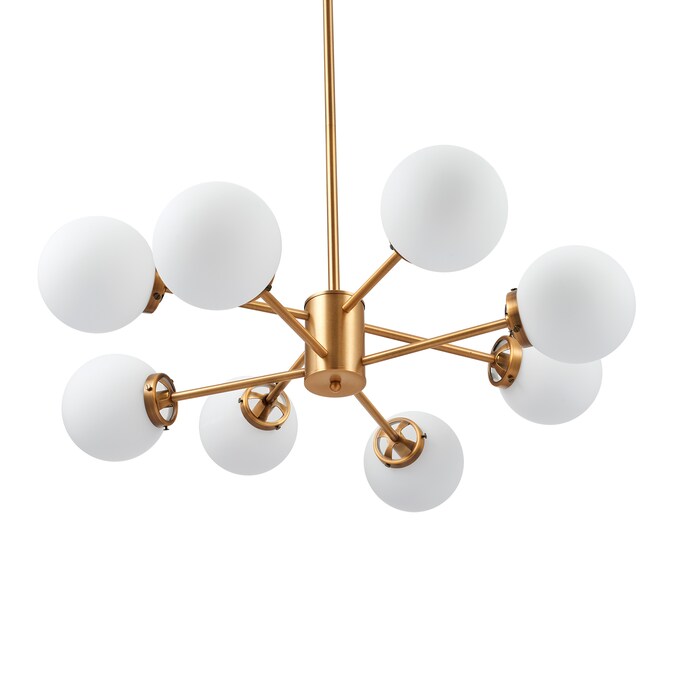 Inspired by the mid-century sputnik design, this modern light fixture is adorned with 8 spherical pendants attached to linear brass/gold rods. The cylindrical base is attached to a 44-inch rod creating an elegant structure for a bold statement piece in your living room, dining room or kitchen. Illuminate the room and choose between our round white opal shades or our clear glass coverings. The polished brass hardware brings an element of sophistication that can accentuate all styles of interior design. Each socket takes 60W bulbs (not included) and the overall height is 32.50” x 44”.