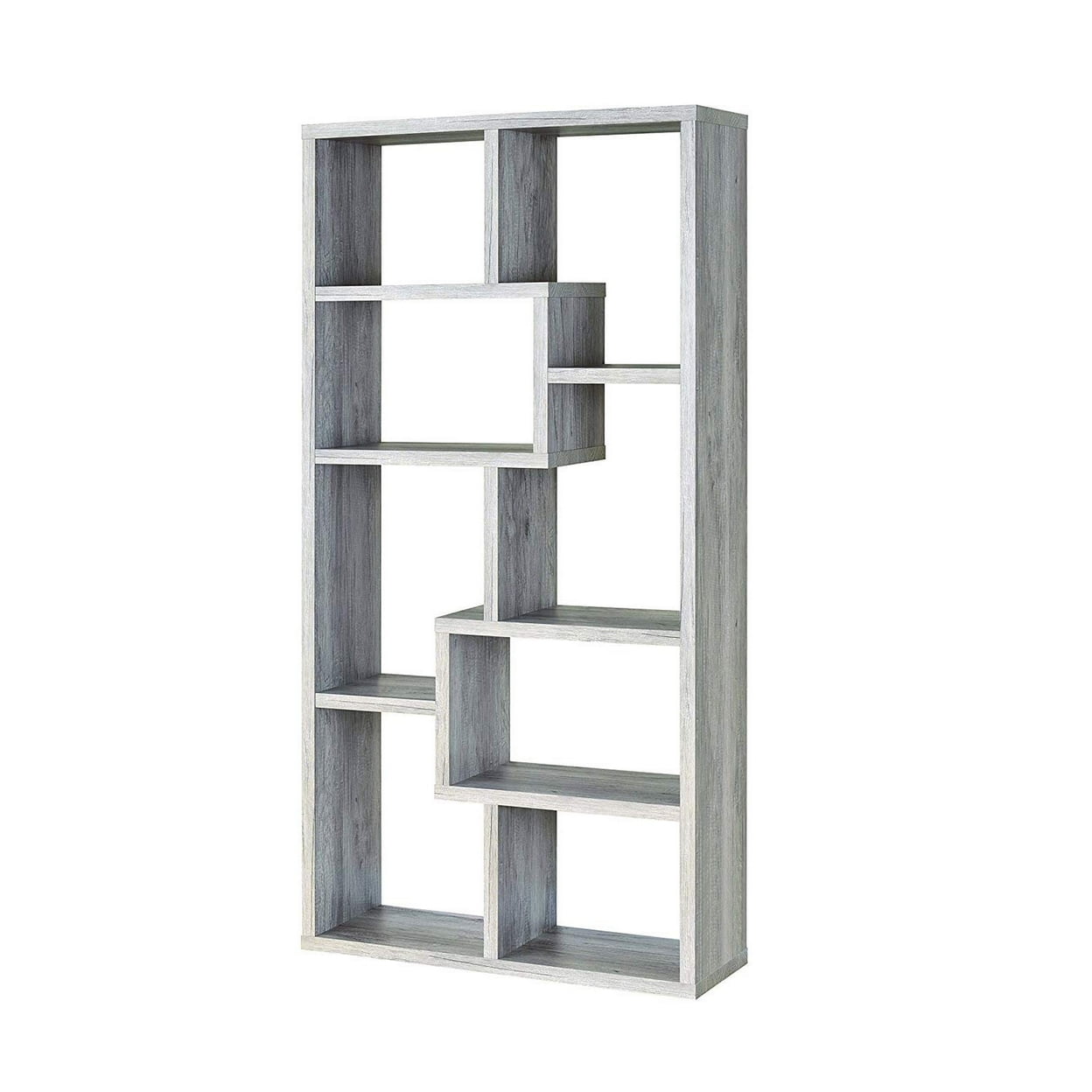 Includes: One (1) bookcase Wood finish: Gray driftwood Material: MDF, Particle Board, and Laminate Geometric bookcase with a seemingly random pattern of boxes creates an attention-grabbing display for your favorite keepsakes and books Ten (10) shelves provide ample display space
