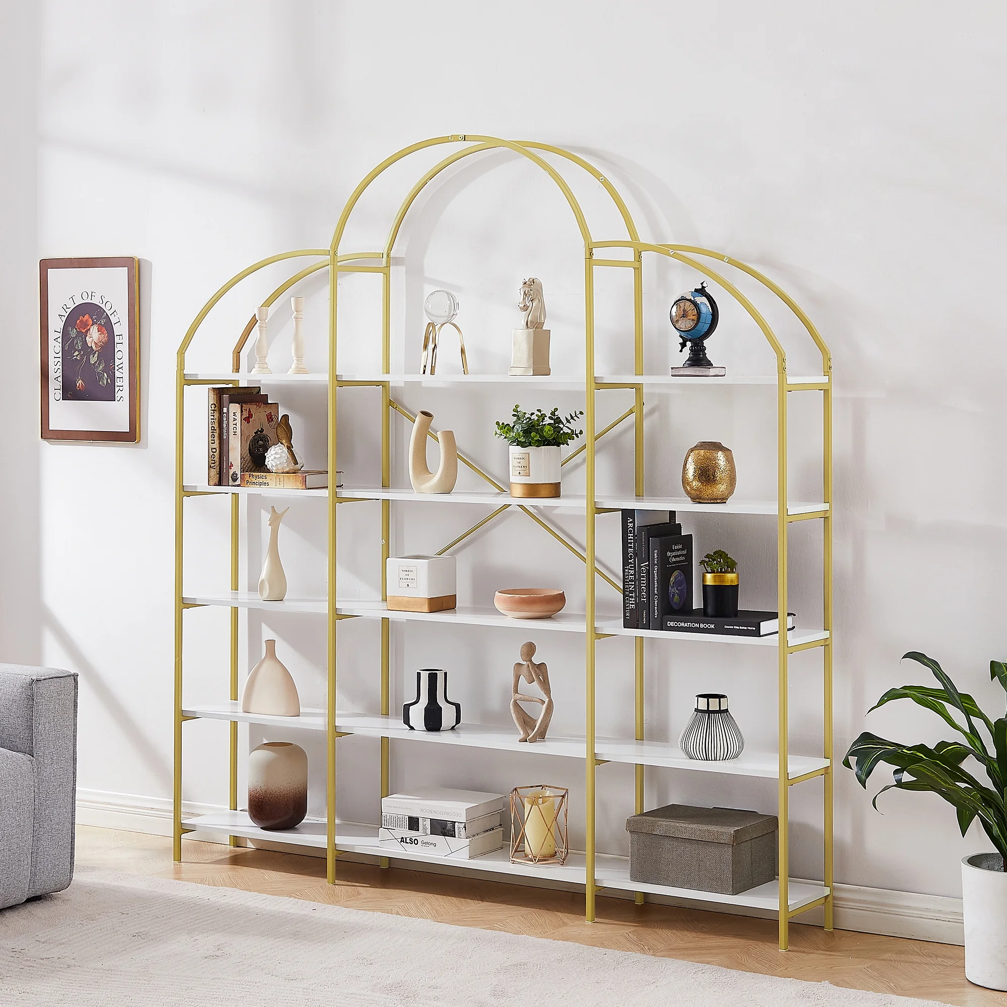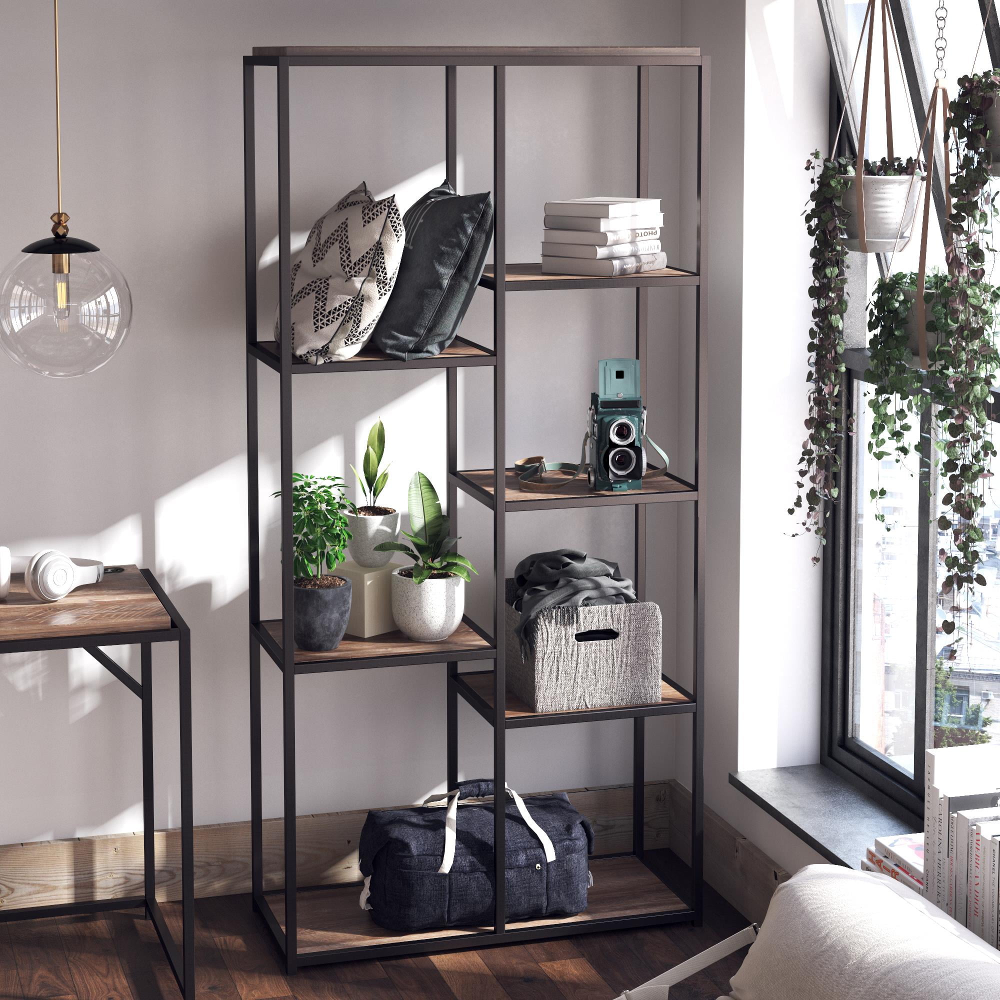 Tall and spacious, this bookcase sends a positive message. Enjoy a modern configuration with traditional appeal. Puzzle-like construction blends various widths and heights in eight compartments. Perfect for compact areas, its height frees up horizontal space. Make use of room to display and organize books, photos, and decor objects. Features: Includes: One (1) bookcase Wood finish: Gray driftwood Material: MDF, Particle Board, and Laminate Geometric bookcase with a seemingly random pattern of boxes creates an attention-grabbing display for your favorite keepsakes and books Ten (10) shelves provide ample display space Specifications: Product Dimensions: 70.75″H x 35″W x 11.75″D Product Weight: 63.8 lbs Number of Shelves: 10 Assembly Required: Yes Warranty: One (1) year limited manufacturer warranty