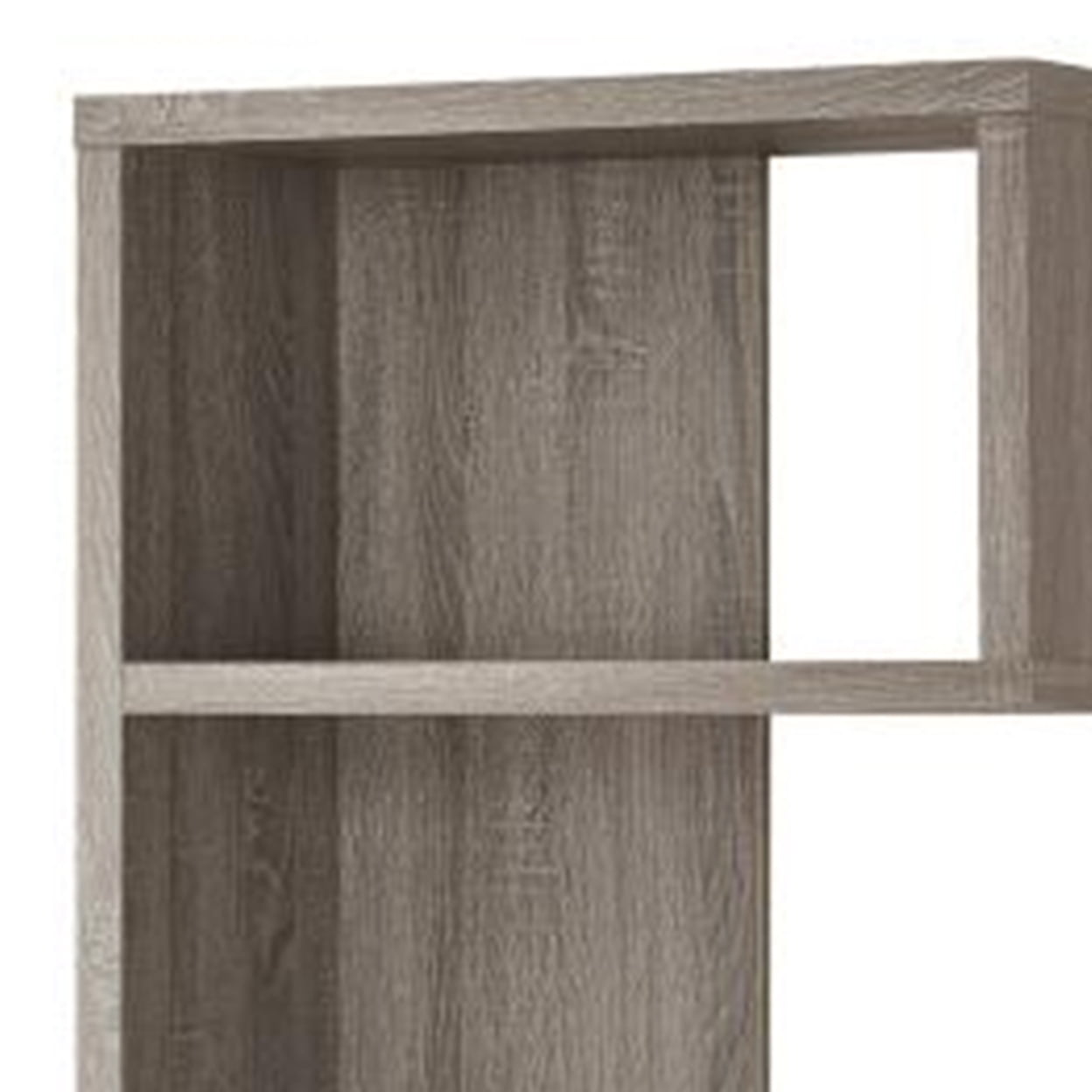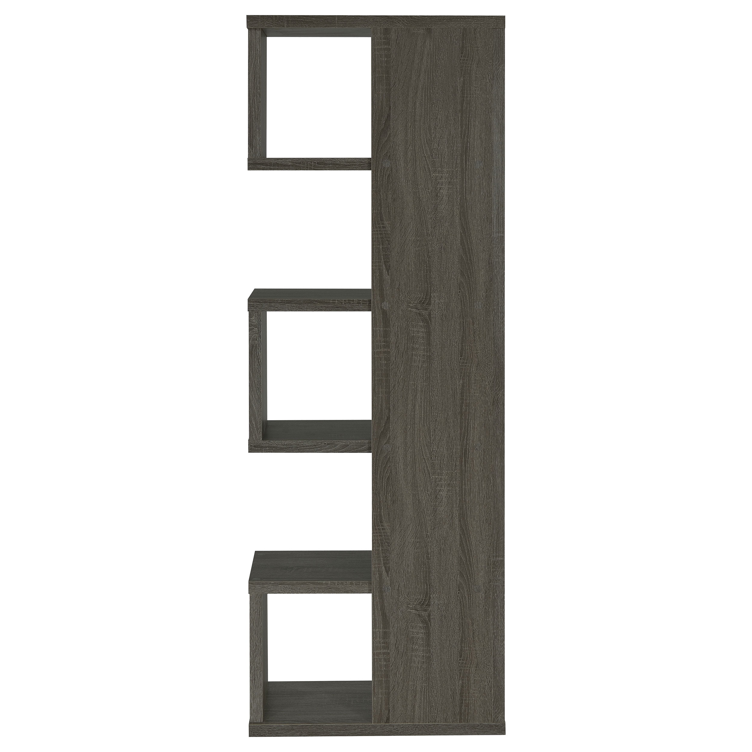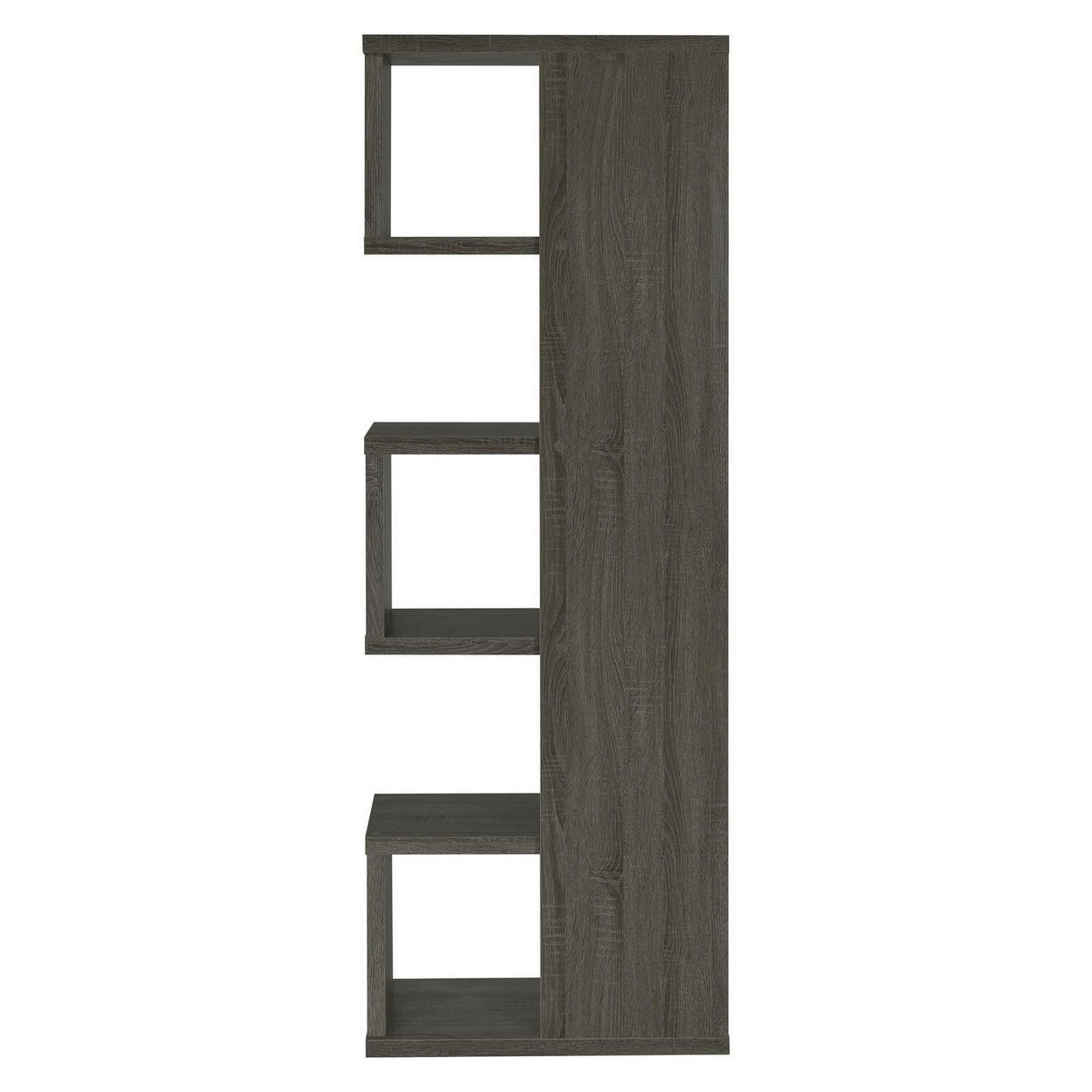 Includes: One (1) bookcase Finish: Weathered Gray Materials: Melamine Paper, Hollow Board, Particle Board, Wood Modern bookcase features sculptural combination of alternating boxes and open shelves for artistic appeal This bookcase can be flipped 180 degrees MDF, particle board, and laminate construction