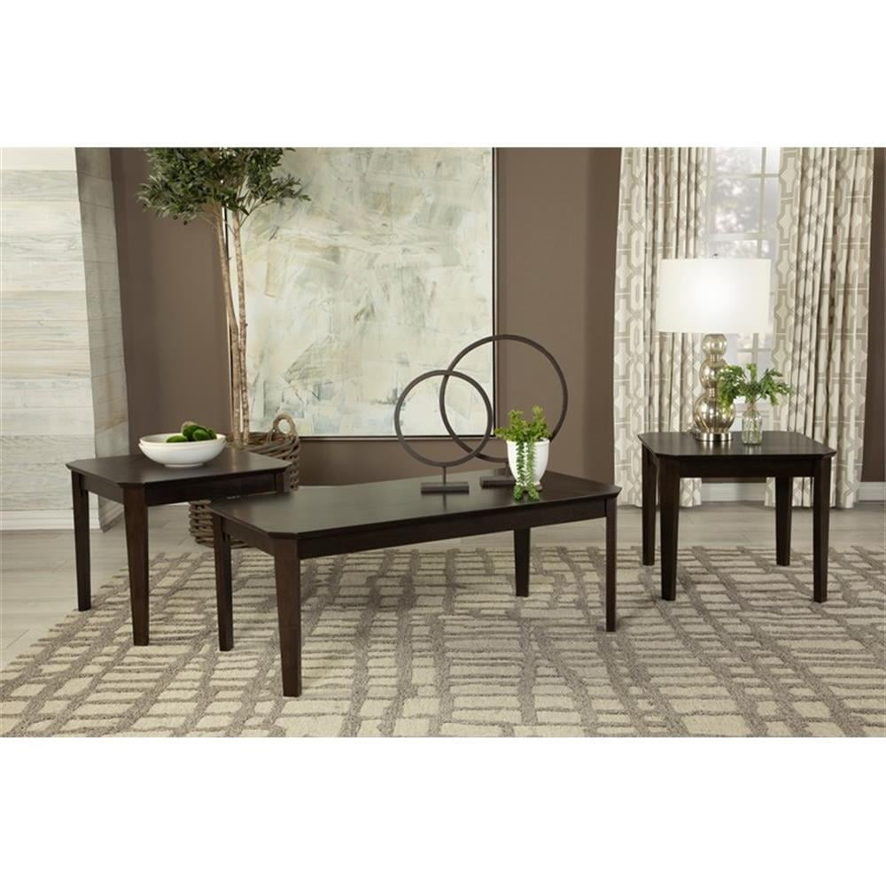Casual style and simple lines enhance this three-piece occasional table set. Complete with a coffee table and two end tables, each furniture piece offers a rich, dark brown finish that lends a traditional flair. A smooth tabletop also features notched corners that soften the edges. Slim and straight legs extend to the floor and offer a subtle tapered foot. Place this coffee table and two end tables in a compact living room space for a touch of warmth and class. Features: Includes: One (1) coffee table and two (2) end tables Finish: Dark Brown Materials: Asian hardwood, okume veneer, MDF Perfect trio for smaller-scale furniture Three piece set includes rectangular coffee table and two square end tables Table top edge profile: Reserve profile Specifications: Product Dimensions: Coffee table – 18″H x 47.25″W x 23.5″D Product Dimensions: End table – 20.25″H x 23.5″W x 23.5″D Product Weight: Overall – 69.47 lbs Product Weight: Coffee table – 30.89 lbs Product Weight: End table – 19.29 lbs Assembly Required: Yes Assembly details: Full assembly required Warranty: One (1) year limited manufacturer warranty