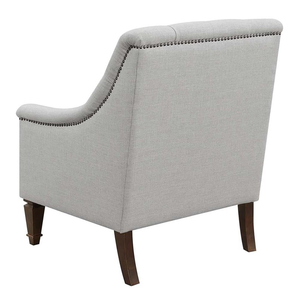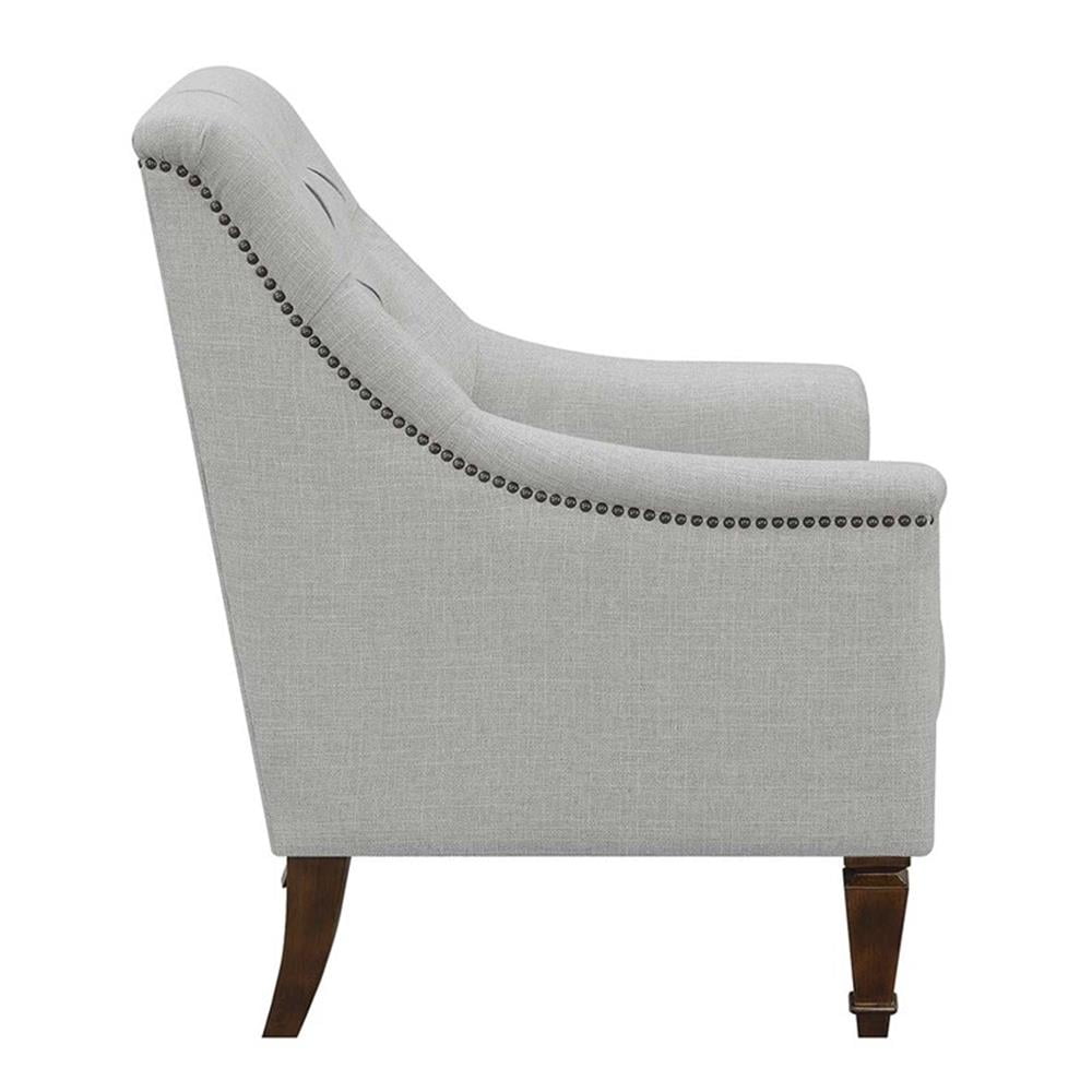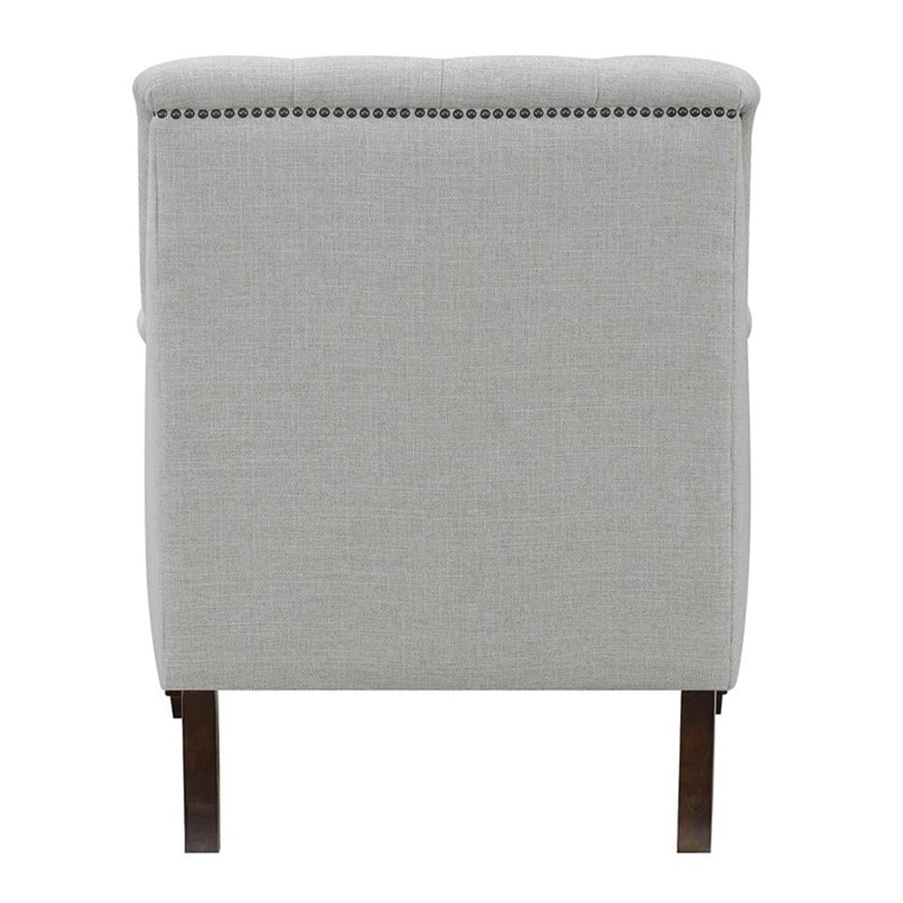 Includes: One (1) chair Upholstery: Gray Finish: Brown Materials: Woven Fabric, Pine Wood, Rubberwood Material content: 100% polyester Cleaning code: W-S A modern spin on a classic traditional living room collection Soft, gray linen-like upholstery Button tufted seat and backrest Beautiful detailed solid wood legs create the perfect foundation This collection is also available in gray velvet with chrome and silver accents Cushions: Seat – Attached; Back – Tight Leveler/ plastic glide: Plastic glide Decking construction: Back – Sinuous spring; Seat – Sinuous spring Movement: Stationary