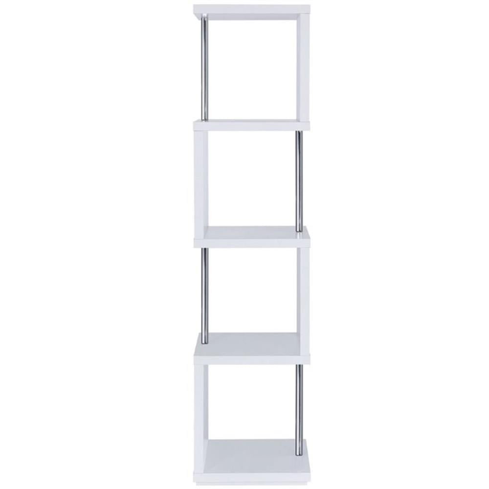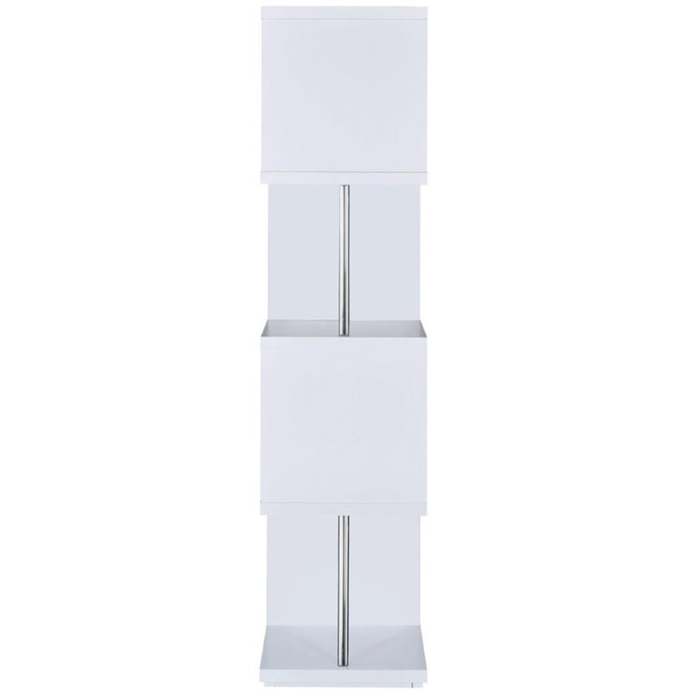 Go with the flow in a modern space with an edgy, artistic look. This four-tier bookcase is a great option for a compact space. Enjoy a modular, geometric silhouette and a choice of finishes. Steel supports reinforce shelving that hosts books and decor. Choose from finishes that intensify the attitude of your custom space. Features: Includes: One (1) bookcase Wood finish: White Metal finish: Chrome Material: Metal, MDF, Particle Board, and Laminate An eye-catching geometric design makes this bookcase ideal for a contemporary home Modern bookcase with four (4) tiers of shelving and electroplated chrome metal details Specifications: Product Dimensions: 66.5″H x 15.5″W x 15.5″D Product Weight: 36.3 lbs Number of Shelves: 4 Assembly Required: Yes Warranty: One (1) year limited manufacturer warranty