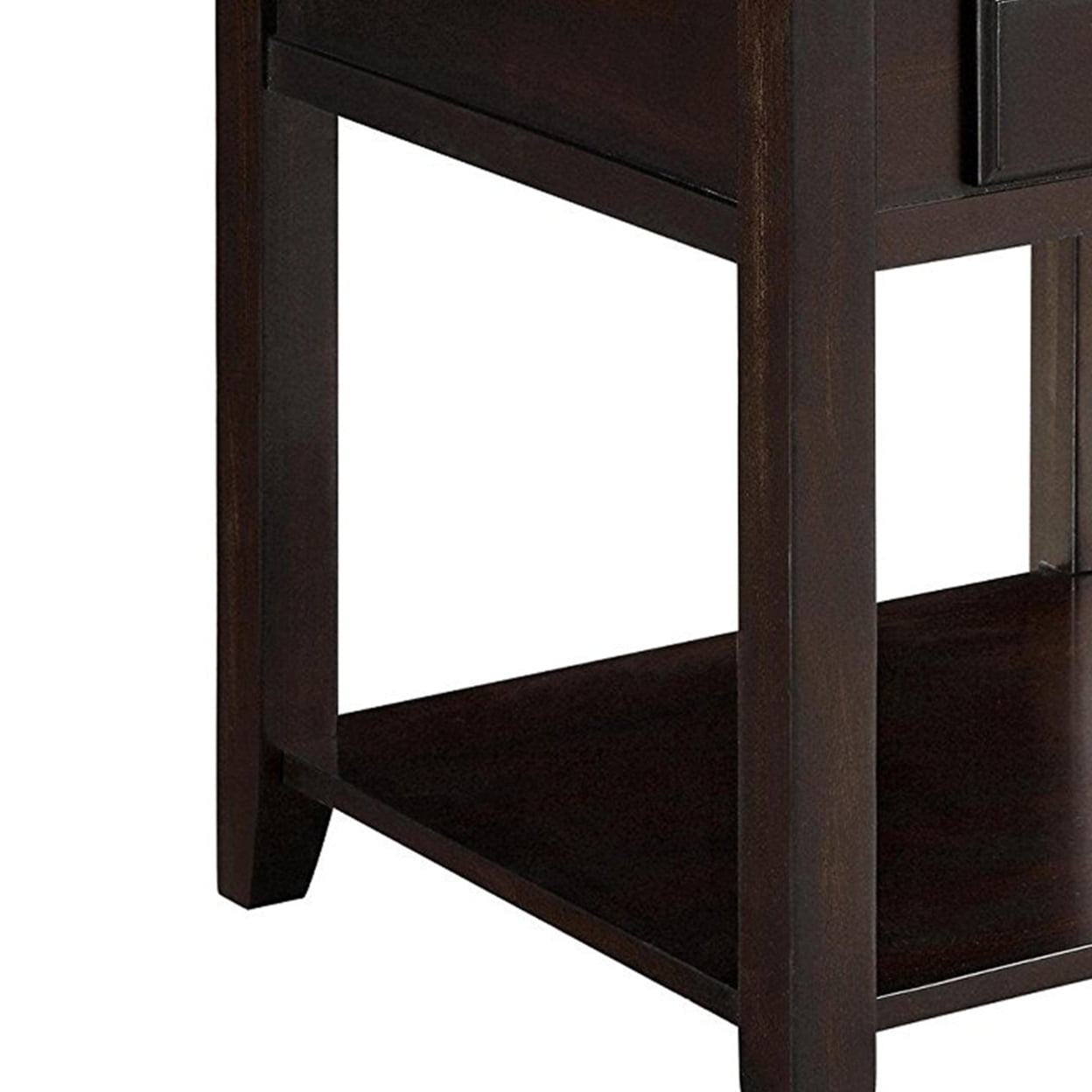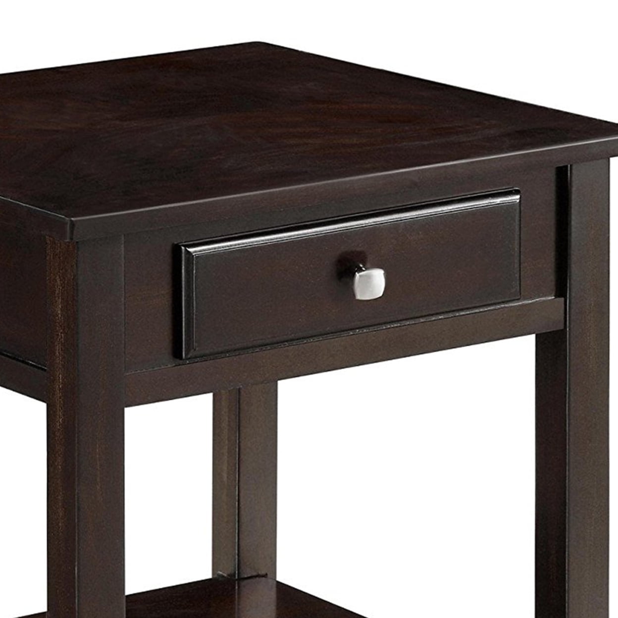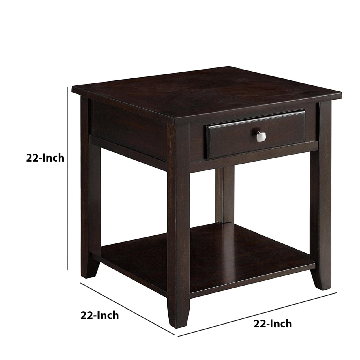 Sleek and stunning, this classic wood end table is full of clean lines. With smooth edges, the silhouette features one drawer with bright metallic hardware. In a walnut finish, the rich hues add depth next to any sofa. Decorate the refined details with your favorite lamp or with a vase of fresh flowers. The perfect combination of traditional and modern, this charming piece creates structure. Features: Include: One (1) end table Finish: Walnut Materials: Wood, Birch Veneer, MDF, Plywood, Poplar Wood Stylish transitional occasional table set Rich, warm walnut finish Sleek, straight silhouette Lower shelves for added storage Drawer structure: Pin construction Drawer glide: Wood on wood glide Felt lined drawers: Yes Hardware type: Metal knob Leveler/ plastic glide: Plastic glide Shape: Square Specifications: Product Dimensions: 22″H x 22″W x 22″D Product Weight: 26.27 lbs Number of Drawers: 1 Number of Shelves: 1 Assembly Required: Yes Warranty: One (1) year limited manufacturer warranty