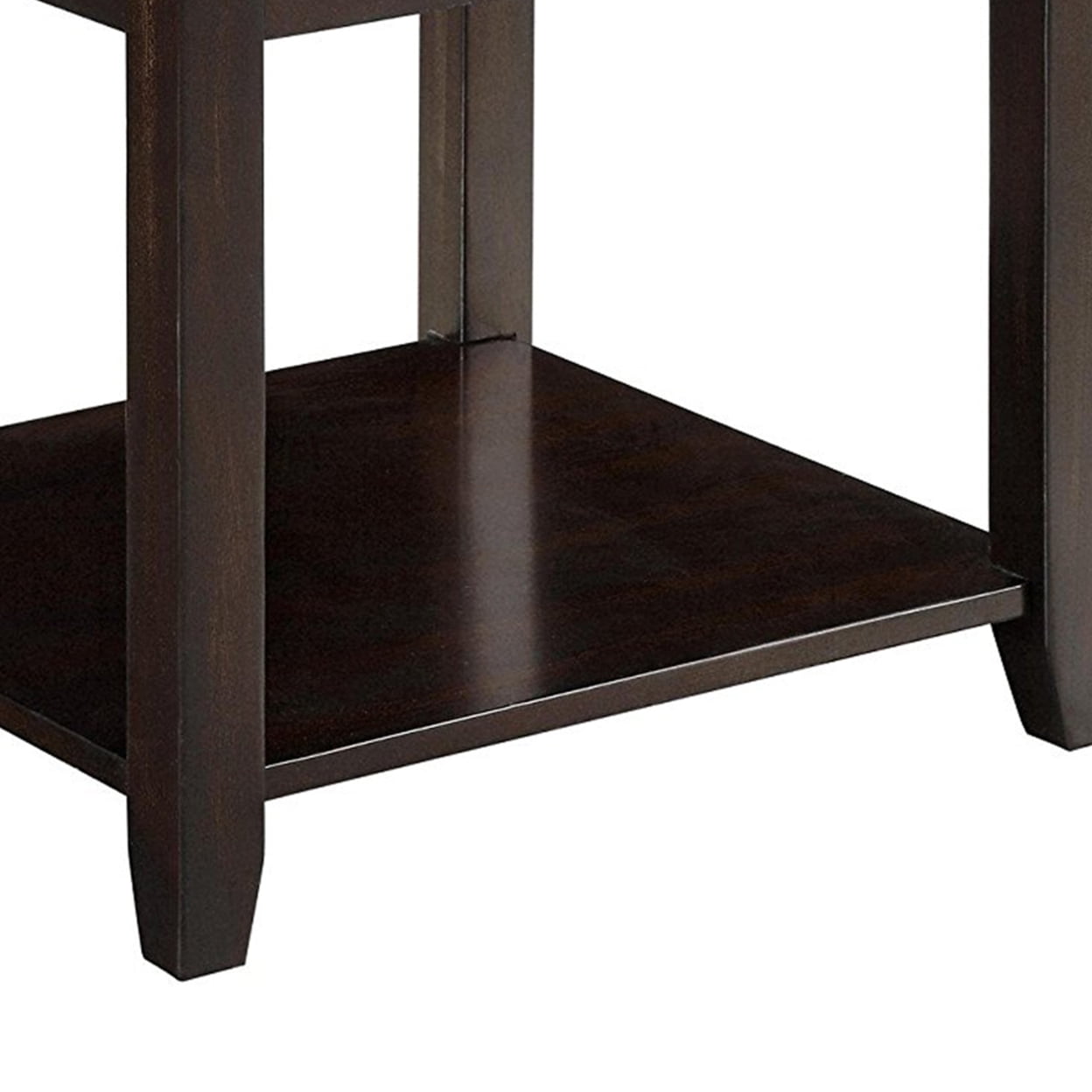 Include: One (1) end table Finish: Walnut Materials: Wood, Birch Veneer, MDF, Plywood, Poplar Wood Stylish transitional occasional table set Rich, warm walnut finish Sleek, straight silhouette Lower shelves for added storage Drawer structure: Pin construction Drawer glide: Wood on wood glide Felt lined drawers: Yes Hardware type: Metal knob Leveler/ plastic glide: Plastic glide Shape: Square