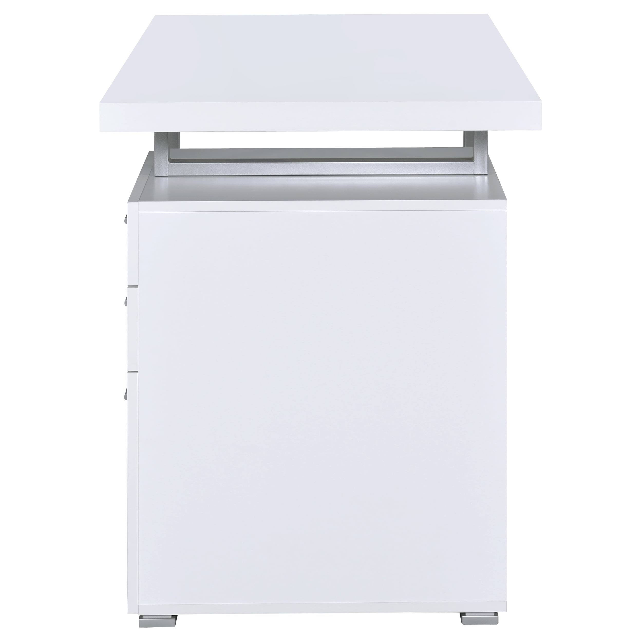 Home office desk with white finish and silver metal frame File cabinet holds legal and letter size files Reversible set up 3 storage drawers for plenty of space Constructed of steel, MDF, particle board, and veneer Drawers: Euro glides Style: Contemporary Finish: White wood finish with silver metal frame Dimensions (D x W x H): 23.5 x 47.25 x 30 inches Weight: 73 pounds Manufacturer warranty: 1-year warranty