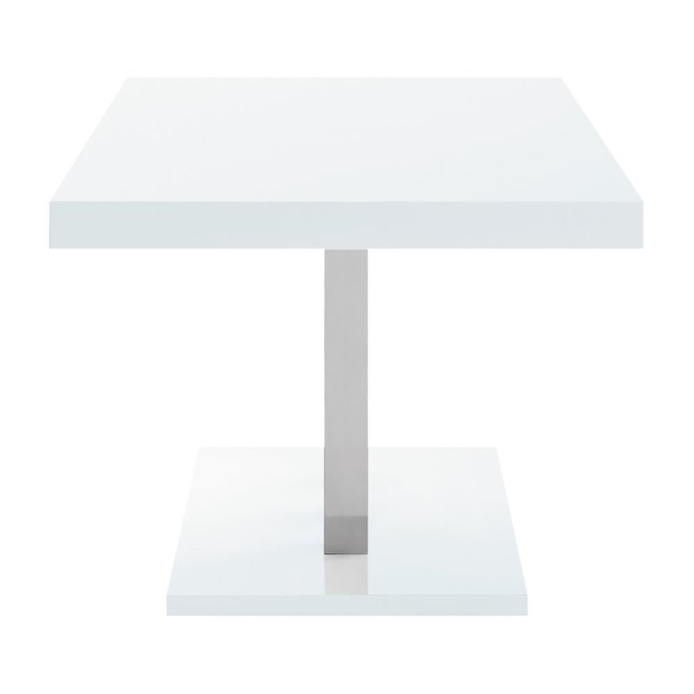 Include: One (1) table Finish: White High Gloss Metal finish: Chrome Materials: MDF, Stainless Steel, Wood Simple, clean contemporary dining table features a steel base with a chrome finish Shape: Rectangular
