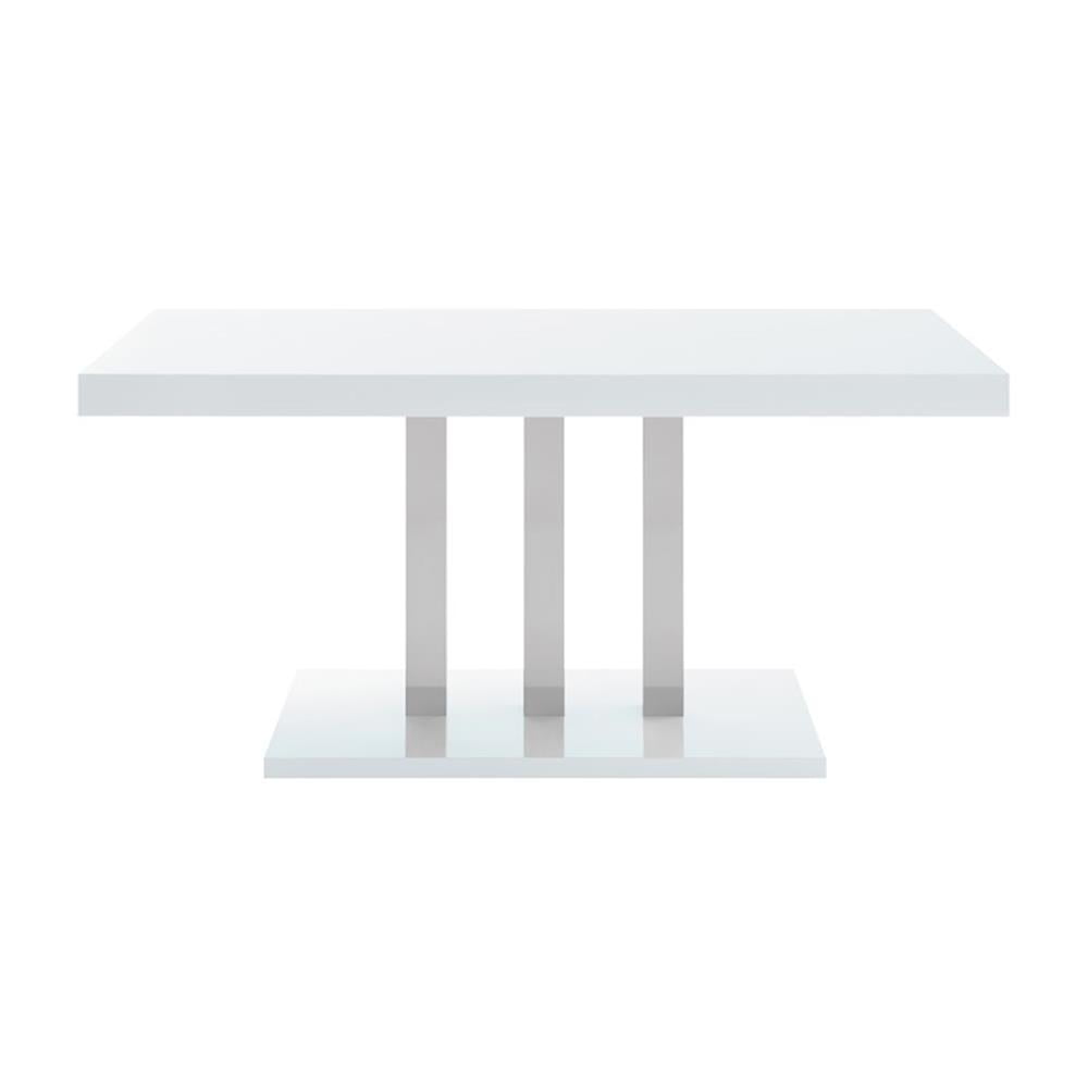 Sleek lines and smooth materials come together to create this ultra-modern dining table. Designed with a spacious rectangular top in a white high gloss finish that lends a polished, formal flair, this dining table offers up a chic style to formal entertaining spaces. Mirroring the top is a flush base, offering extra support and stability. With a pedestal-like design, the top and base come together with a trio of polished stainless steel supports in a lustrous and gleaming chrome finish. Place this dining table in a dining area for a jaw-dropping look. Features: Include: One (1) table Finish: White High Gloss Metal finish: Chrome Materials: MDF, Stainless Steel, Wood Simple, clean contemporary dining table features a steel base with a chrome finish Shape: Rectangular Specifications: Product Dimensions: 29.5″H x 63″L x 35.5″W Product Weight: 115.06 lbs Maximum Seating Capacity: 6 Assembly Required: Yes Warranty: One (1) year limited manufacturer warranty