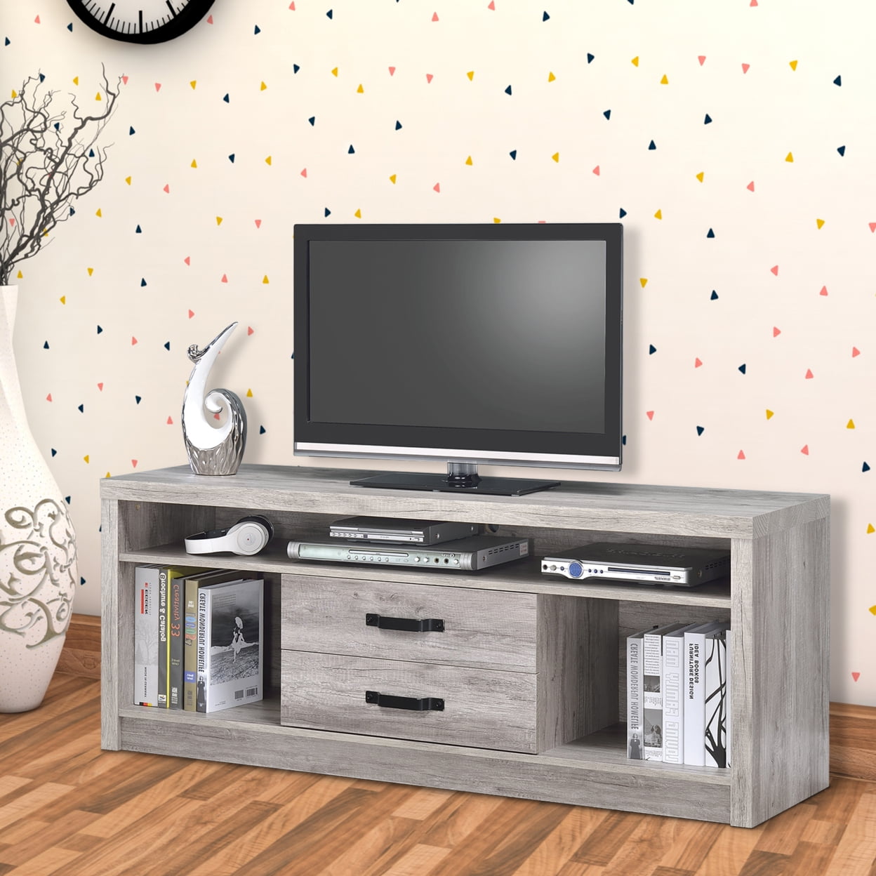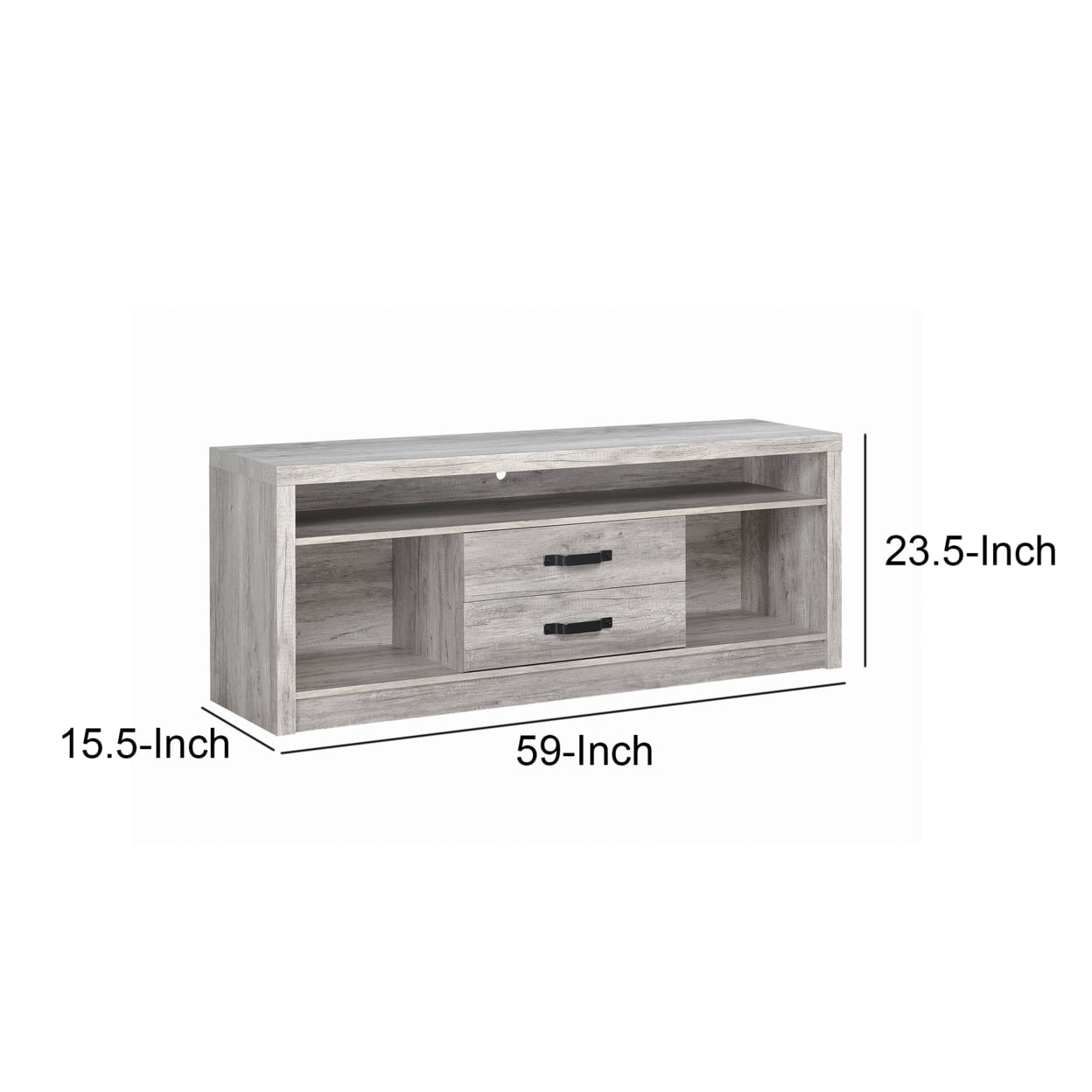 Fresh, airy styling invigorates a modern space. Keep an entertaining space contemporary and useful with this TV console. Linear design features a slender open top shelf, two open side cubbies, and a pair of slide-out drawers. Combine electronic devices, components, and media in one unit. A cool gray driftwood finish lightens any space. Features: Includes: One (1) TV console Finish: Grey Driftwood Hardware finish: Black Materials: MDF, Particle Board, Hollow Board, Engineered Veneer, honeycomb Features three (3) storage compartments and two (2) storage drawers Euro drawer glides Drawer structure: Front cam bolt with nut and back screw construction Hardware type: Pull handle Leveler/plastic glide: Plastic glide Max TV size: 65″ Max TV weight: 88 lbs Number of compartments: 3 Specifications: Product Dimensions: 23.5″H x 59″W x 15.5″D Product Weight: 84.7 lbs Number of Drawers: 2 Number of Shelves: 3 Assembly Required: Yes Warranty: One (1) year limited manufacturer warranty