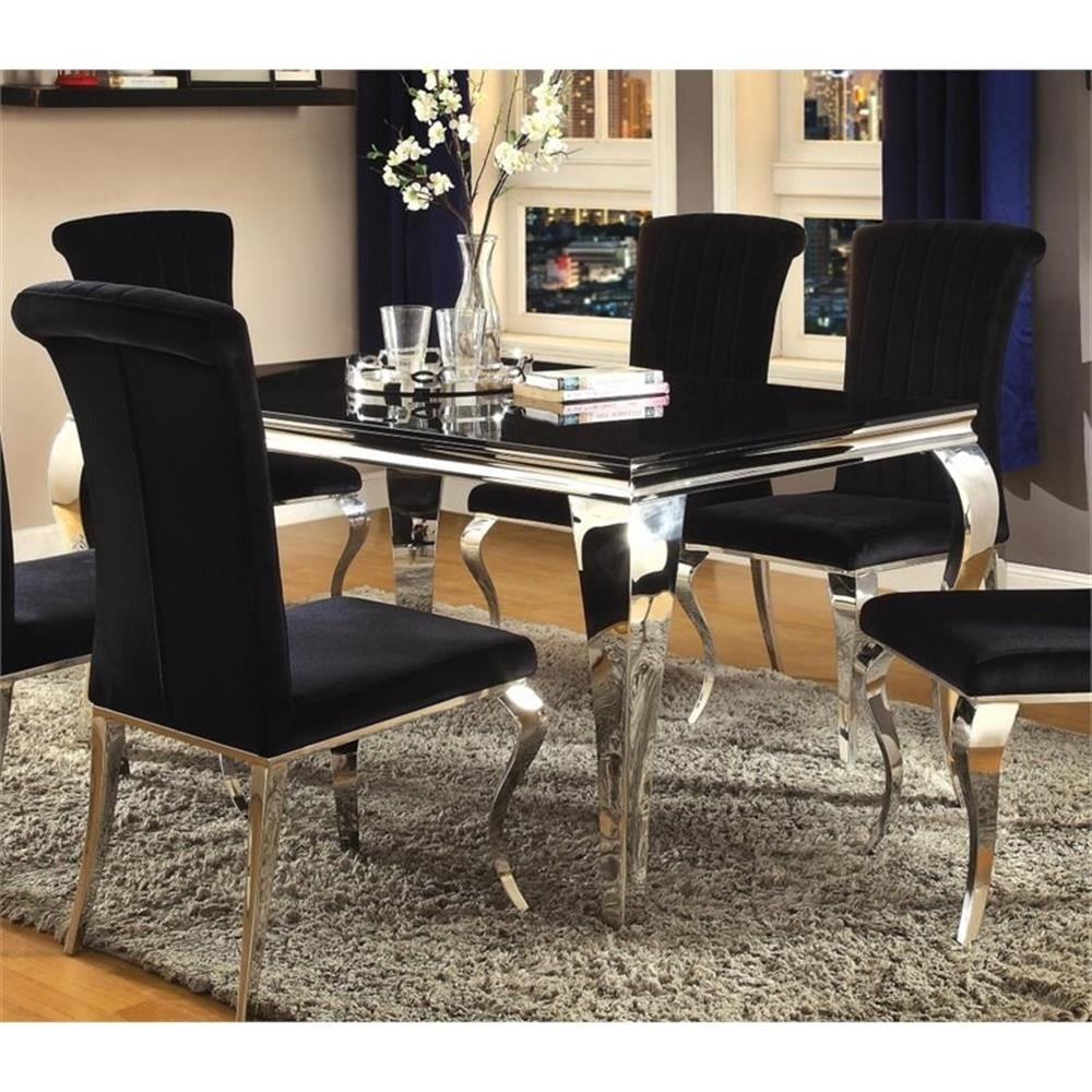 The Carone collection presents this dining room table that has a distinct modern design with touches of class and tradition. The table legs are made of stainless steel for panache. They are an eye-catching contrast to the table top with 12mm thick tempered glass, which also have beveled edges. The legs offer a curved appeal that’s as stylish as traditional. This table fits nicely in a formal dining room as host to many a holiday feast. Features: Include: One (1) table Finish: Black Leg finish: Chrome Materials: Metal, Stainless Steel, Tempered Glass The look of elite luxury is yours with our stunning dining collection Polished chrome finish table base features dramatically curved Cabriole legs topped with black tempered glass top Stainless steel provides a sturdy frame for this glamorous dining collection Measurement: Only black glass top – 0.5″H x 59.00″L x 35.50″W Floor to bottom apron size: 27″ Leveler/ plastic glide: Plastic glide Table top edge profile: Bevel edge 25mm Shape: Rectangular Specifications: Product Dimensions: 29.5″H x 61″L x 37″W Product Weight: 115.67 lbs Maximum Seating Capacity: 6 Assembly Required: Yes Warranty: One (1) year limited manufacturer warranty