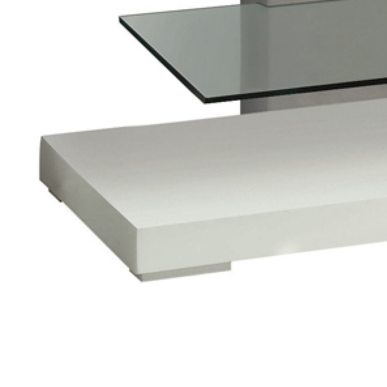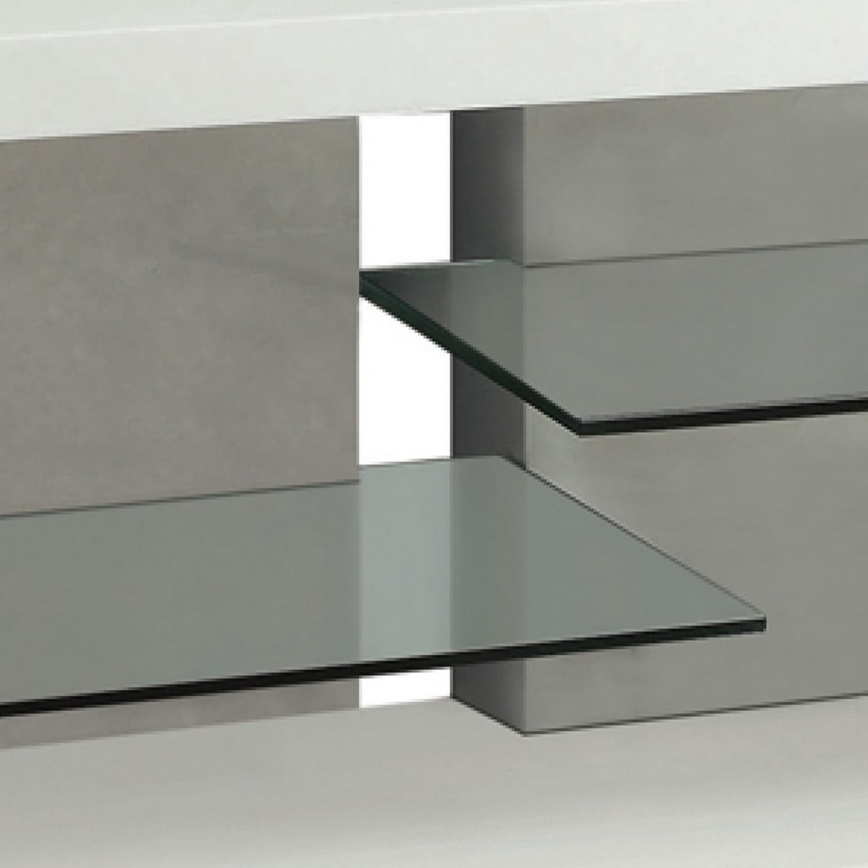 Invite sleek, modern elegance into your bedroom, living room, or anywhere you like to watch TV. With glossy white wood top in a contemporary design, this TV console is an excellent option for your home entertainment needs. Two sturdy glass shelves offer a convenient space to place video game systems, remote controls, or any other accessories you choose. A slotted back for wire management keeps things looking neat and uncluttered. Features: Includes: One (1) TV console Finish: Glossy White and Clear Materials: Glass, MDF Shelf position interchangeable Type of shelves: 2″thick tempered glass shelves Type of glass: 5 times stronger tempered Wire management access Leveler/plastic glide: Plastic glide Max TV size: 50″ Max TV weight: 110 lbs Number storage compartments: 4 Specifications: Product Dimensions: 20.5″H x 47″W x 15.75″D Product Weight: 71.06 lbs Number of Shelves: 2 Assembly Required: Yes Warranty: One (1) year limited manufacturer warranty
