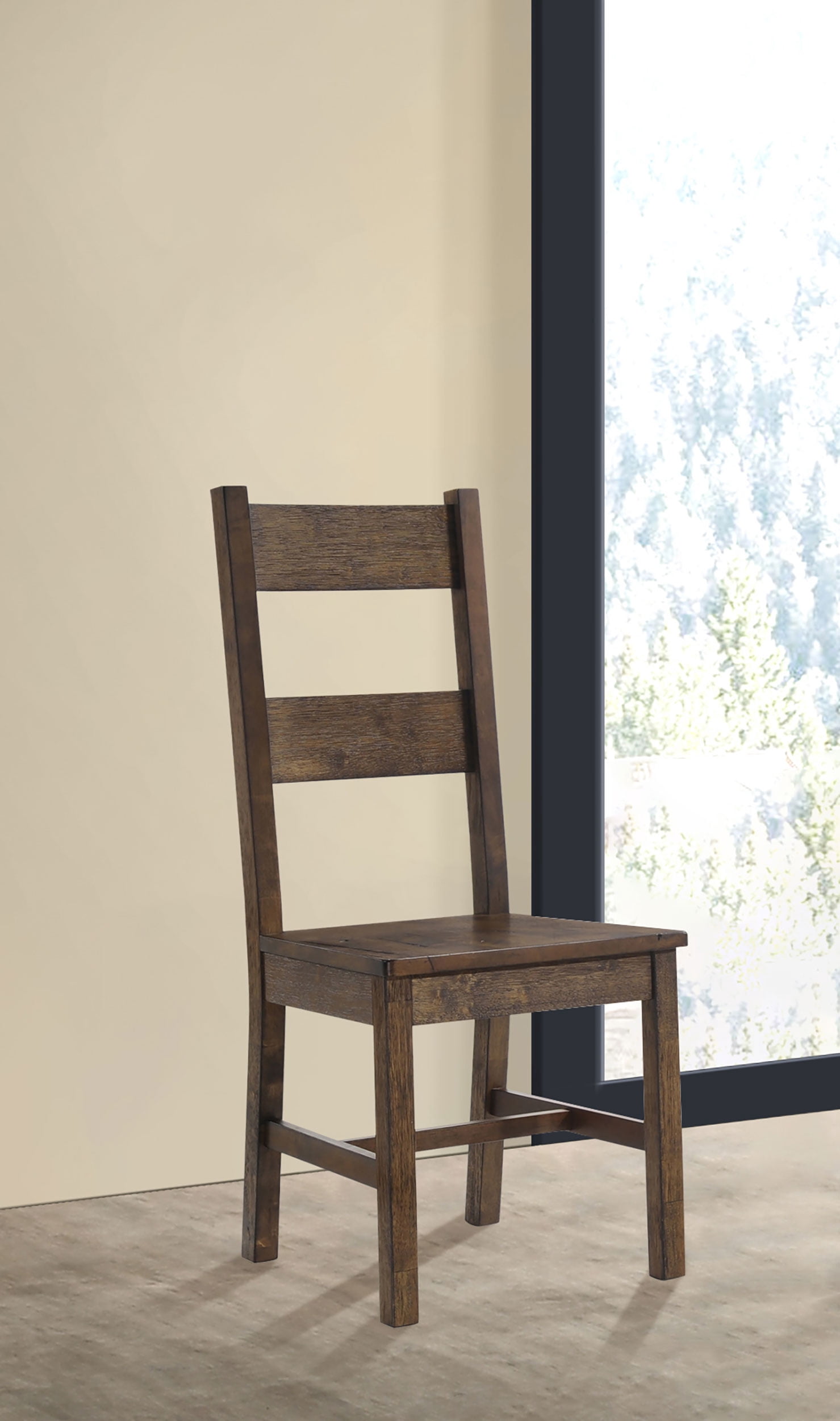 Includes: Two (2) dining chairs Finish: Rustic Golden Brown Materials: Asian Hardwood Solid Asian hardwood showcases various knots and grain details for a rustic country look Rustic golden brown finish adds country character with a reclaimed wood feel Classic farmhouse style with simple lines give a timeless handcrafted feel Ladder back chairs are updated with thick wide-set slats and a taller profile Seat construction: Seat frame Wood seat profile: Straight Leveler/ plastic glide: No Scoping seat: No