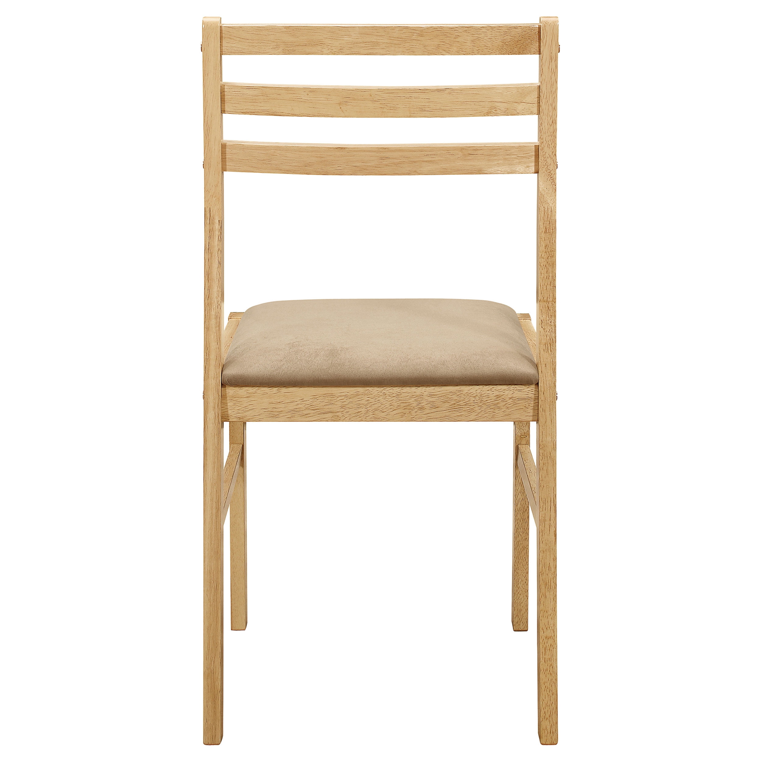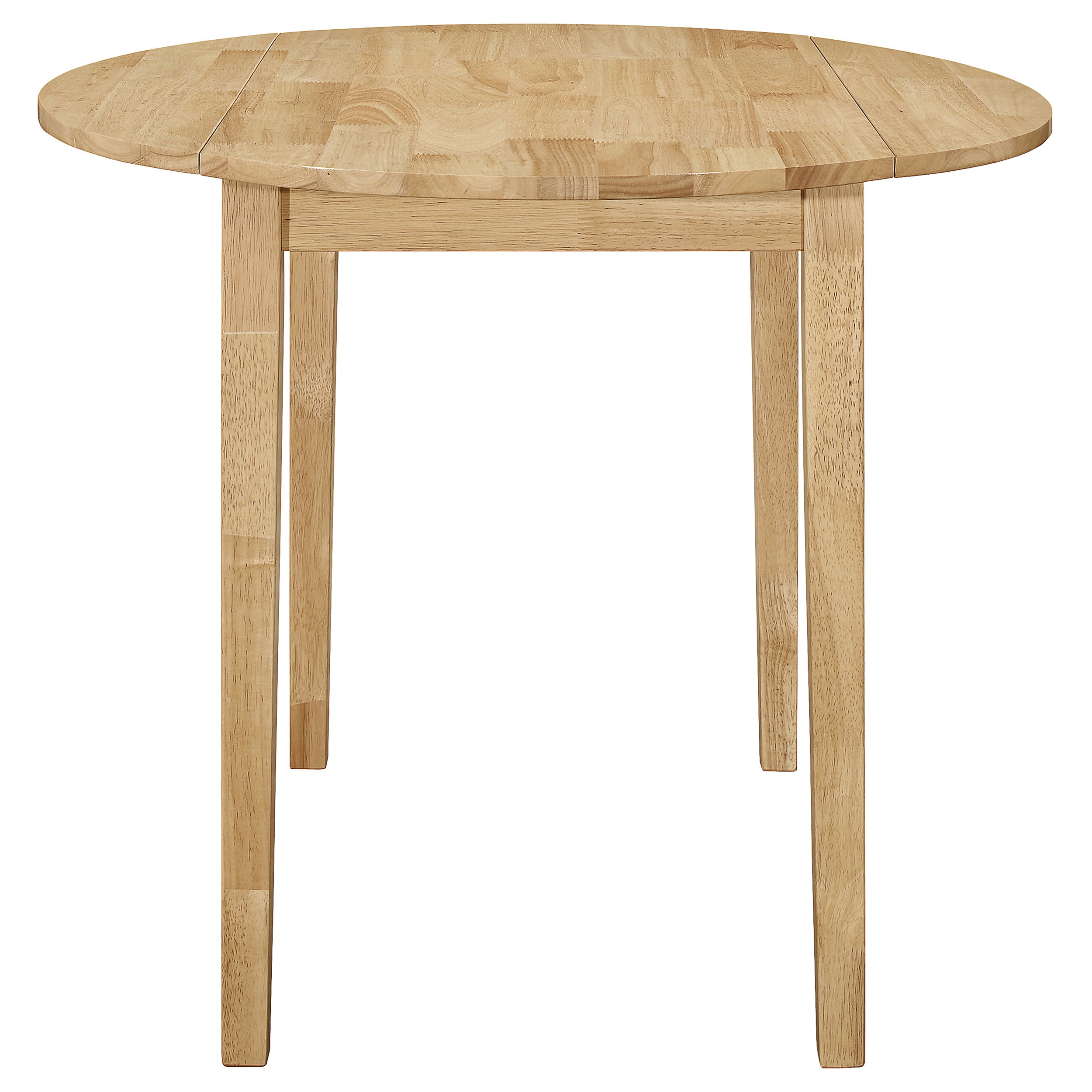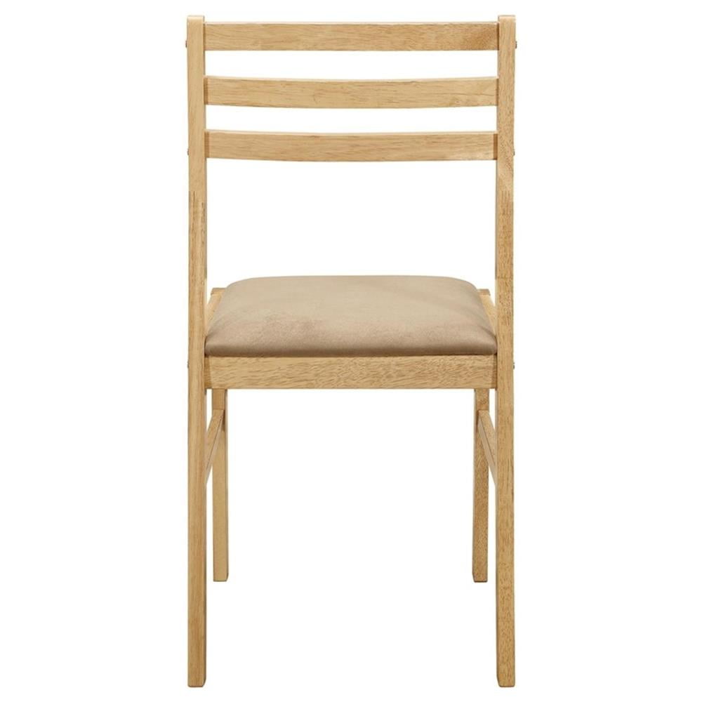 [Includes]: One (1) dining table and two (2) dining chairs [Color]: Natural and Tan [Materials]: Asian hardwood, Asian tropical wood, microfiber, foam [Description]: Perfect for a breakfast nook or small dining space [Chair Style]: Contemporary rendition of a ladder back style [Set Includes]: Table plus two chairs [Table Top]: 35″ dia with 7″ drop leaf each side [Table Leaf]: Drop down leaf [Seat Construction]: Side rail [Table Top Edge]: True square [Pattern]: Seat cushion and wood design on seat back [Table Glides]: Drop leaf support