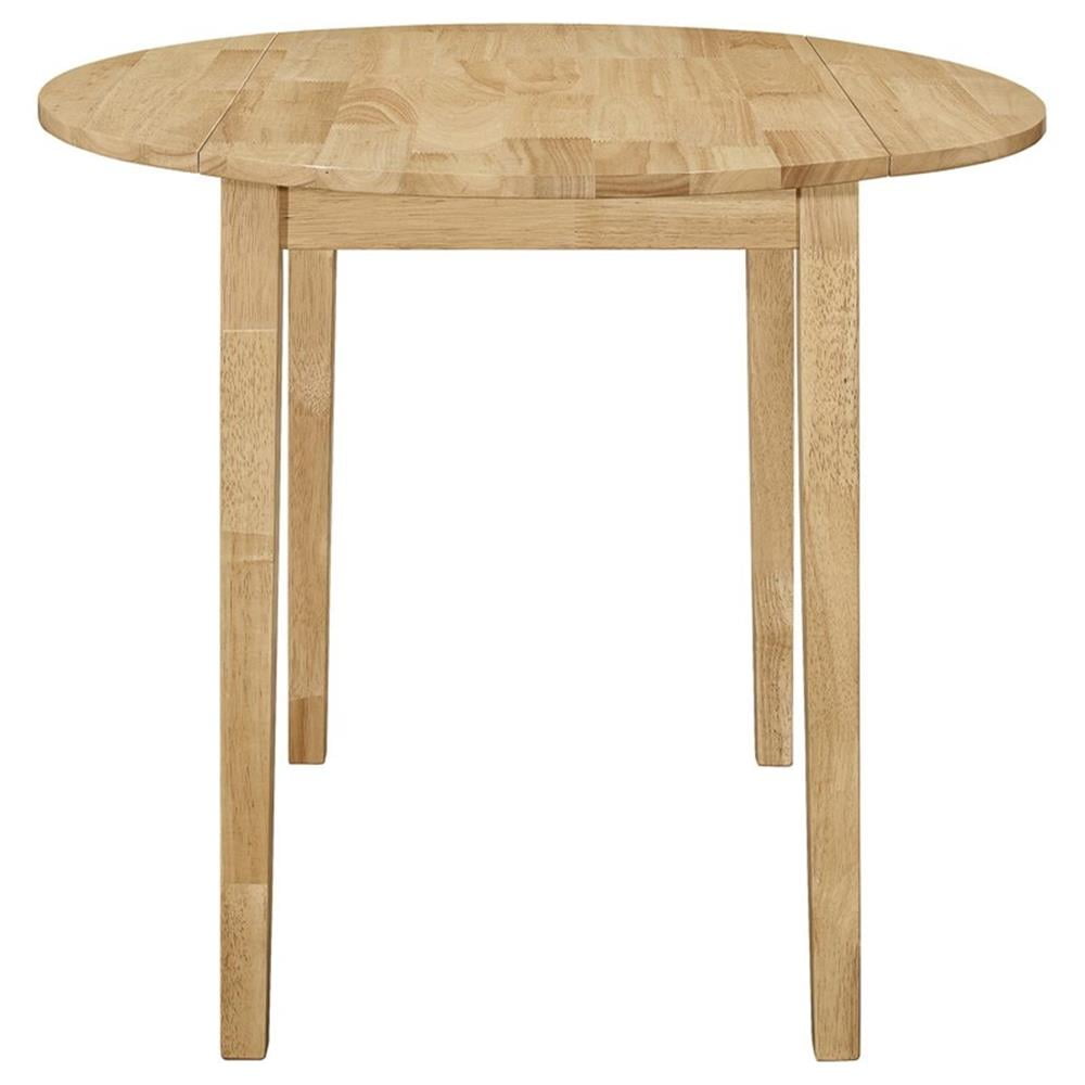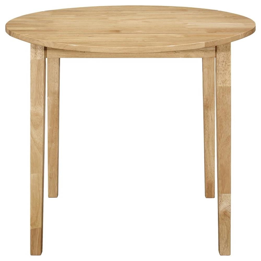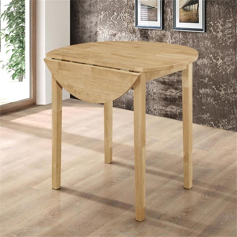 This lovely dining set lends an elegant touch of simple sophistication to a kitchen or breakfast nook. It comes complete with a lovely, round dining table and two comfy chairs upholstered in soft, light brown, padded fabric. The table is enhanced by a versatile drop-down extension which can be raised to accommodate an elaborate dining setup. Lowering it allows you to cozy up closely with a special someone over a leisurely breakfast or romantic, candlelit meal. Features: [Includes]: One (1) dining table and two (2) dining chairs [Color]: Natural and Tan [Materials]: Asian hardwood, Asian tropical wood, microfiber, foam [Description]: Perfect for a breakfast nook or small dining space [Chair Style]: Contemporary rendition of a ladder back style [Set Includes]: Table plus two chairs [Table Top]: 35″ dia with 7″ drop leaf each side [Table Leaf]: Drop down leaf [Seat Construction]: Side rail [Table Top Edge]: True square [Pattern]: Seat cushion and wood design on seat back [Table Glides]: Drop leaf support Specifications: Number of Pieces: 3 Table Dimensions: 30″ H x 21.5-35″ W x 35″ D Stool Dimensions: 32.5″ H x 15.75″ W x 17.5″ D Product Weight: Table – 29.77 lbs Product Weight: Stool – 7.72 lbs Seat Dimensions: 18″ H x 15″ D Maximum Seating Capacity: Table can fit 2 seats Assembly Required: Yes Warranty: One (1) year limited manufacturer warranty