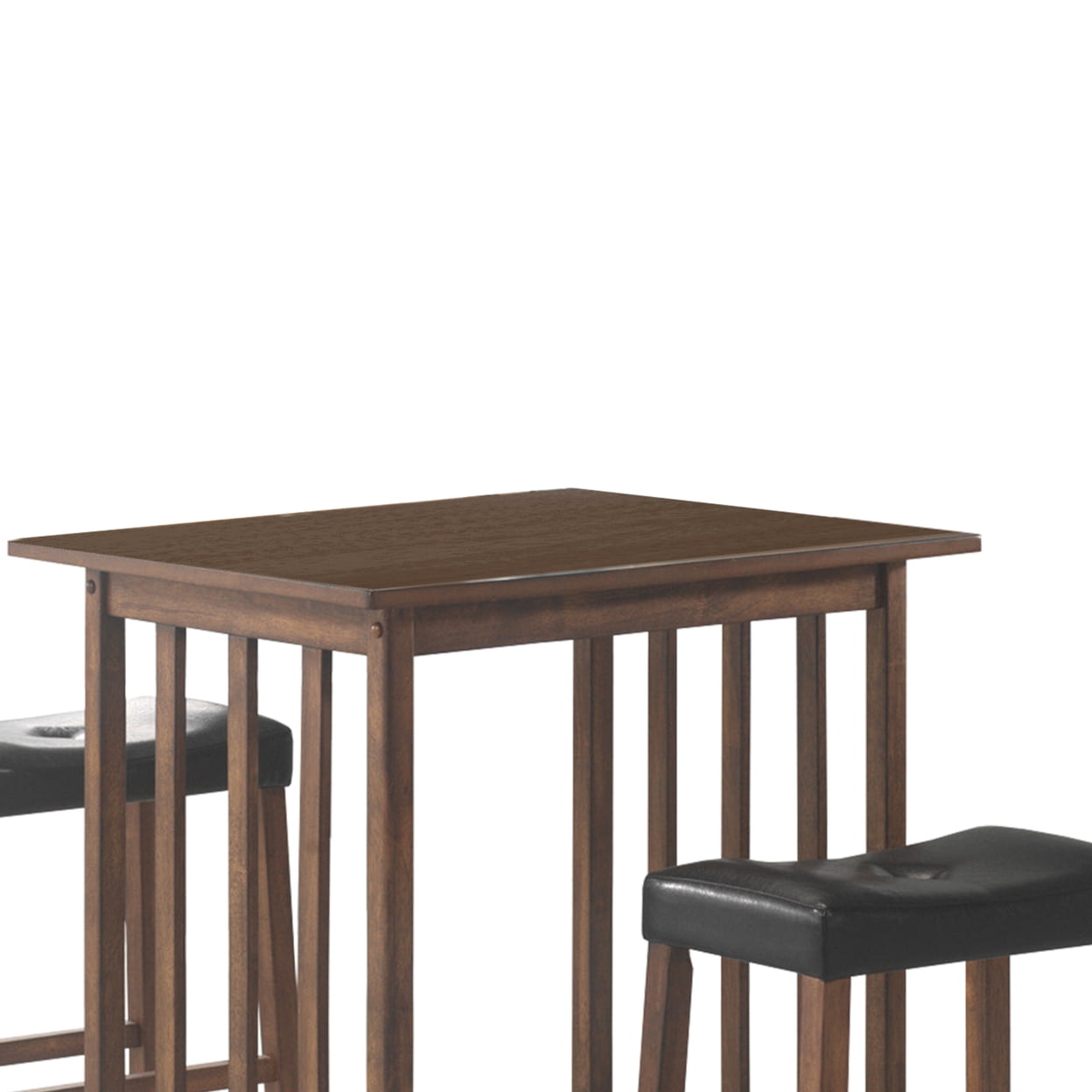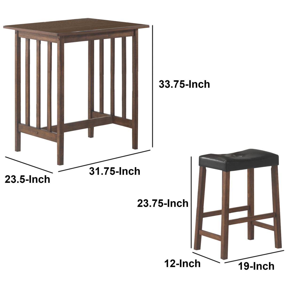 Perfect for small spaces, this counter height bar table Includes two bar stools. In a warm nut brown hue, the sleek lines are given texture. Featuring a slightly exposed wood grain, create a beautiful visual in any kitchen nook or transitional area. The bar stools feature an upholstered and plush seat made of black leatherette fabric. Sophisticated and elegant, the seats feature a stylish button tufting. Item Contents: Includes: One (1) counter height table and two (2) counter stoolsItem Bullets: Mission style pub set in nut brown finish Perfect for small spaces Backless stools have a button tufted cushioned seat in black leatheretteMaterials: Materials: Asian hardwood, Asian tropical wood, leatherette, MDF, foam, rubberwood veneerFeatures: Main Finish: Brown Cleaning Code: W Weight Limit Overall: 300lbs Assembly Type: Full Assembly RequiredDimensions: Counter height table dimensions: 31.75 inches wide x 23.5 inches deep x 33.75 inches high Counter stool dimensions: 19 inches wide x 12 inches deep x 24 inches high Counter stool seat dimensions: 17.25 inches wide x 24 inches deep x 24 inches highAccessories pictured are NOT included.