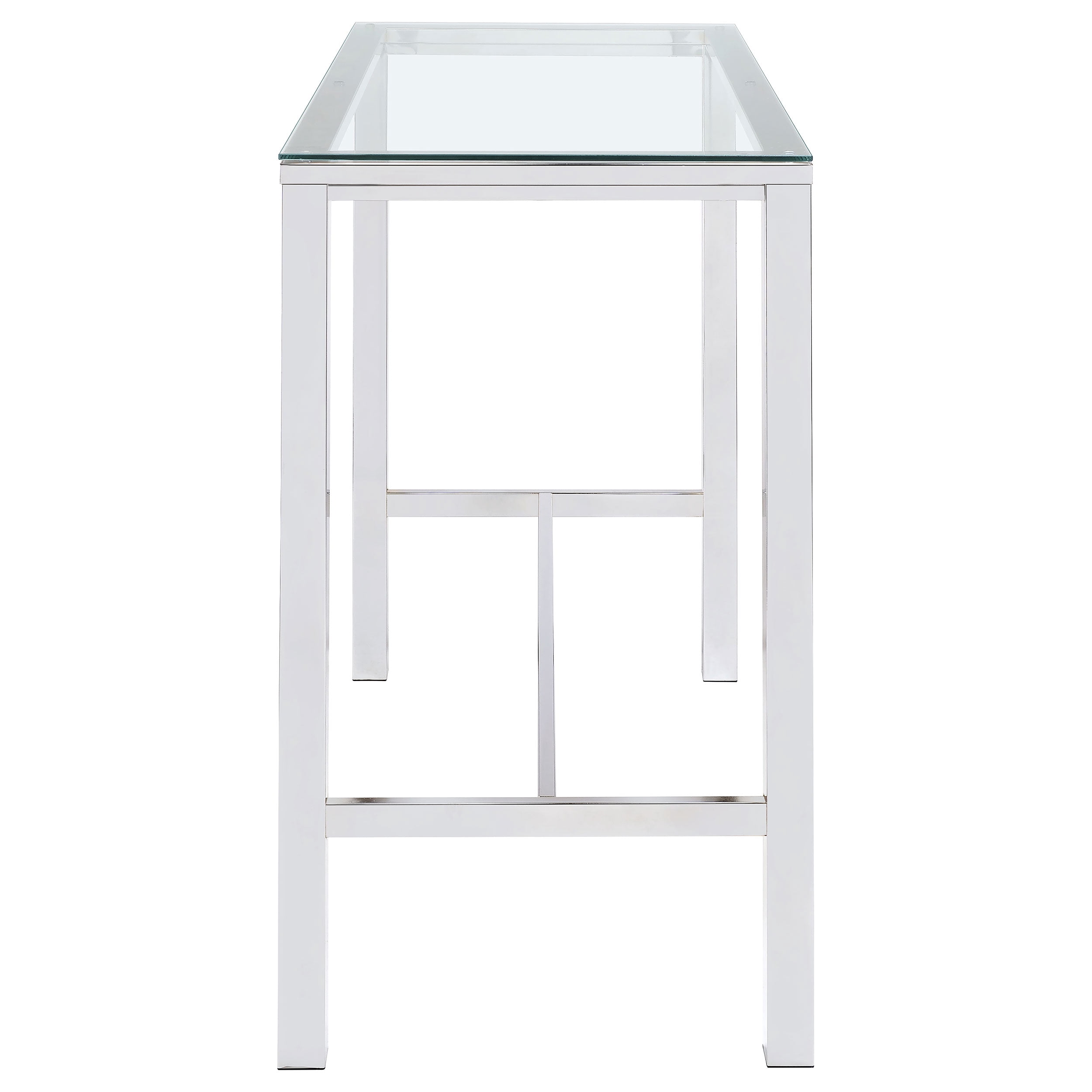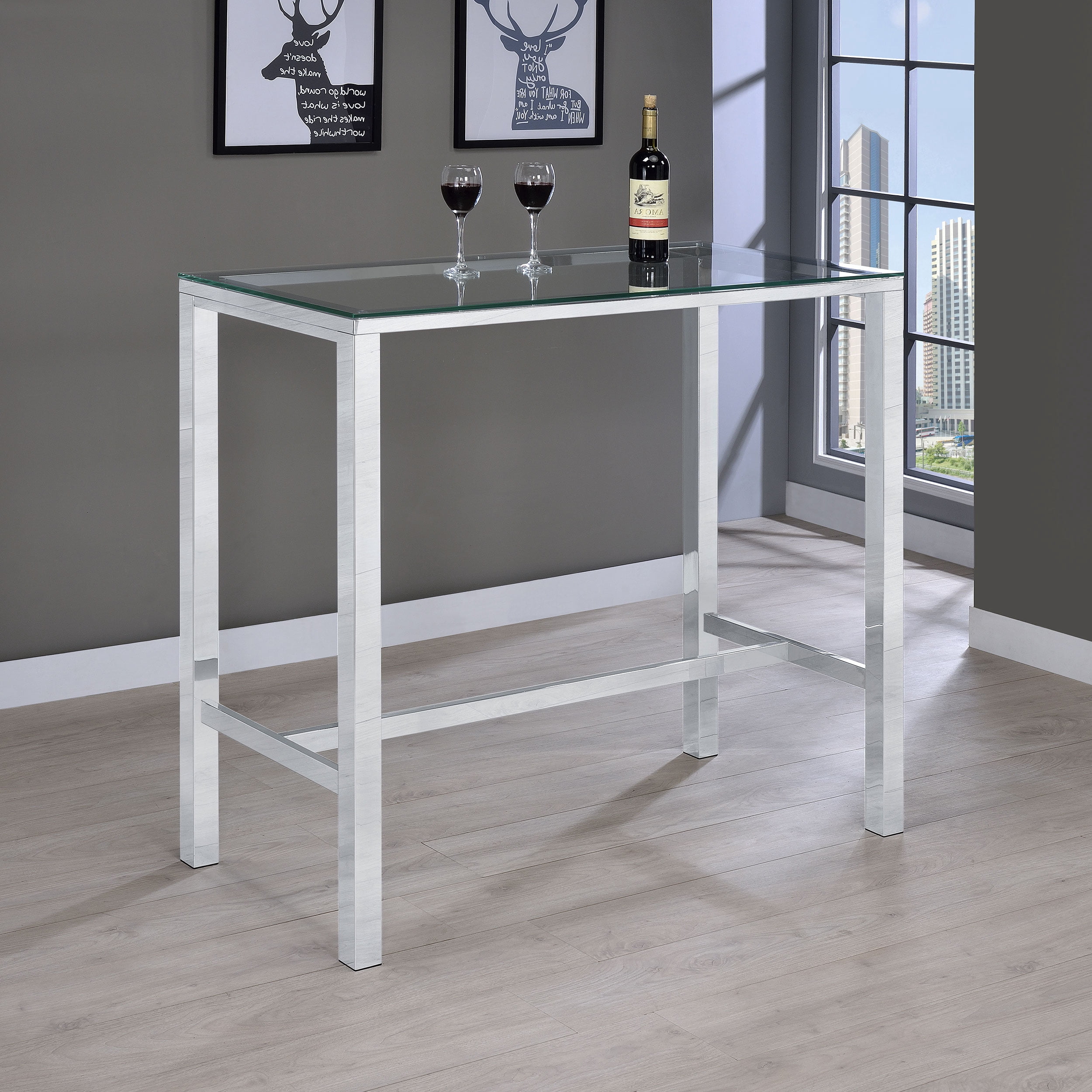 Coaster Company Contemporary Glass Pub Table, Chrome Set includes: One (1) bar table Contemporary rectangular metal bar set electroplated in chrome Clear tempered glass tabletop for a sleek look Tabletop thickness: 8mm clear tempered glass Leveler/plastic glide for stability Shape: Rectangular for versatile placement Assembly required for easy setup